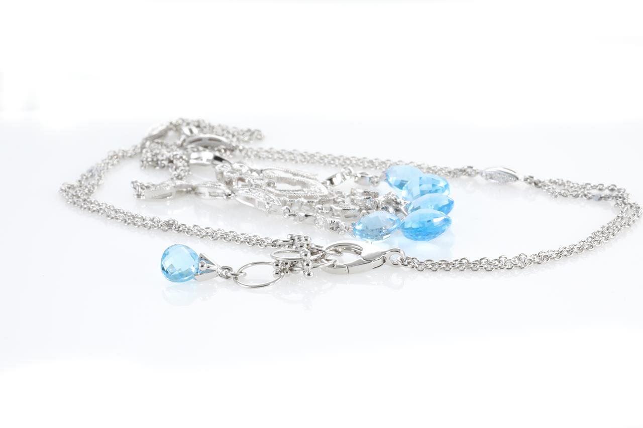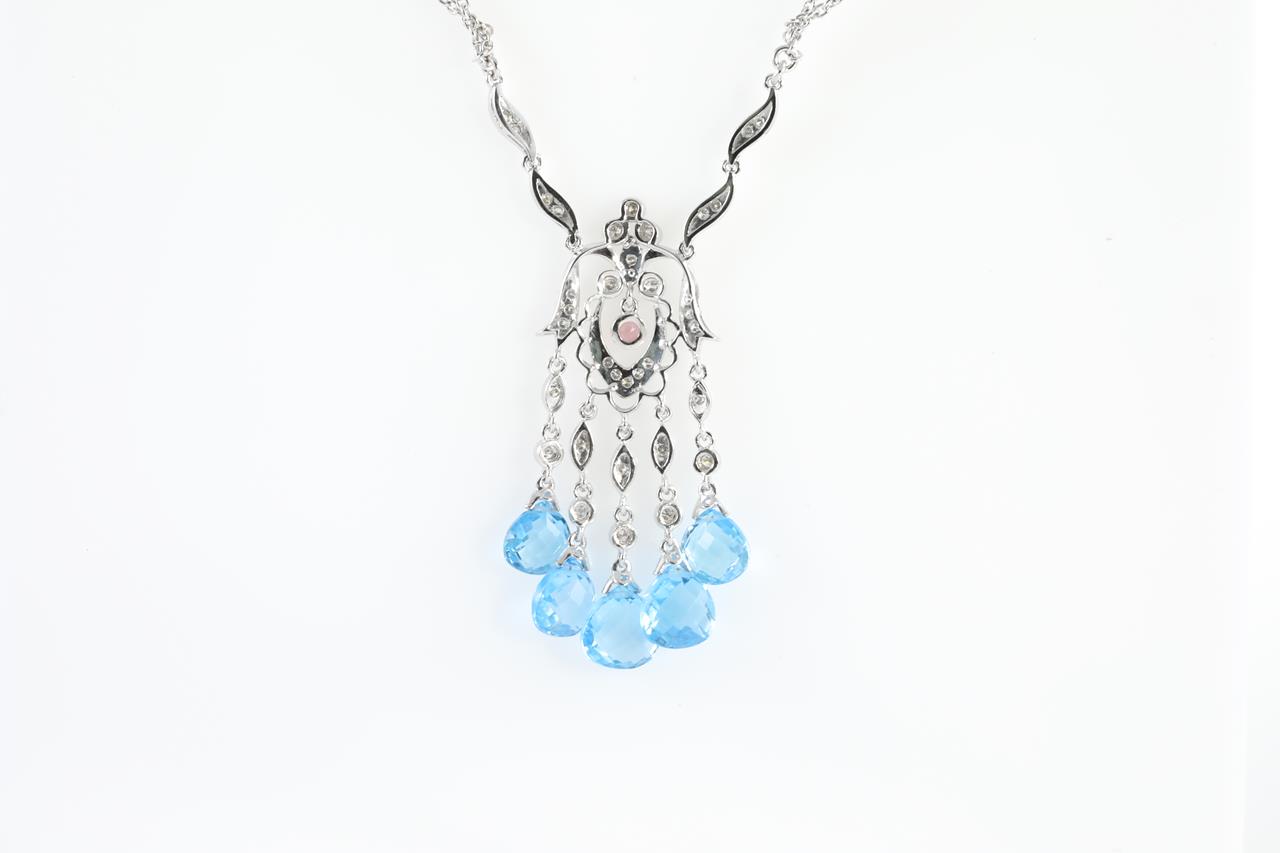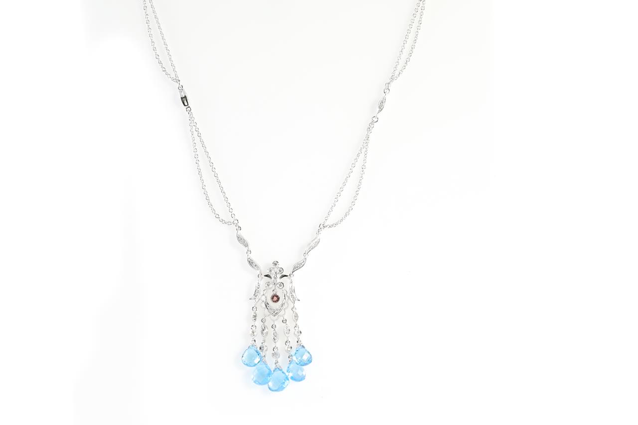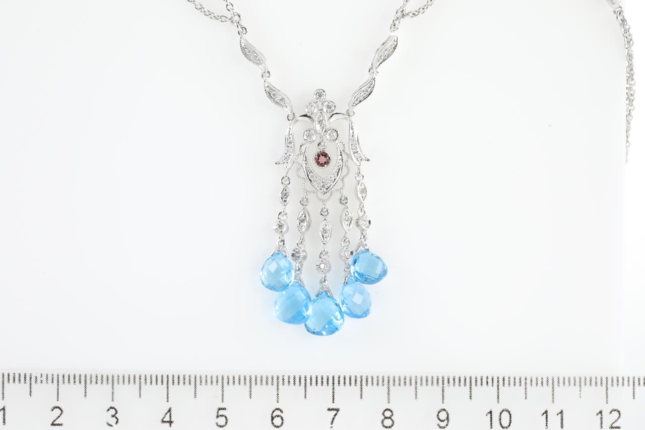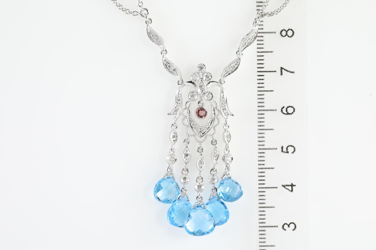 Topaz, Pink Tourmaline and Diamond pendant with briolette cut Topaz and Diamonds totalling 0.34cts (Estimated grading: H SI). 18ct white gold with 18ct white gold 40cm chain. Weight: 14.1g (Pre-owned)
