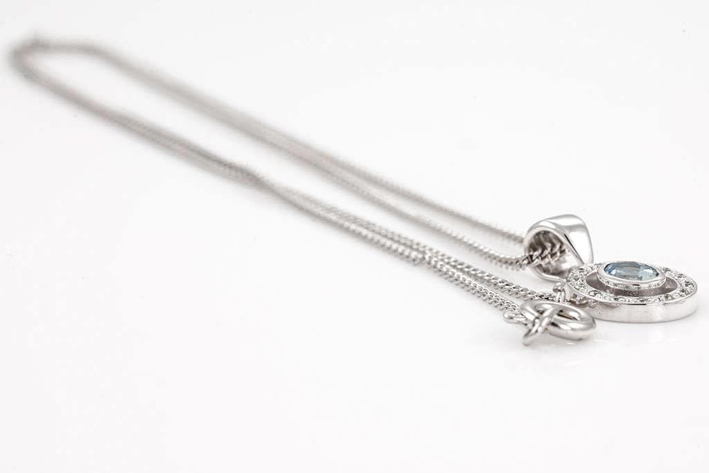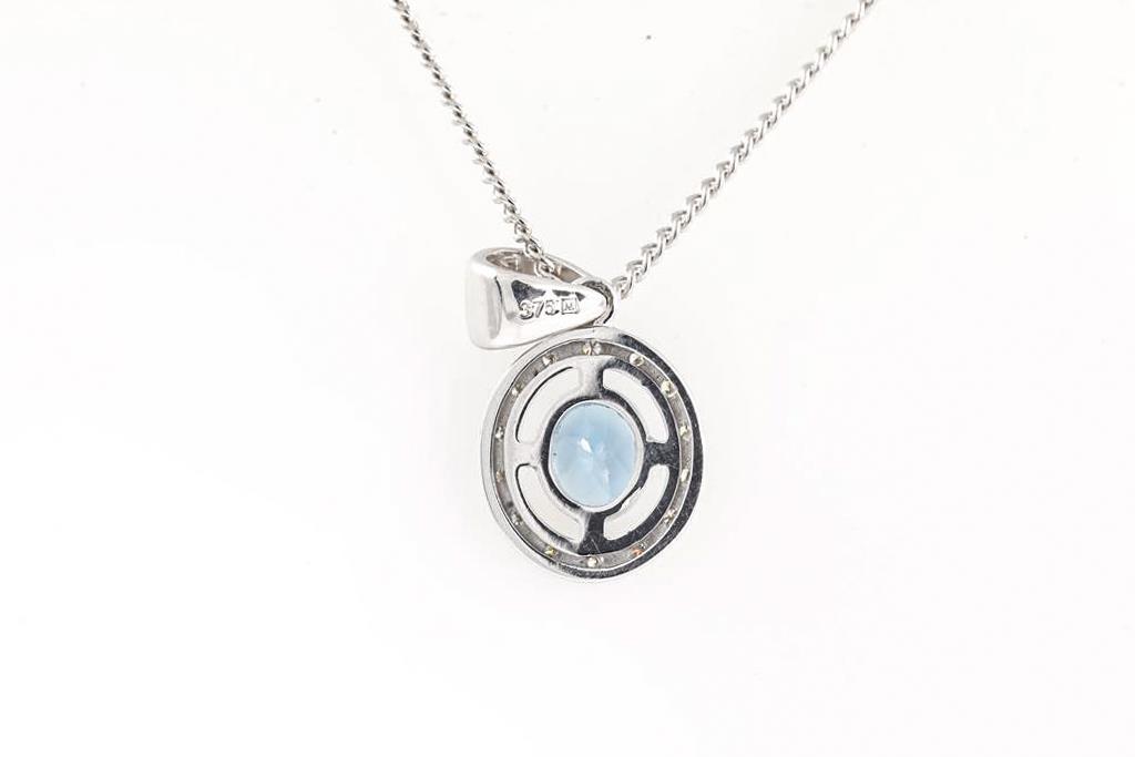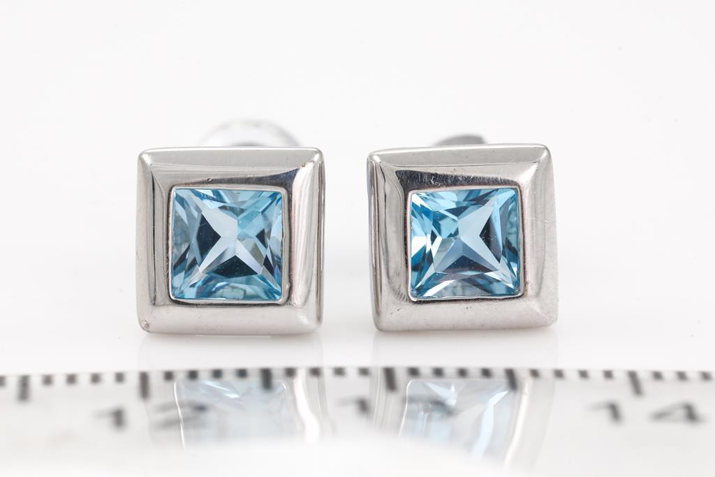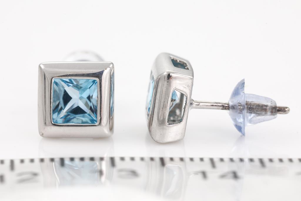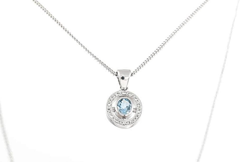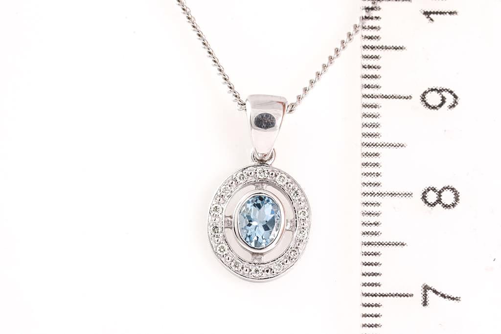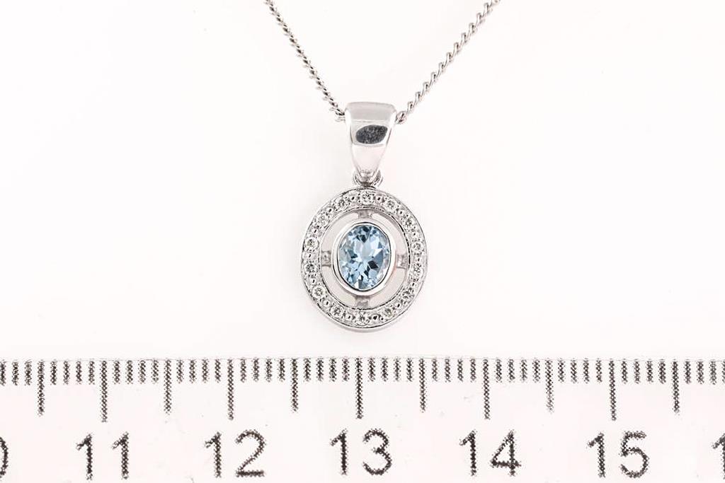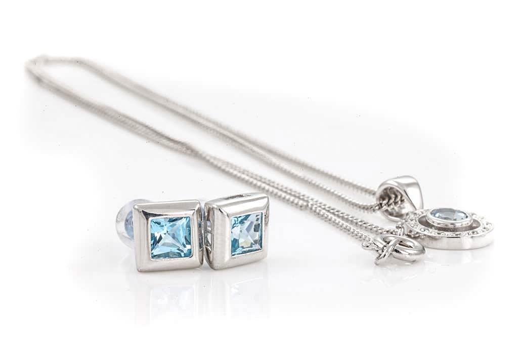 Topaz and Diamond stud earrings with square cut blue Topaz totalling approximately 1.12cts. 9ct white gold. Weight 1.8g. With a quartz and Diamond Pendant with round Diamonds totalling approximately 0.14cts. 9ct white gold. Weight 1.6g. Display chain (base metal). (As New)