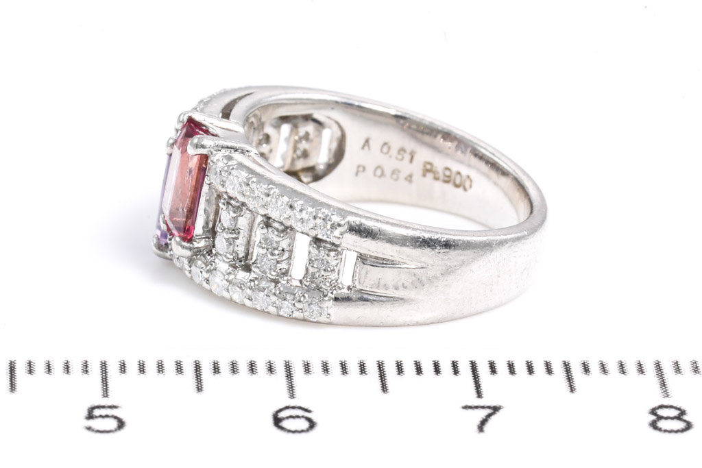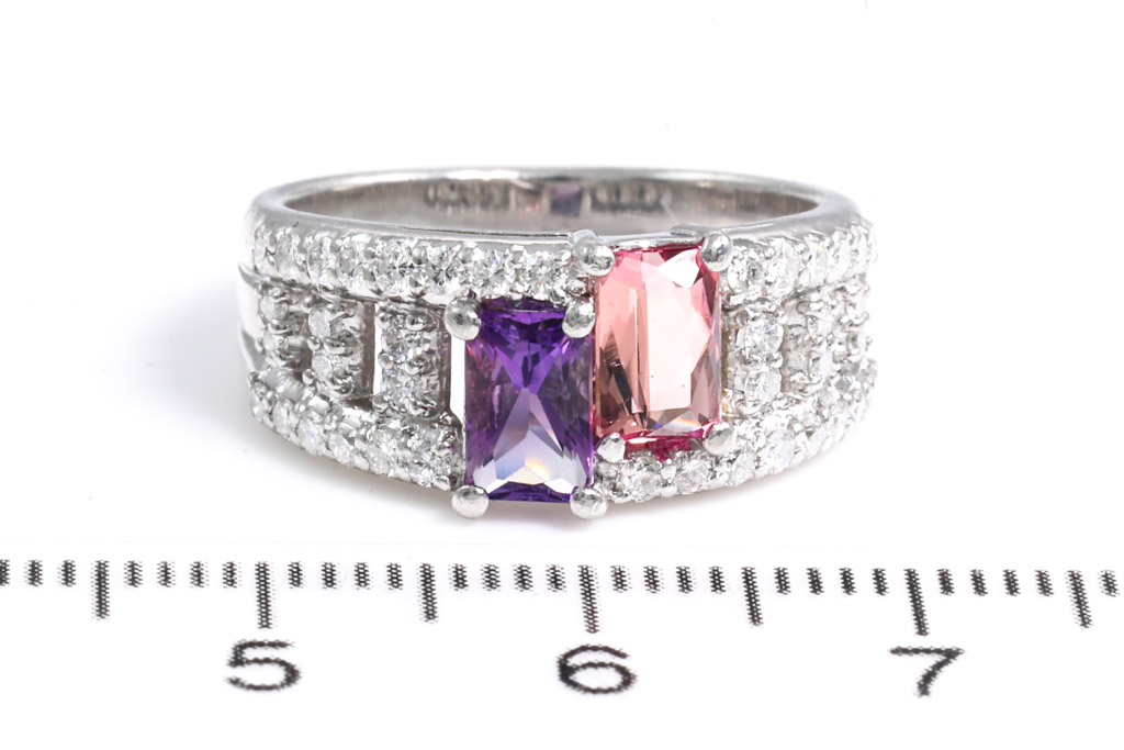 Tourmaline, Amethyst and Diamond ring with baguette cut pink Tourmaline of 0.64ct, baguette cut Amethyst of 0.51ct and round Diamonds totalling 0.50cts (Estimated grading: G SI). Platinum. Ring size K1/2 - ring resizing is not recommended. Weight: 9.5g. (Pre-owned)