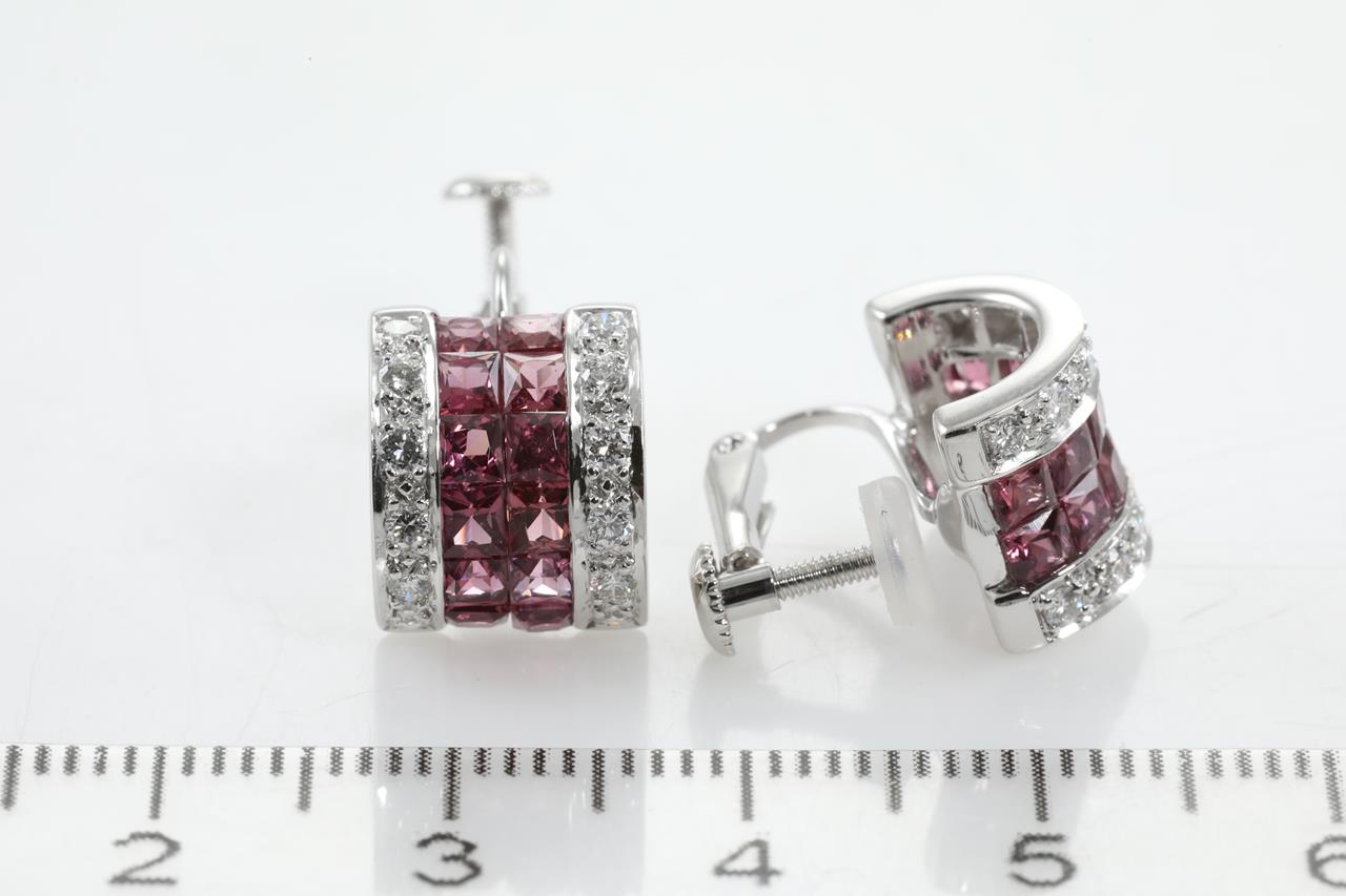 Tourmaline and Diamond hinged back earrings (clip on) with square cut pink Tourmalines totalling 2.60cts and Diamonds totalling 0.40cts (Estimated grading: G-H VS). 18ct and 14ct white gold. (Pre-owned)