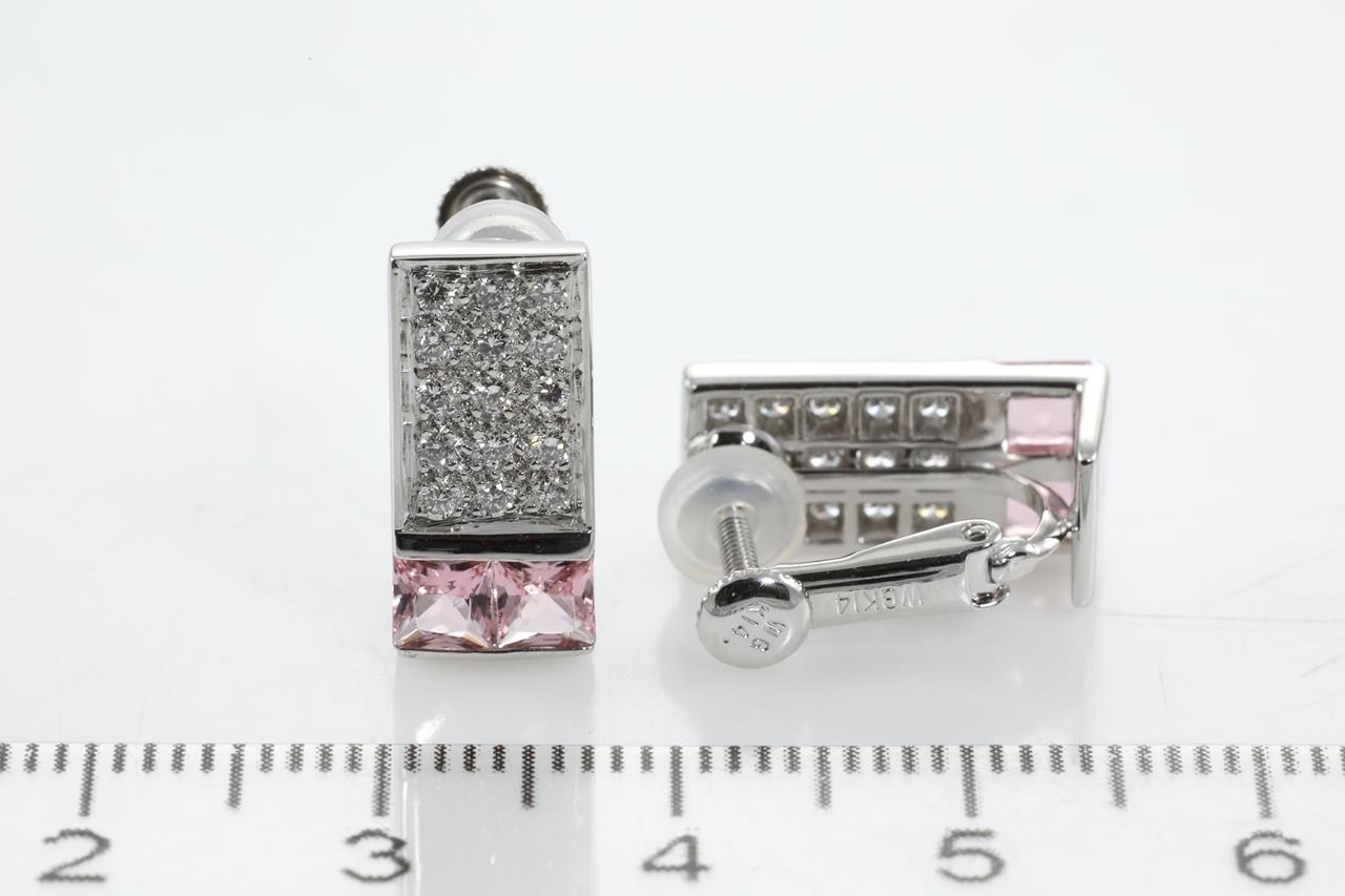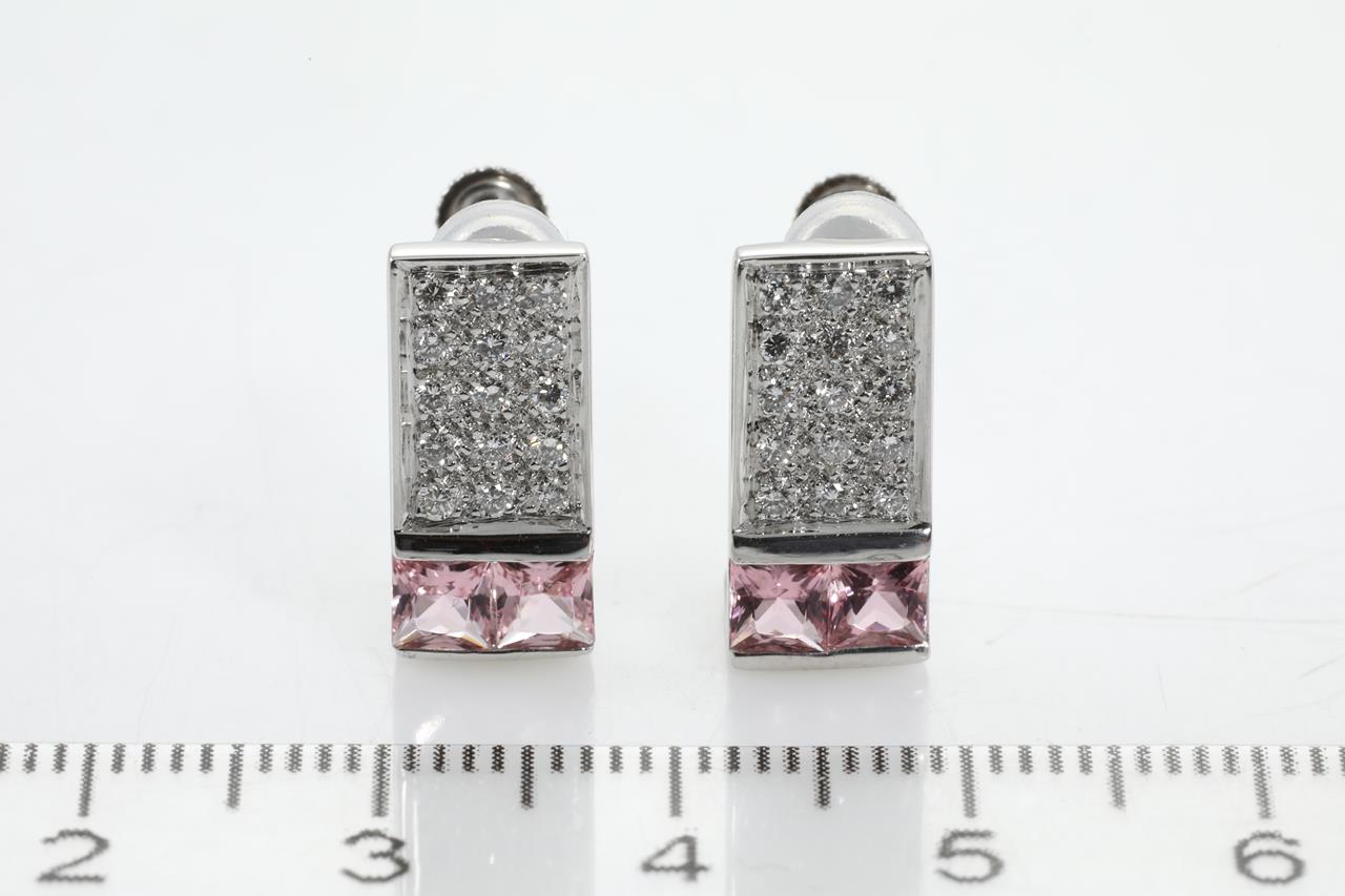 Tourmaline and Diamond hinged back clip-on earrings with square cut pink Tourmalines and Diamonds totalling 0.30cts (Estimated grading: G-H SI). 18ct and 14ct white gold. Weight: 6.9g. (Pre-owned)