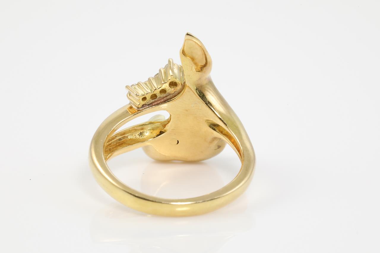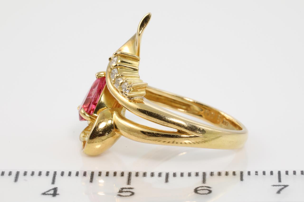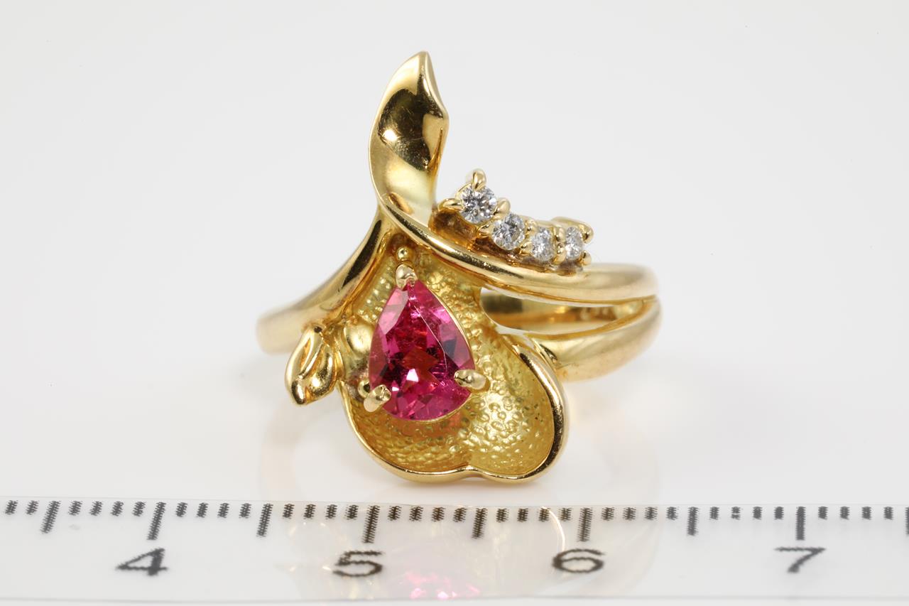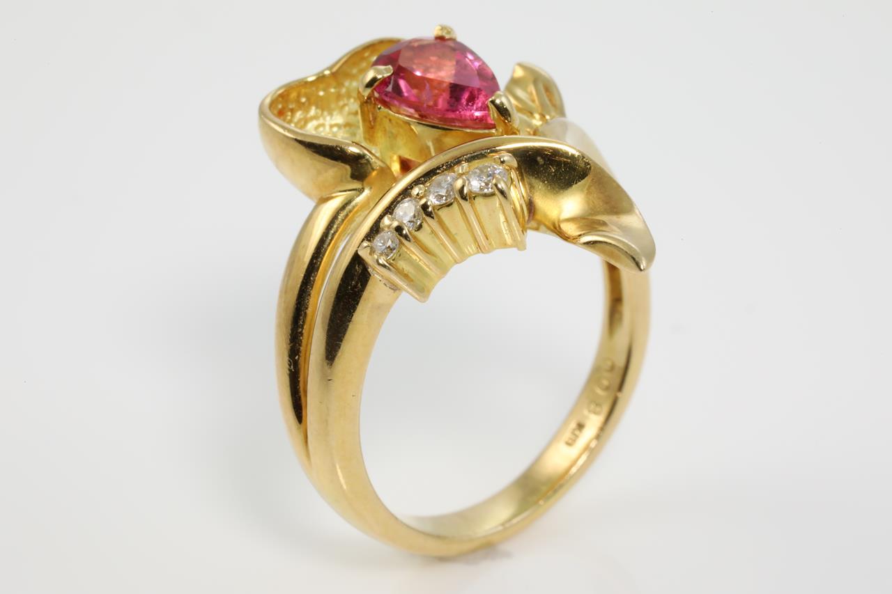 Tourmaline and Diamond ring with pear shape tourmaline of 0.67ct and Diamonds totalling 0.08cts. 18ct yellow gold. Ring size K1/2. Weight: 7.2g (Pre-owned)