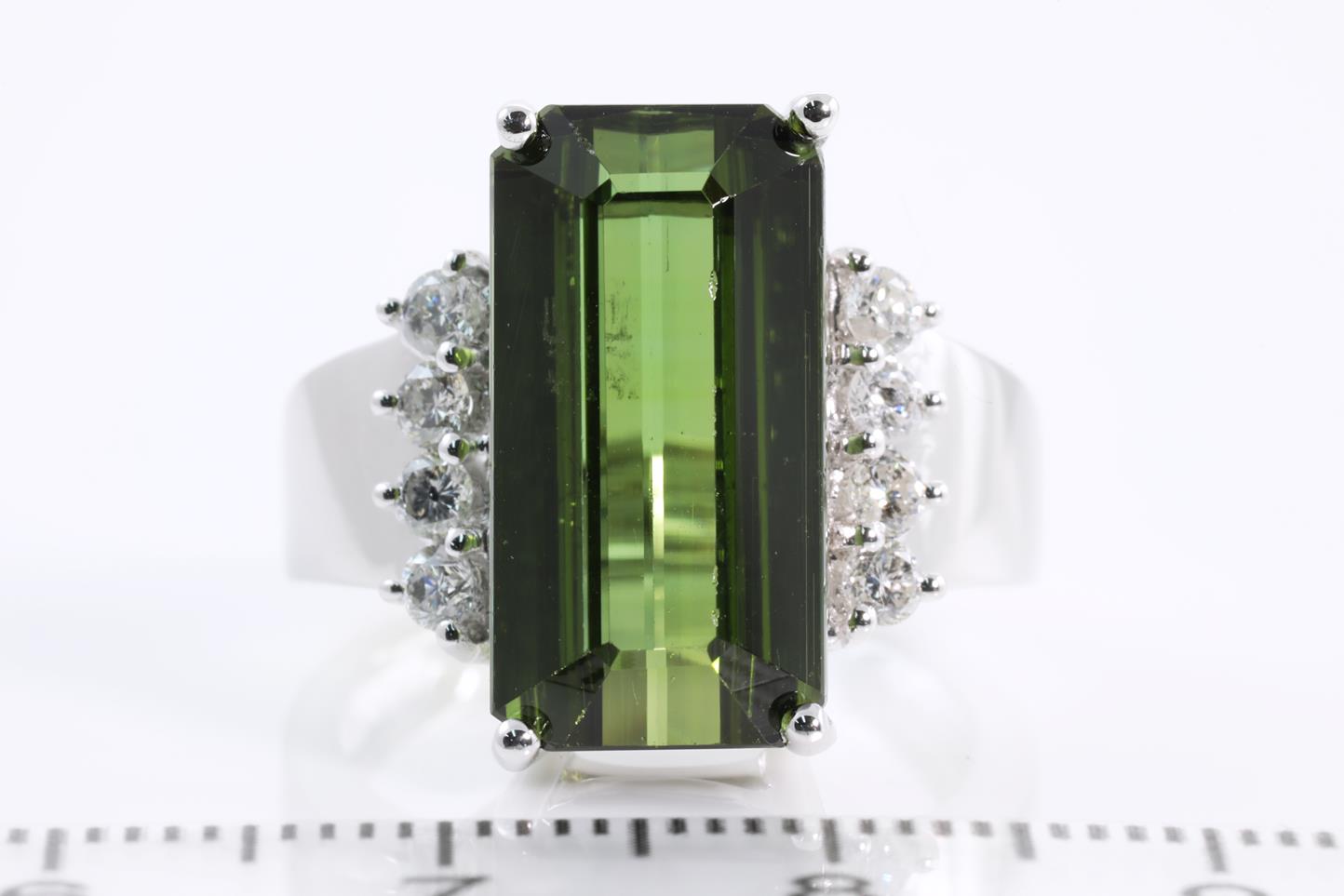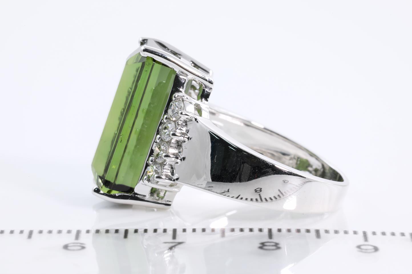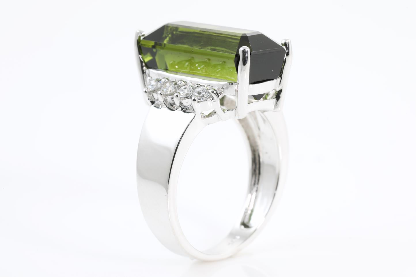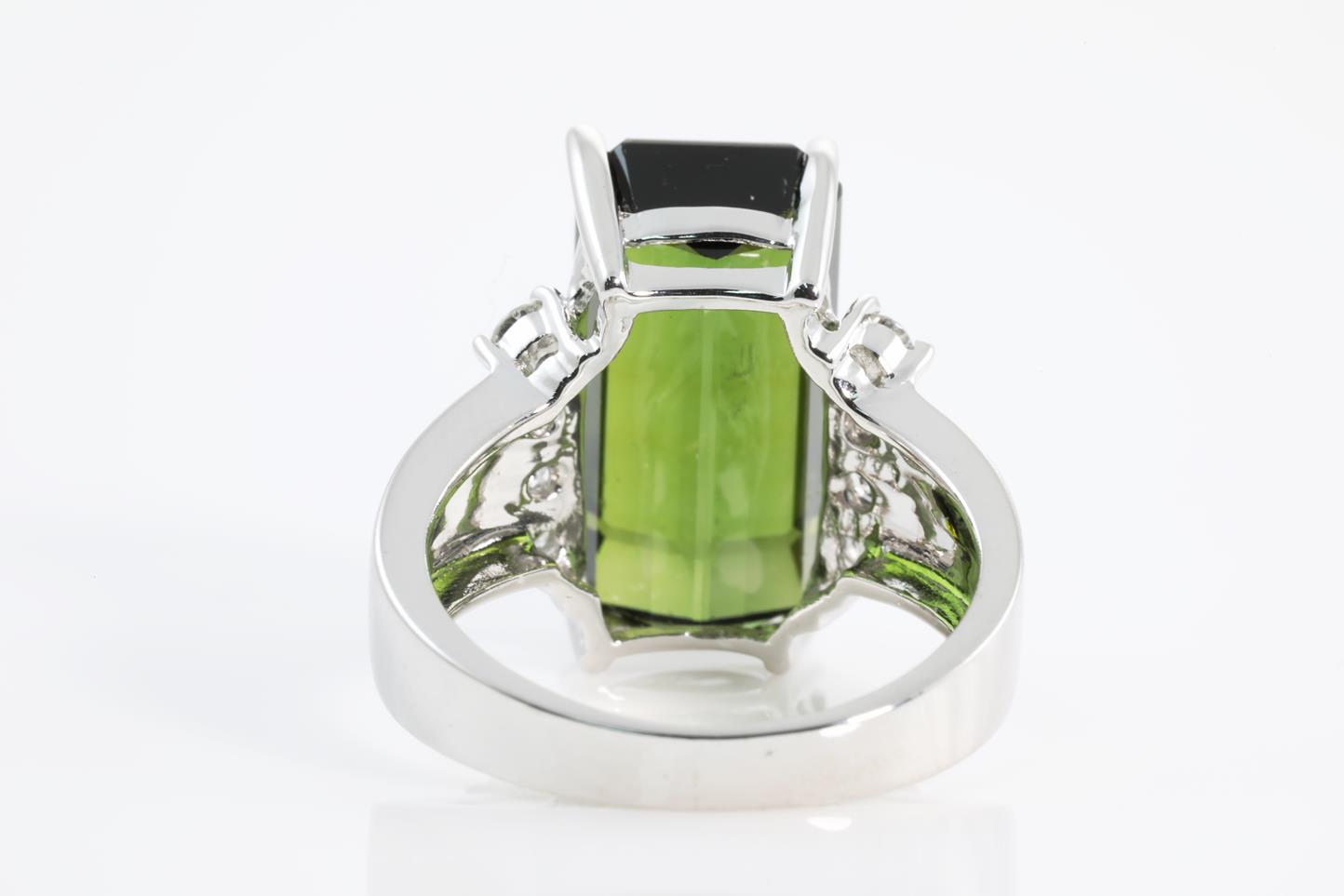Tourmaline and Diamond ring with emerald cut green Tourmaline of approximately 10.50ct and round Diamonds totalling 0.32cts (Estimated Grading: G P1). 14ct white gold. Ring size: N1/2. Weight: 7.3g. (Pre-owned)