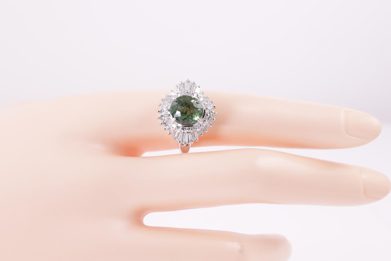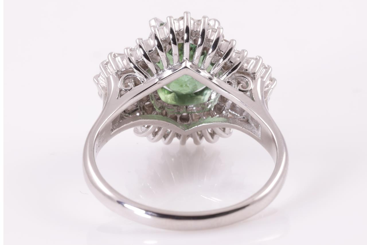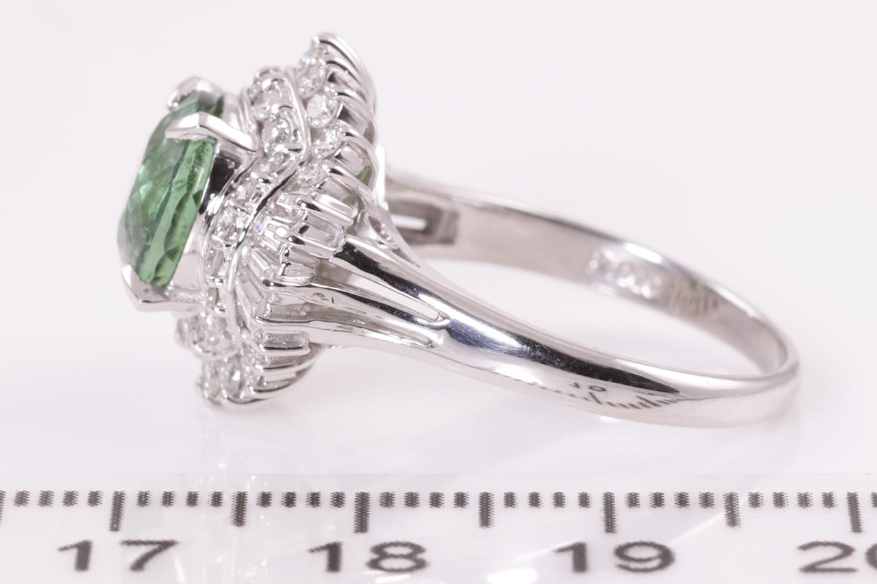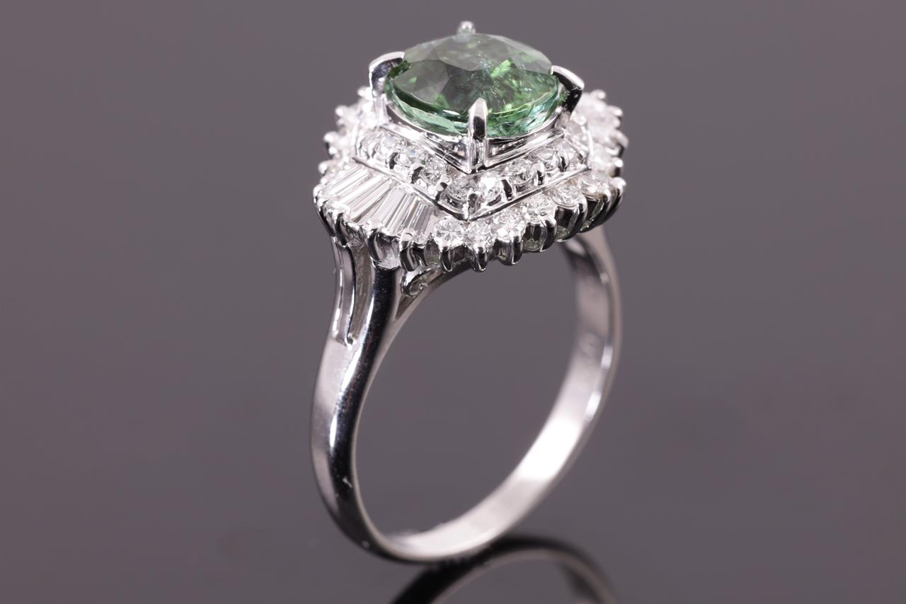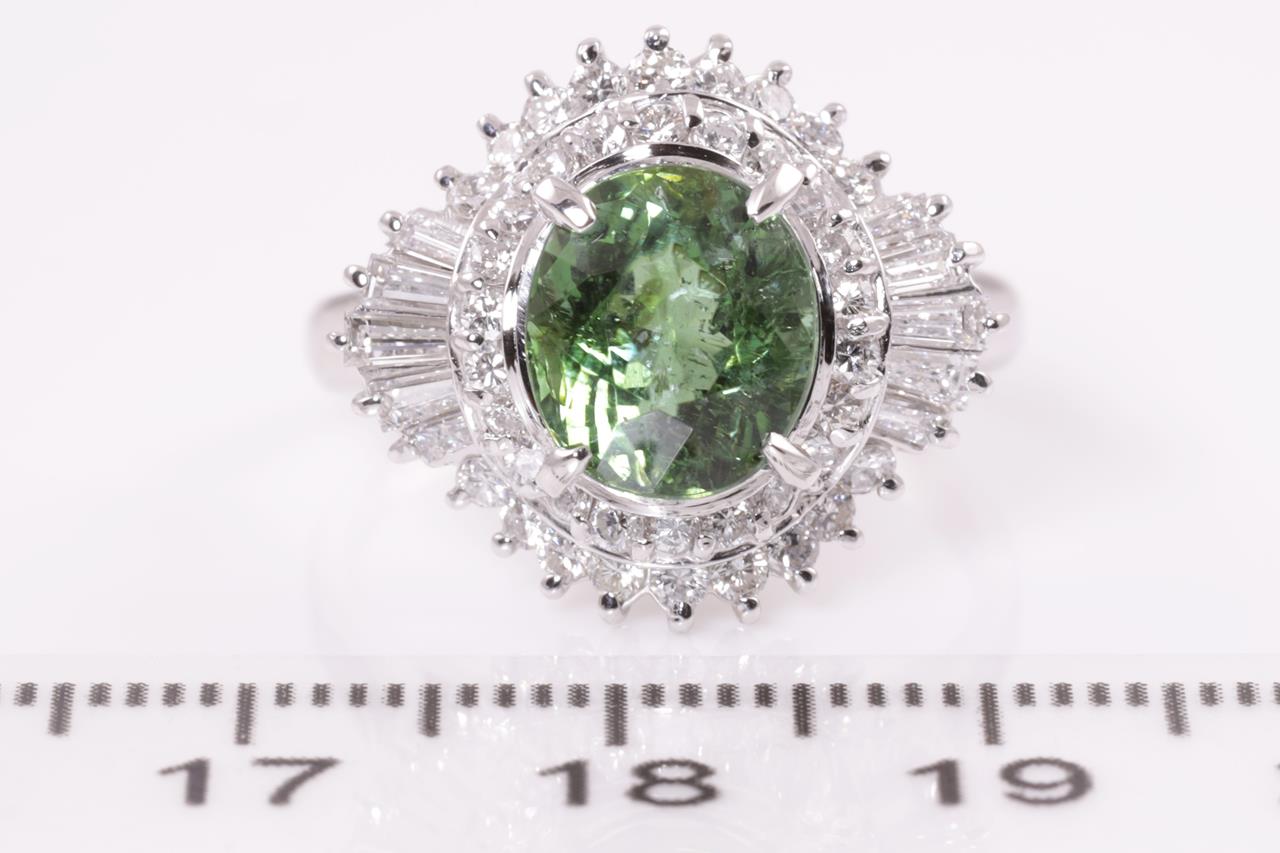 Tourmaline and Diamond Ring with an oval shape green Tourmaline of 2.98ct with baguette cut and round Diamonds totalling 0.99cts (Estimated grading: H-I VS-SI). Platinum. Ring size O1/2. Weight: 9.5g (Pre-owned)