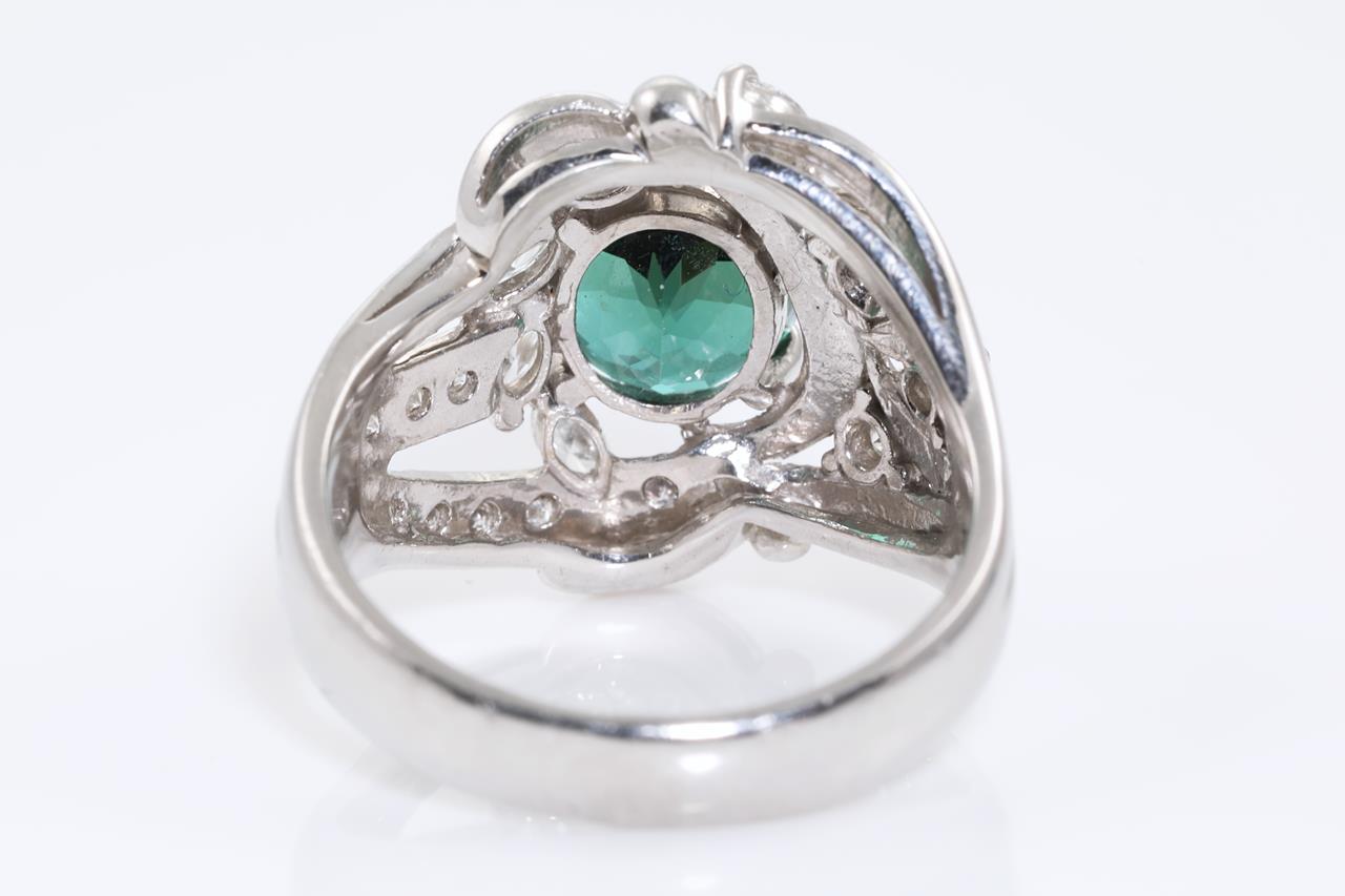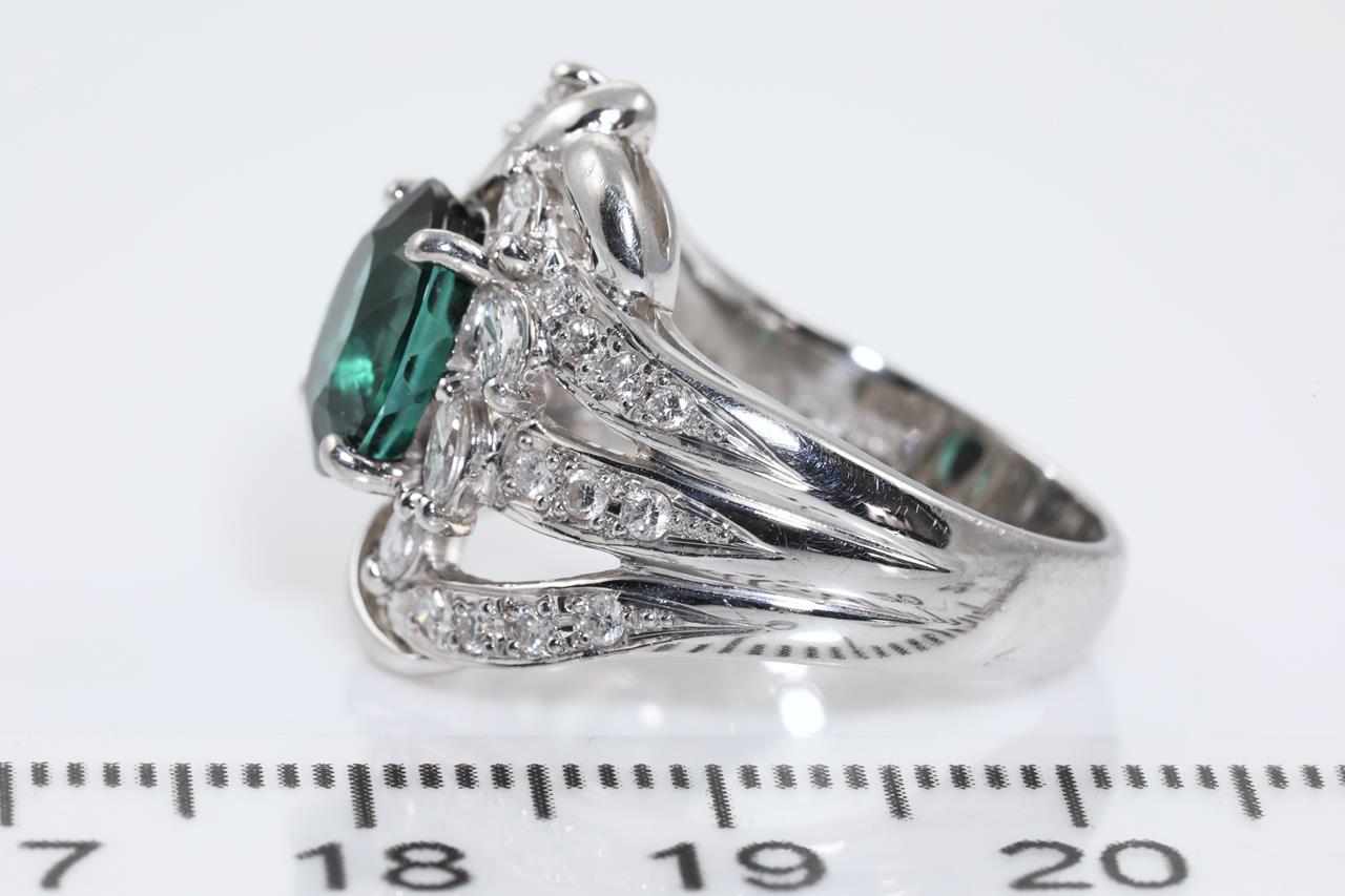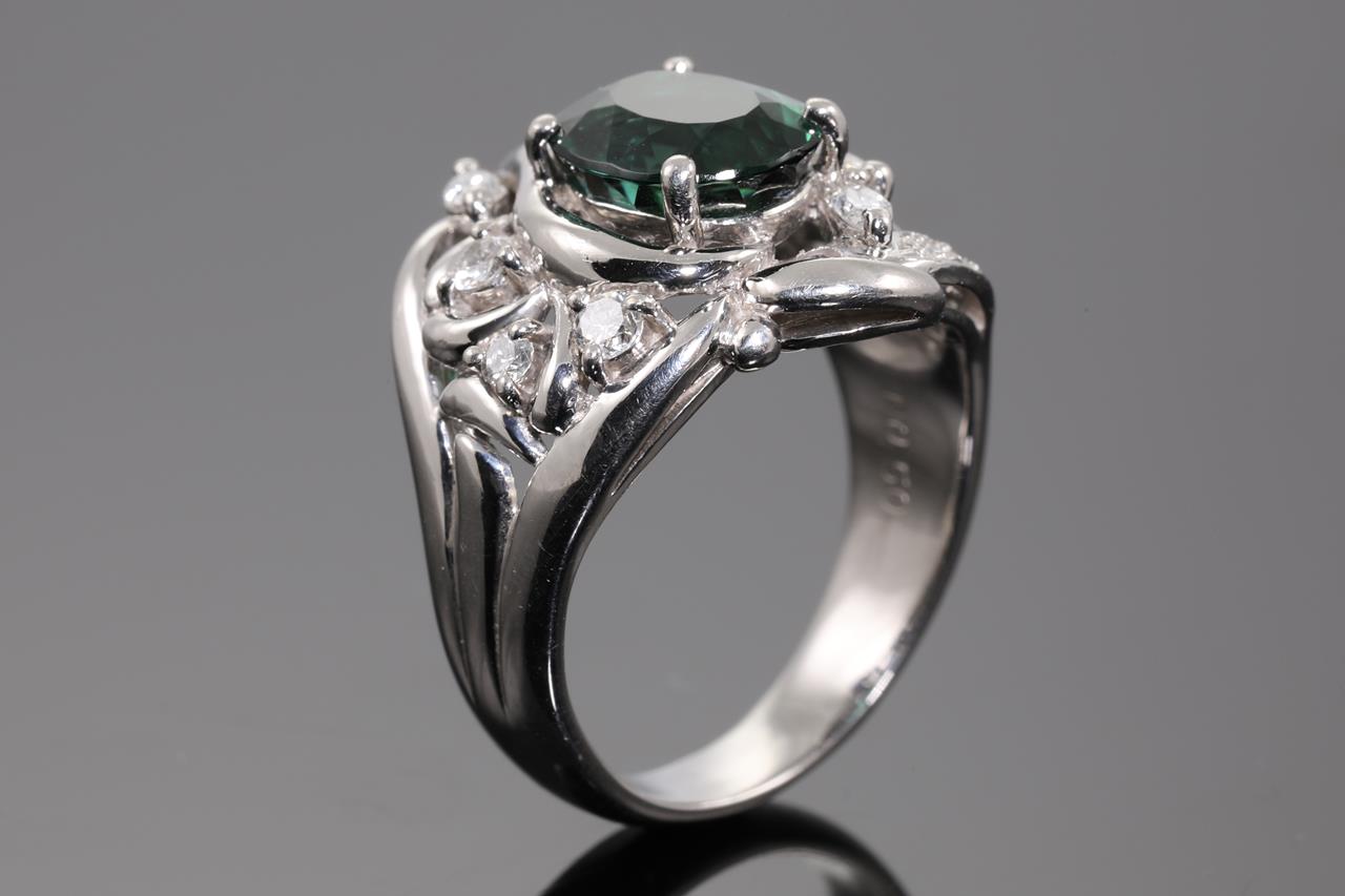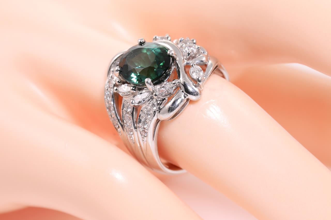 Tourmaline and Diamond Ring with oval green Tourmaline of 2.69ct with round and marquise cut Diamonds totalling 0.50cts (Estimated grading: G-H SI-P1). Platinum. Ring size: M. Weight: 10.6g (Pre-owned)