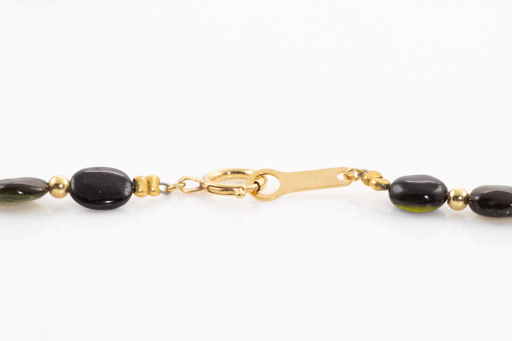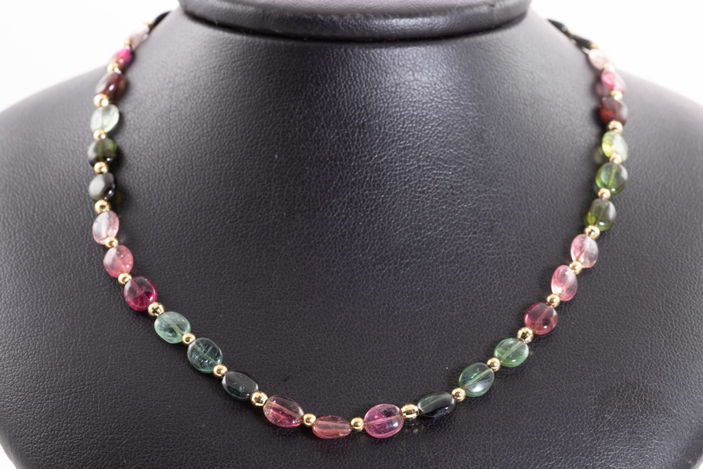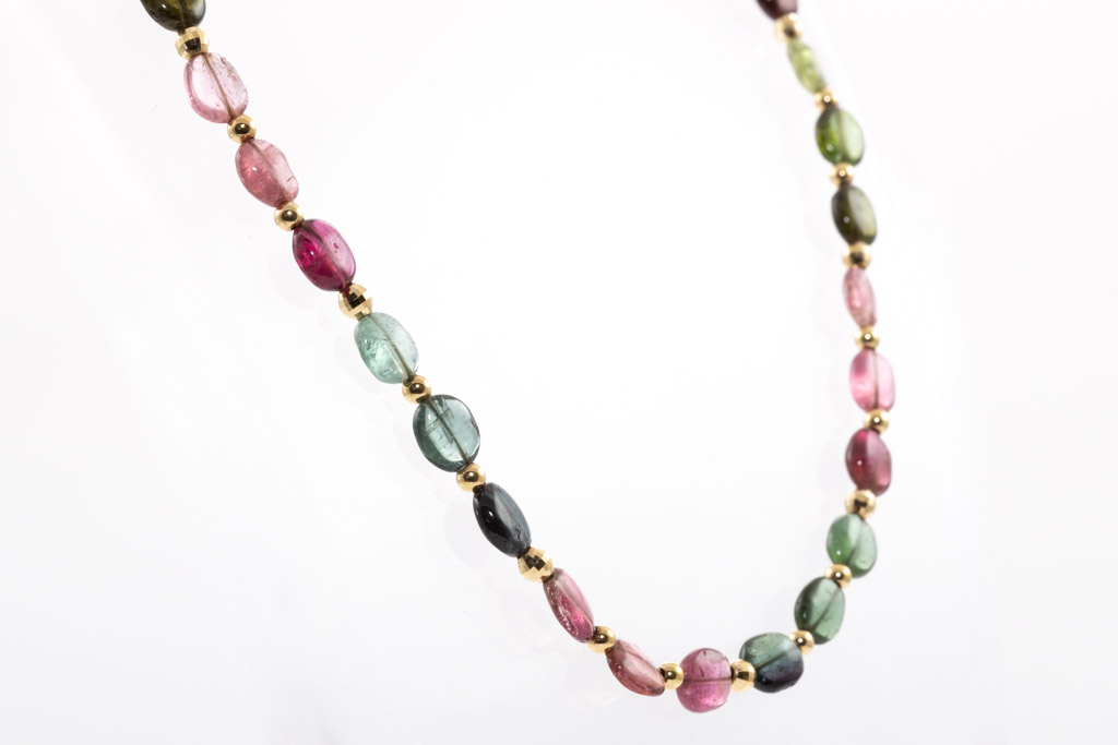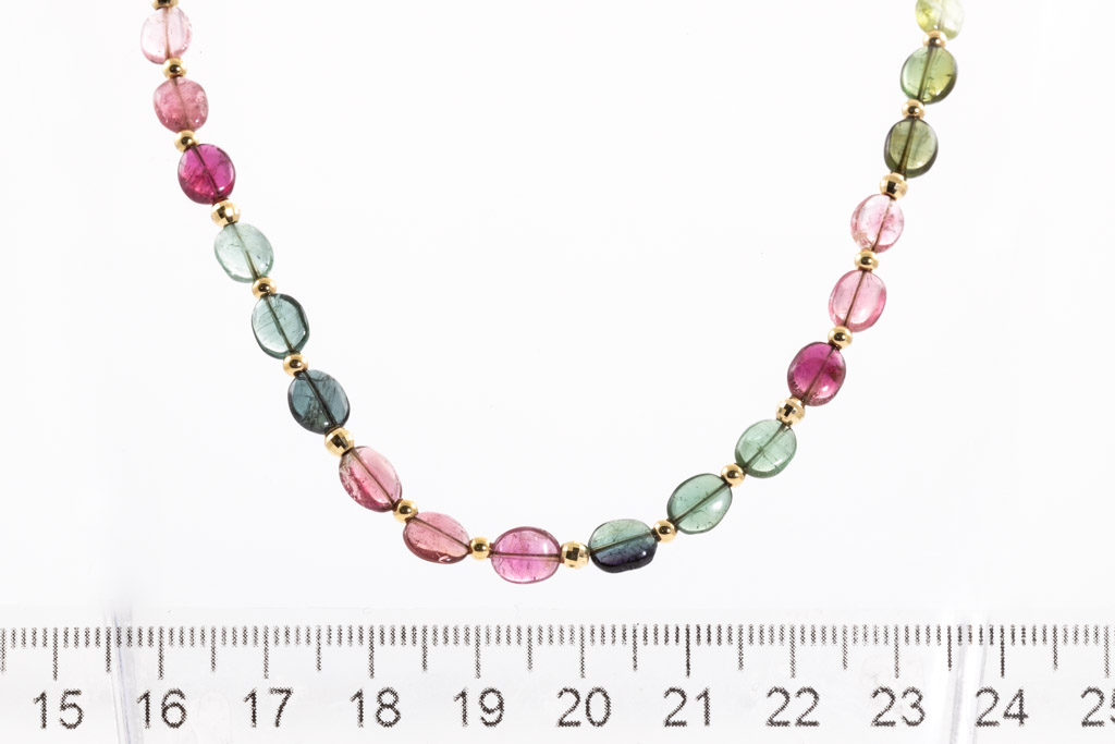 Tourmaline necklace with 47 multi-colour Tourmaline beads (approximately bead size: 6.6 x 5.2 x 3.1mm). 18ct yellow gold. Length: 43cm. Weight: 8.8g. (Pre-owned)