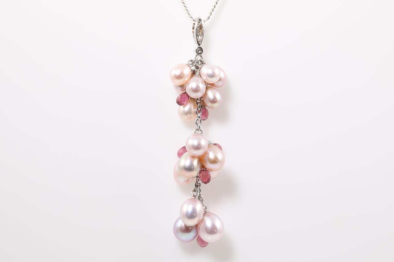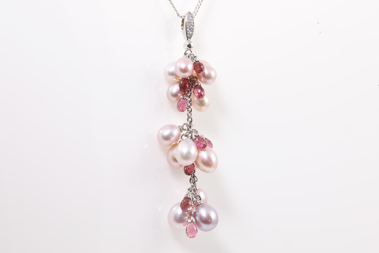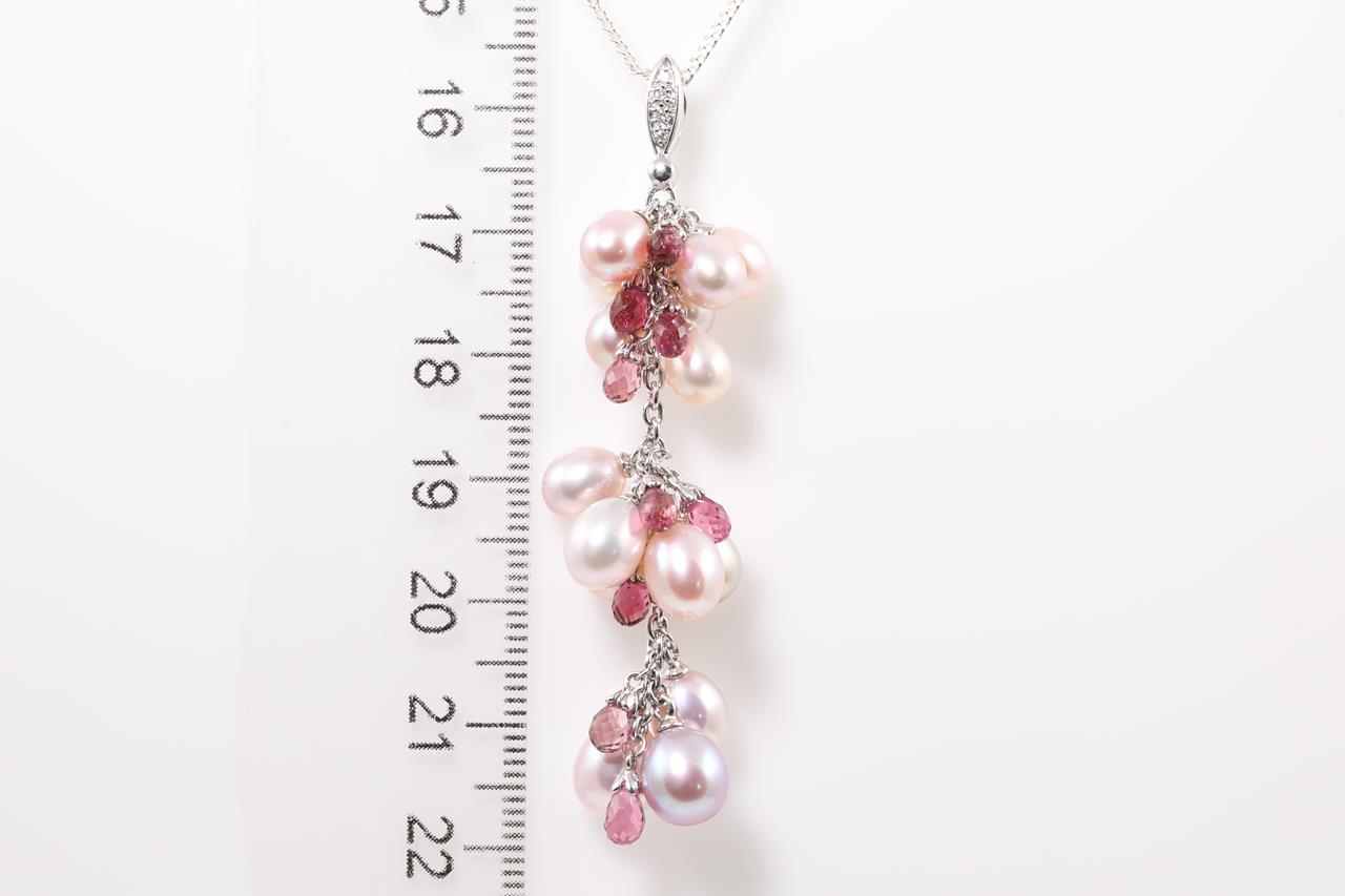 Tourmaline, Pearl and Diamond Pendant with 14 drop shaped pink cultured Pearls 5.5-7.2mm, 18ct white gold. Pendant Weight 9.1g. With display chain (base metal). (As New)