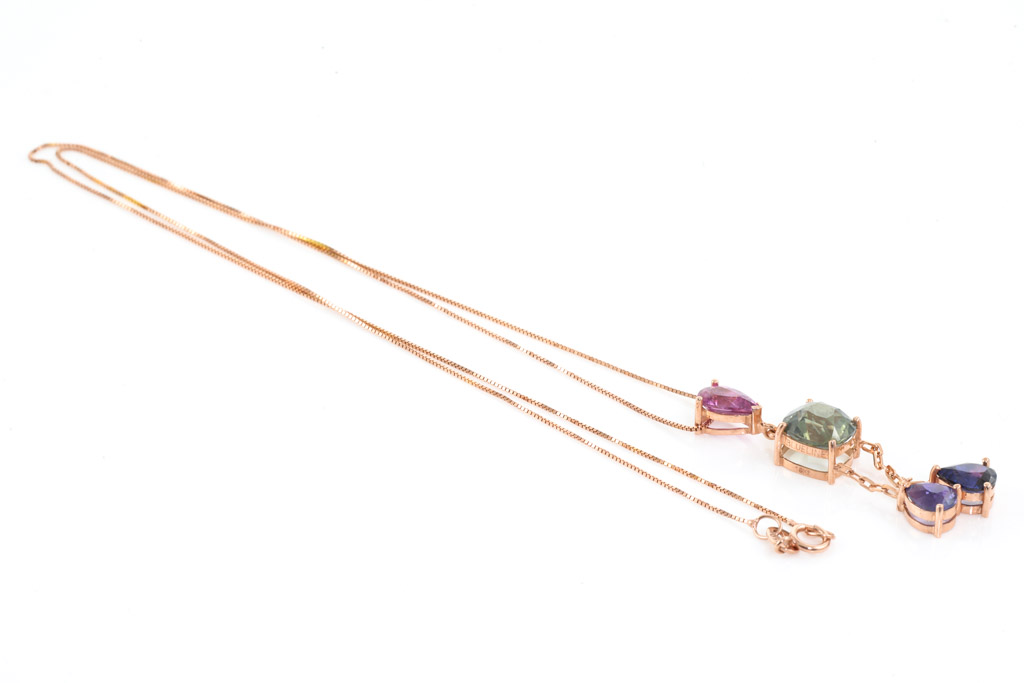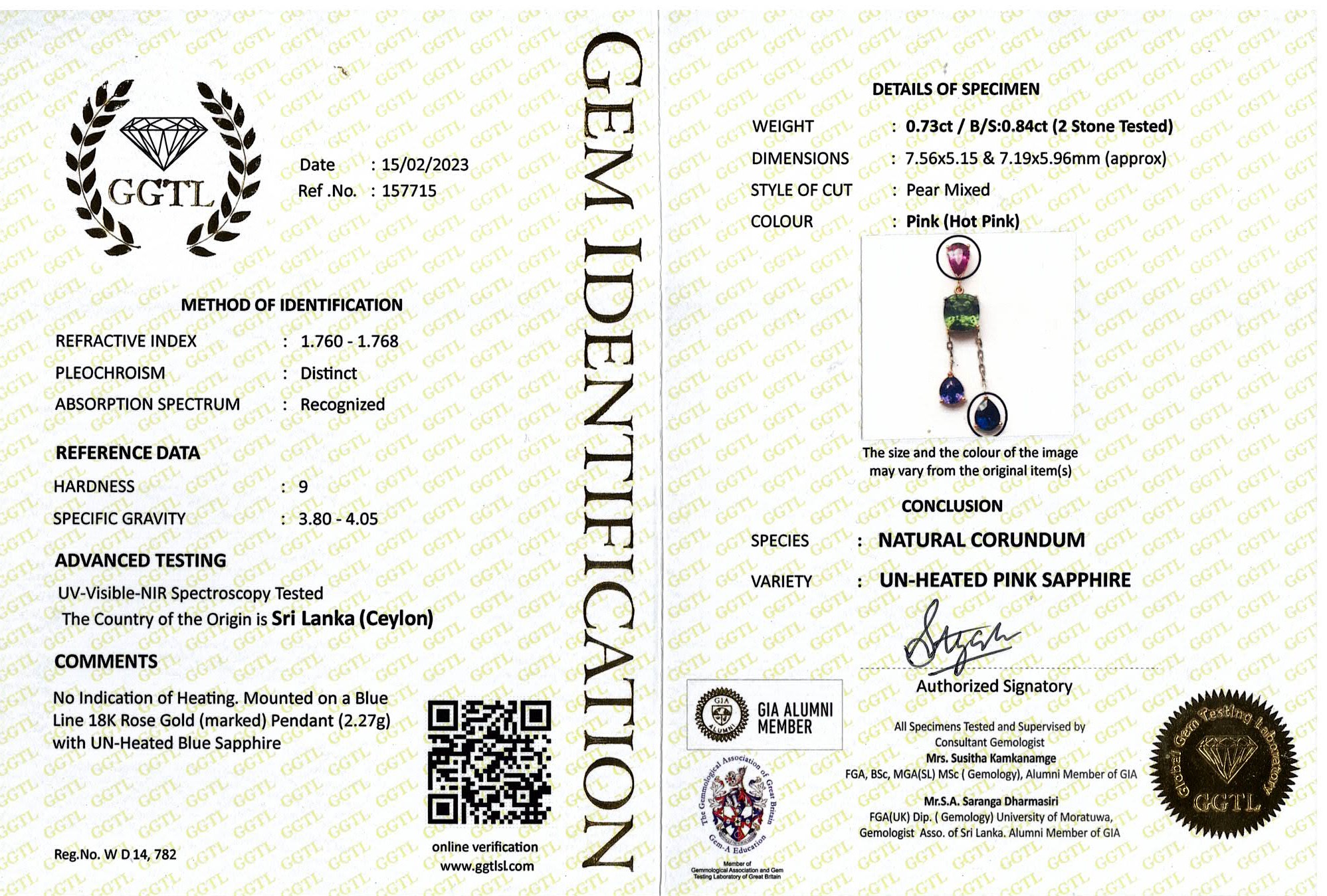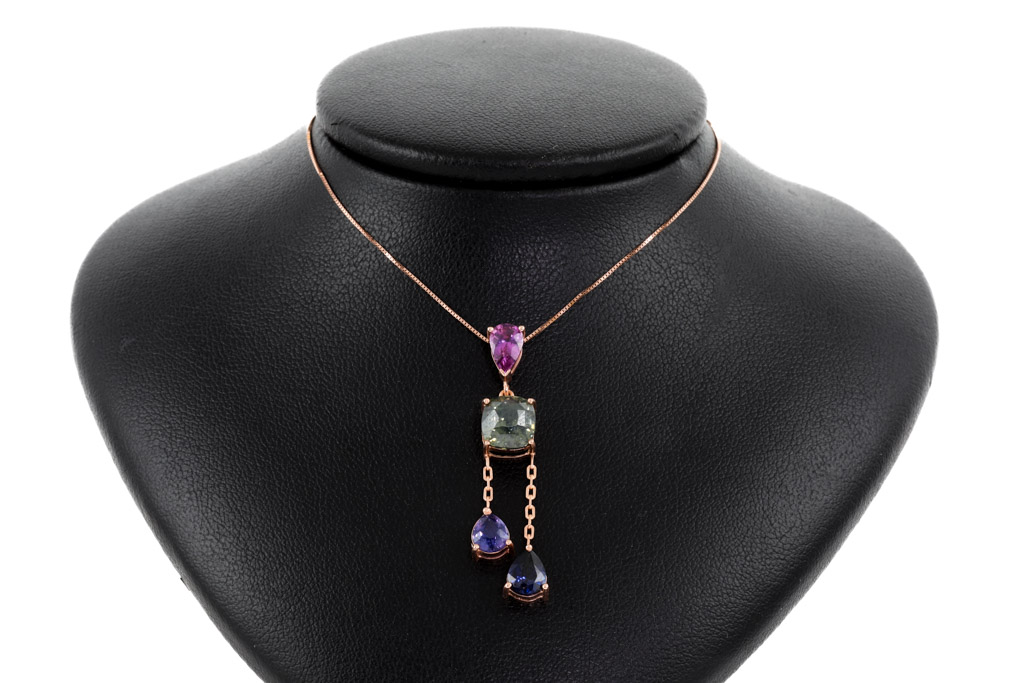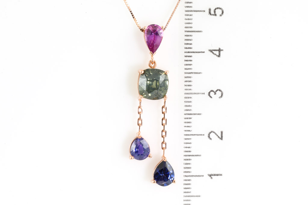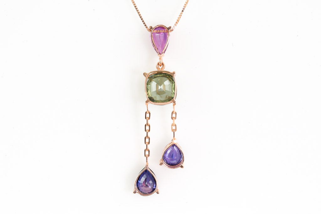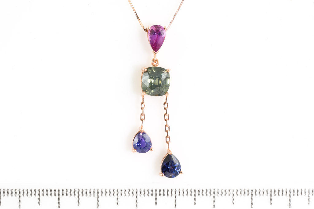 Tourmaline & Sapphire pendant with cushion cut green Tourmaline of approximately 3.10cts, a pear shape unheated pink Ceylon sapphire totalling 0.73cts and 2 pear shape blue unheated Ceylon sapphires totalling 0.84cts. 18ct rose gold with 44cm 18ct rose gold. Weight: 3.2g. With GGTL #157715. (As New)