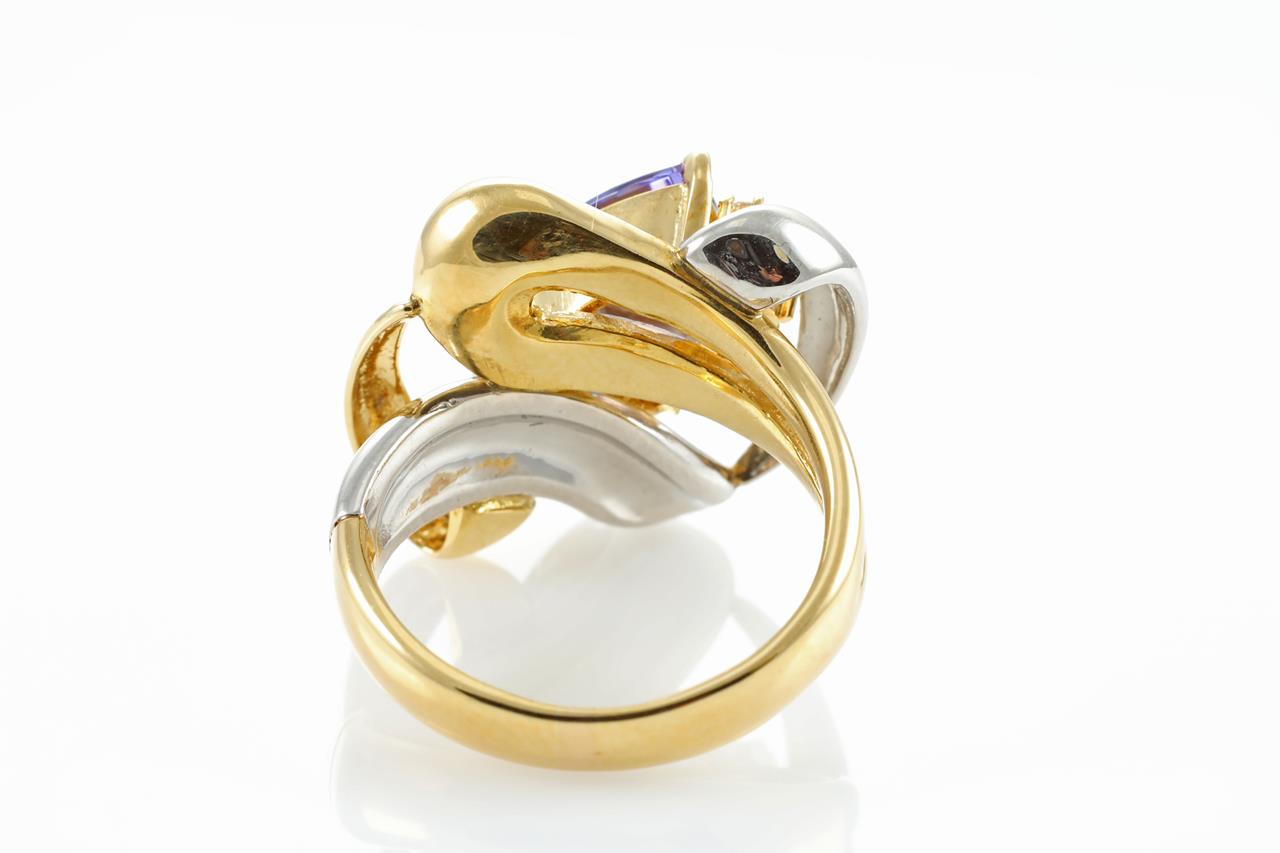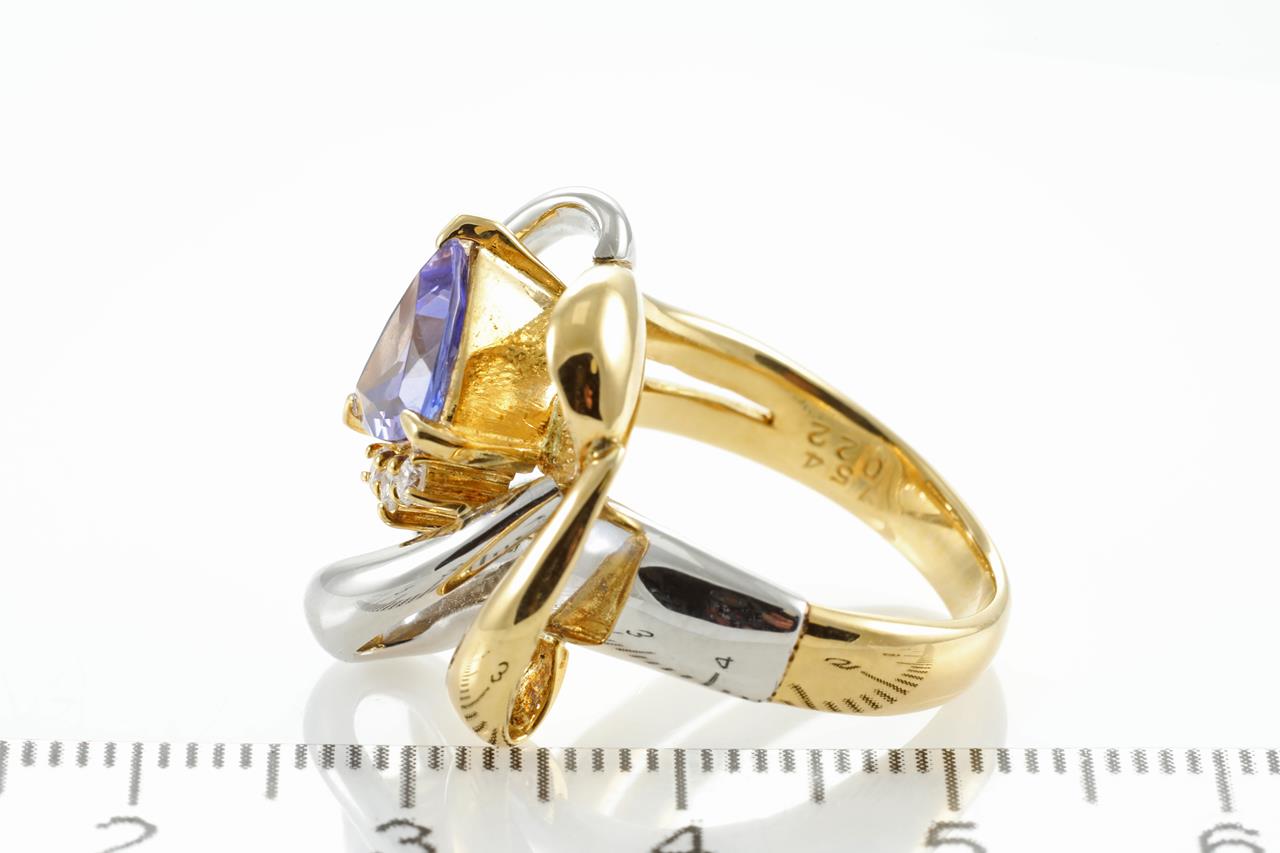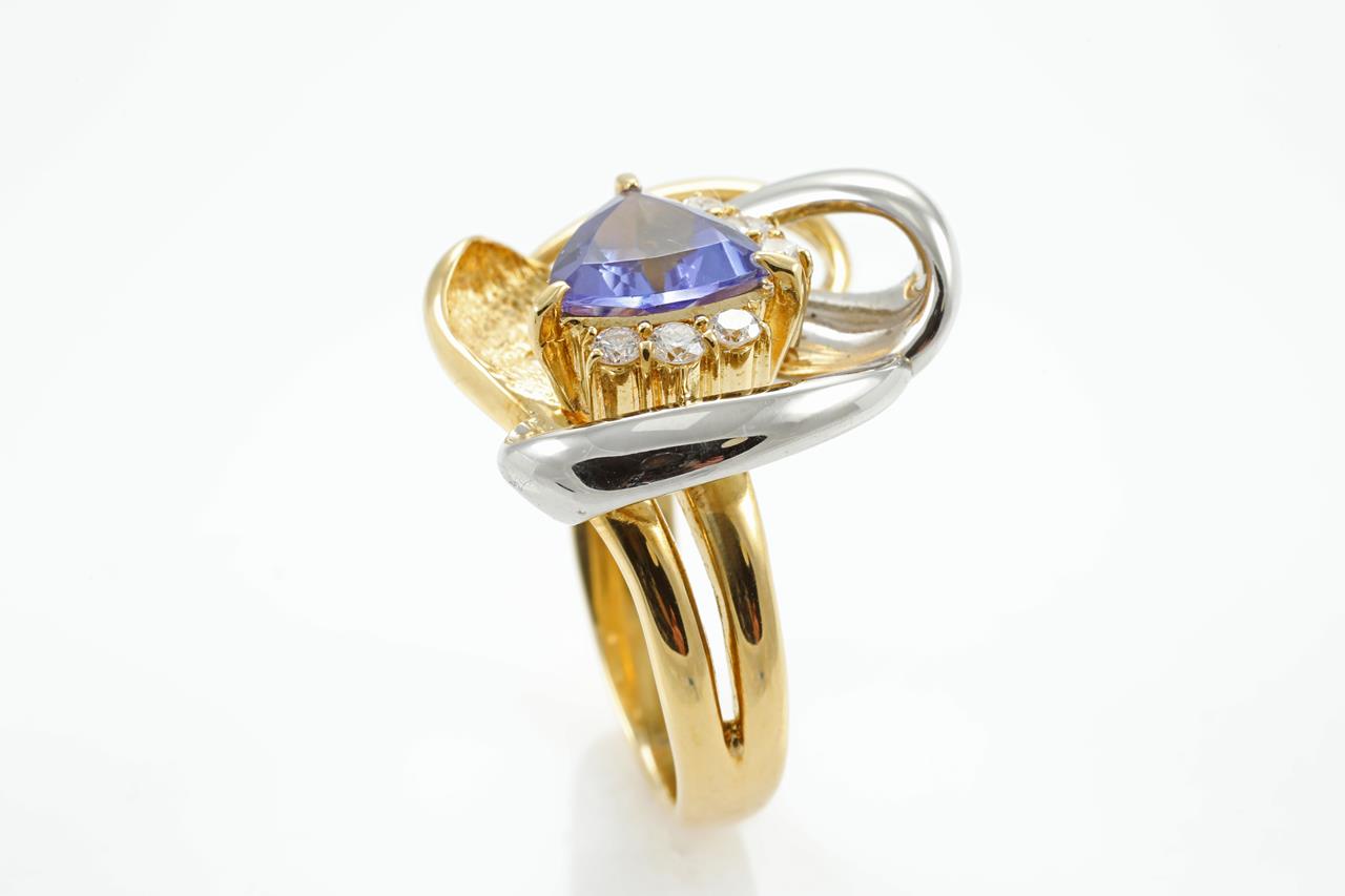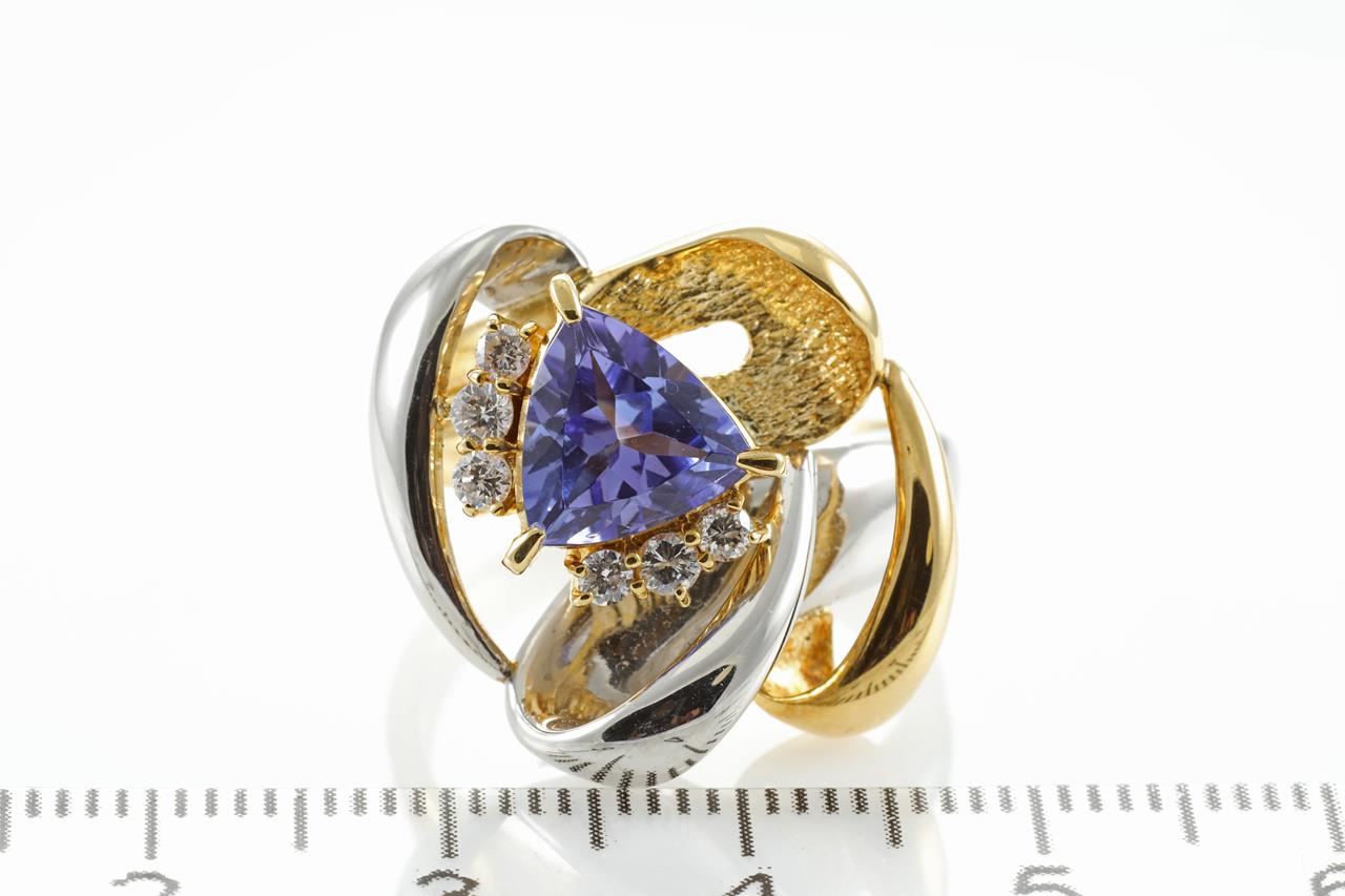 Tanzanite and Diamond Ring with trilliant cut Tanzanite of 1.54ct and 6 Diamonds totalling 0.22cts. Platinum and 18ct yellow gold. Ring size M1/2. Weight: 13.9 grams (Pre-owned)