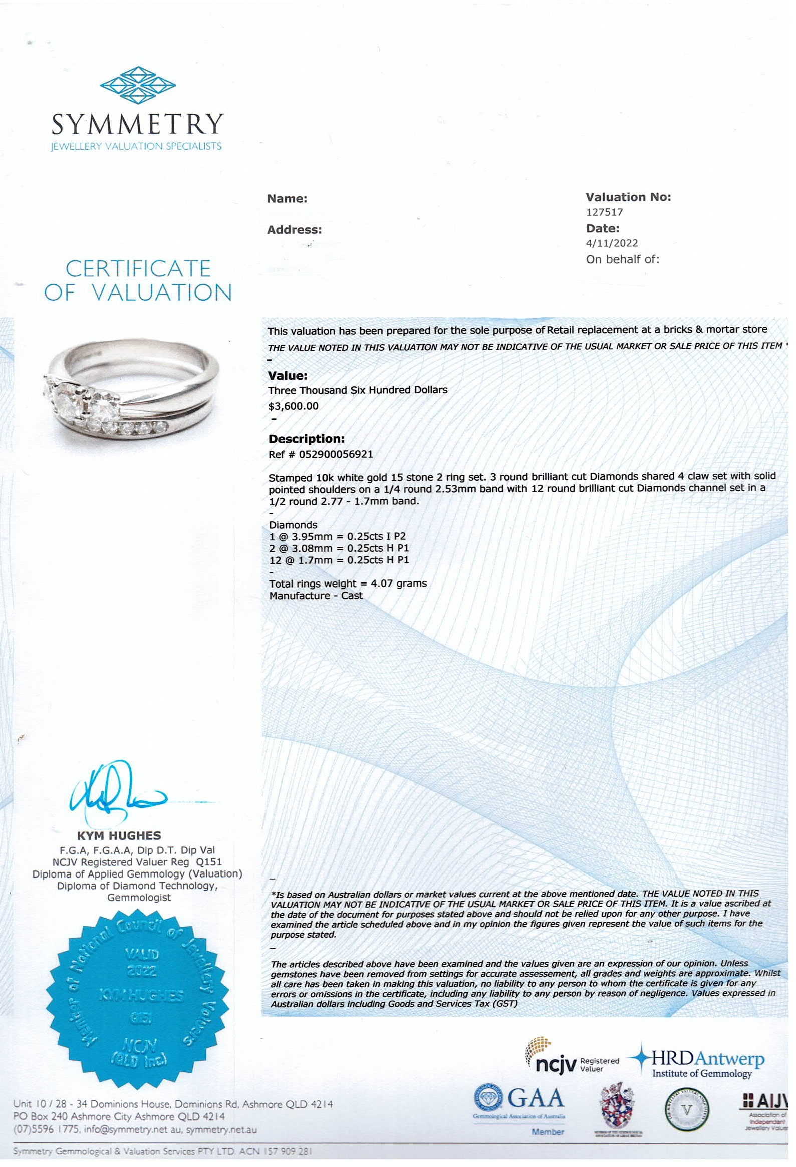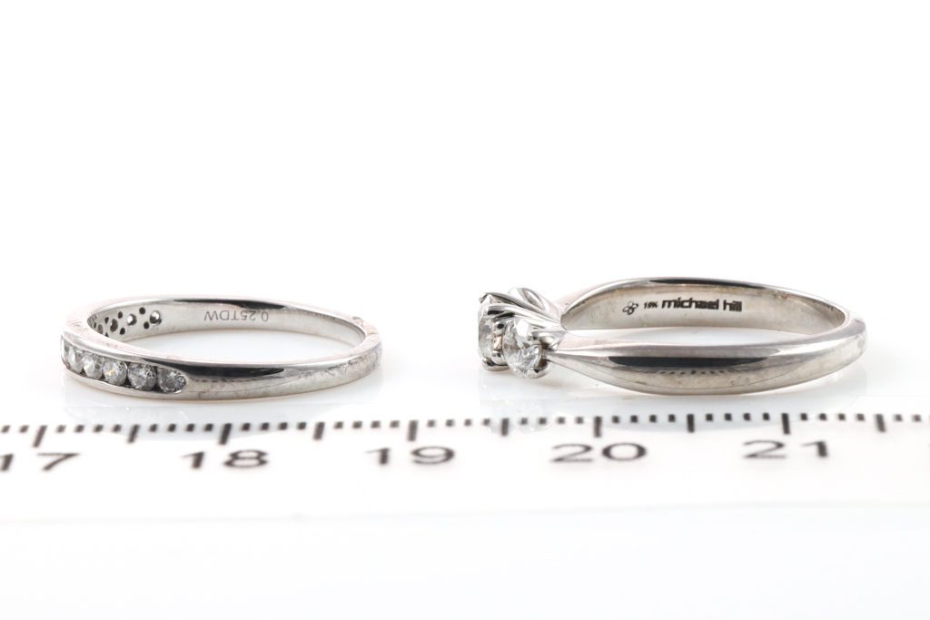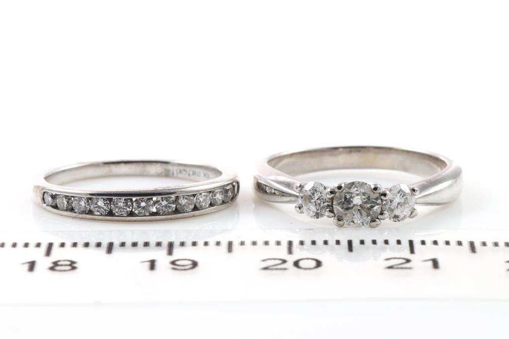 Set of 2 rings; Diamond trilogy ring set with 3 diamonds totalling 0.50cts (Estimated grading: H-I P1-2). Together with matching eternity ring with 12 round Diamonds of 0.25ct. Combined eight: 4.1g. 10ct white gold. Ring size I. With Valuation Certificate #052900056921.