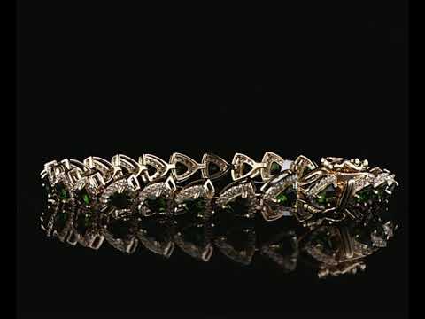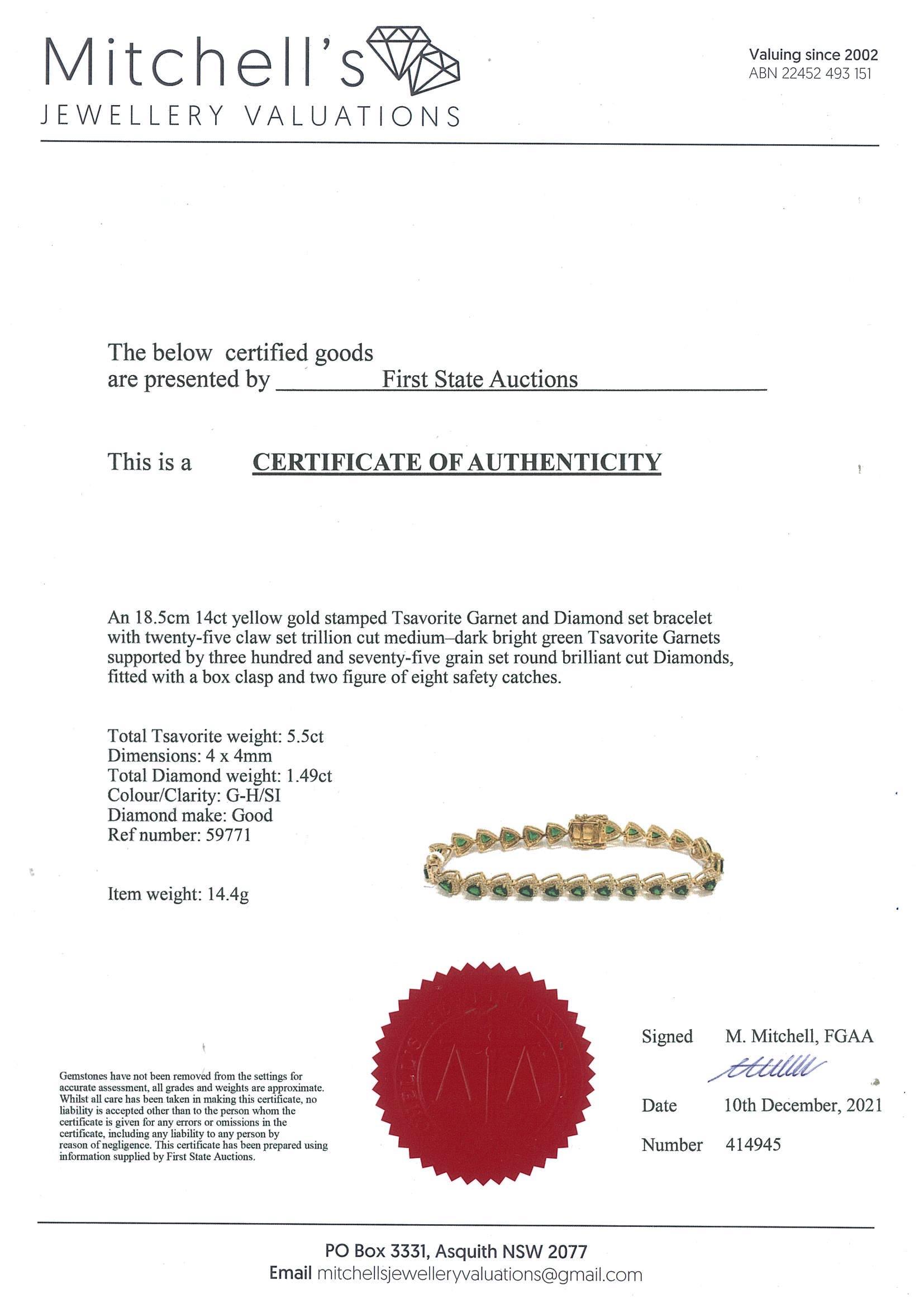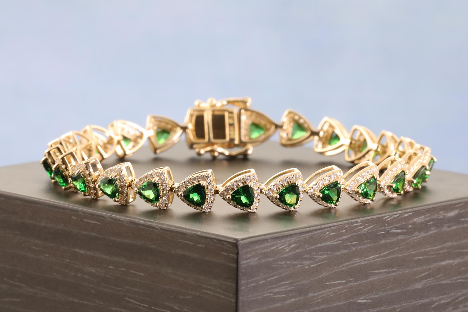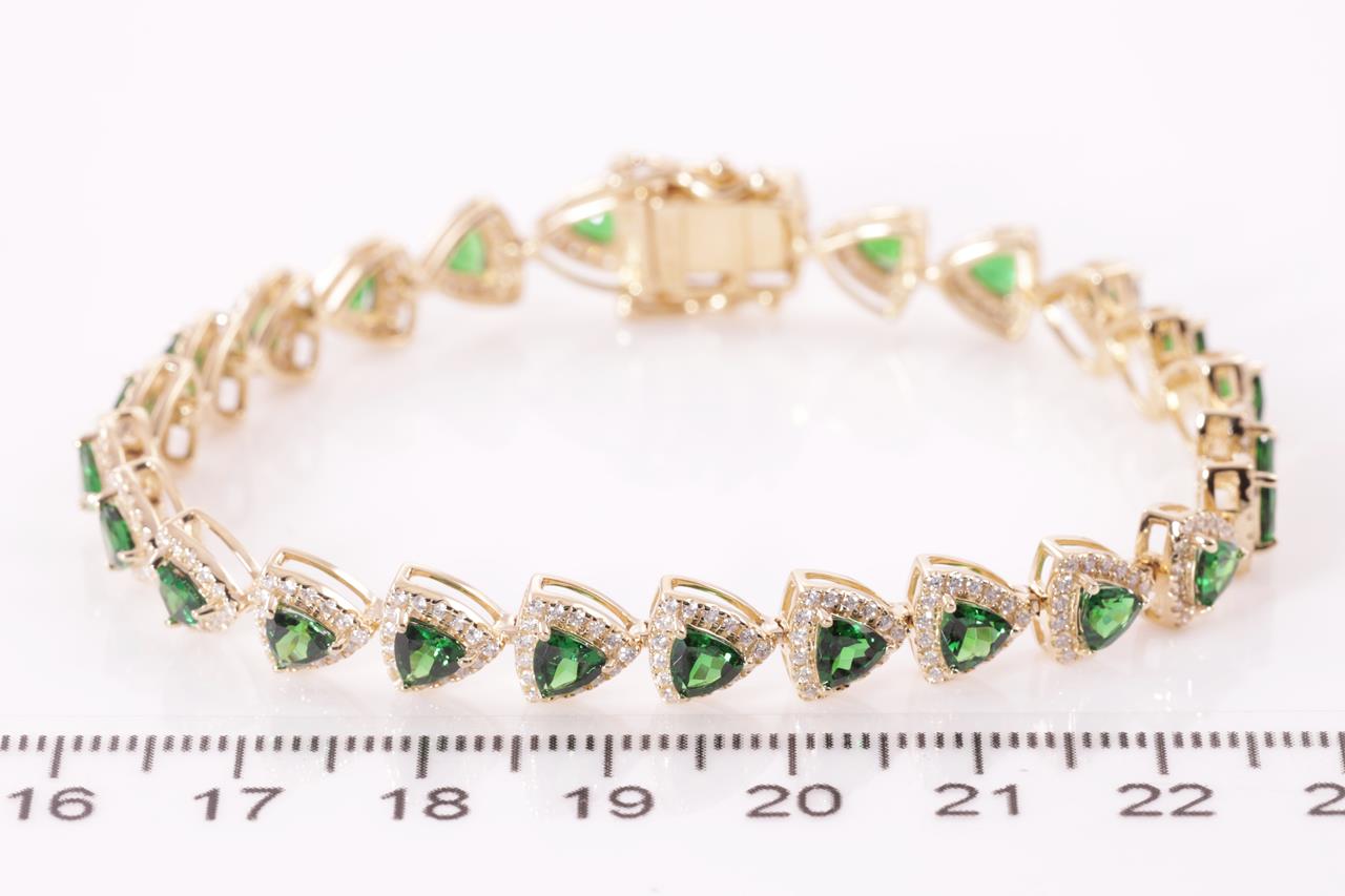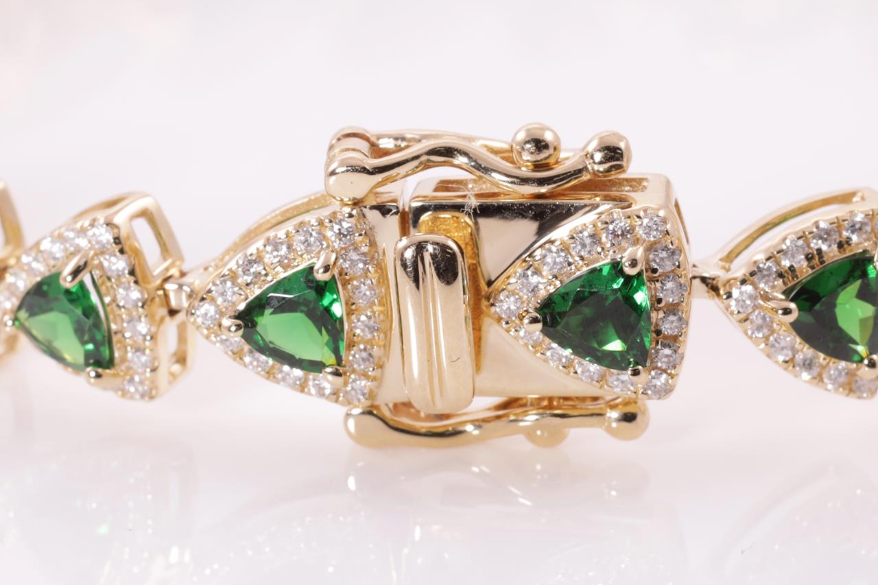 Tsavorite and Diamond bracelet with trilliant cut Tsavorites totalling 5.85cts and Diamonds totalling 1.49cts (Estimated grading: G-H SI). 14ct yellow gold. Length: 19.5cm. Weight: 14.4g. With certificate #414945. (As new)