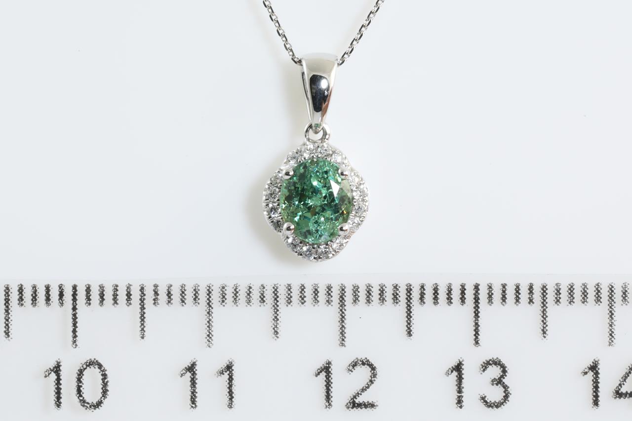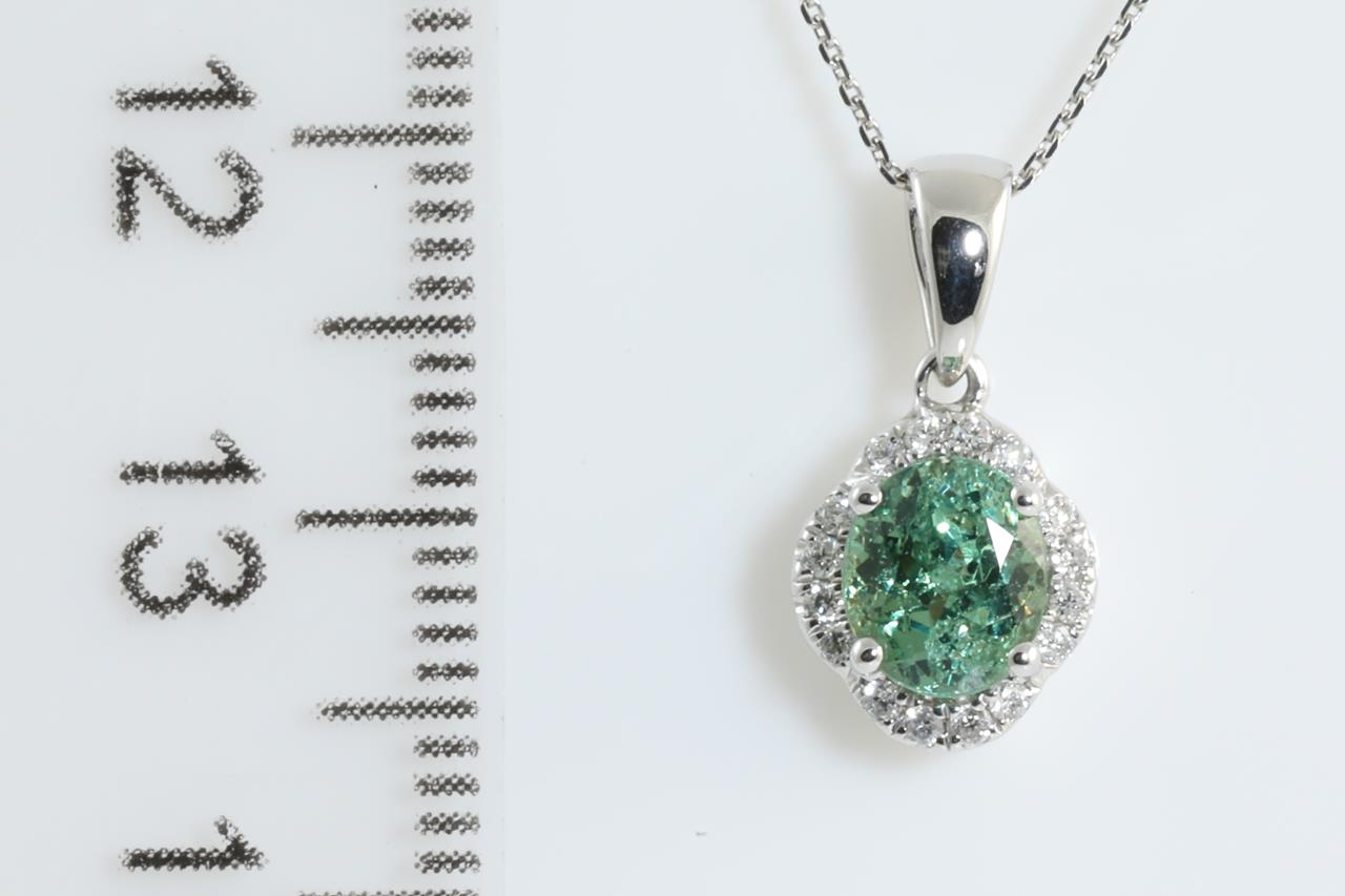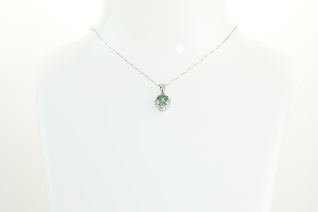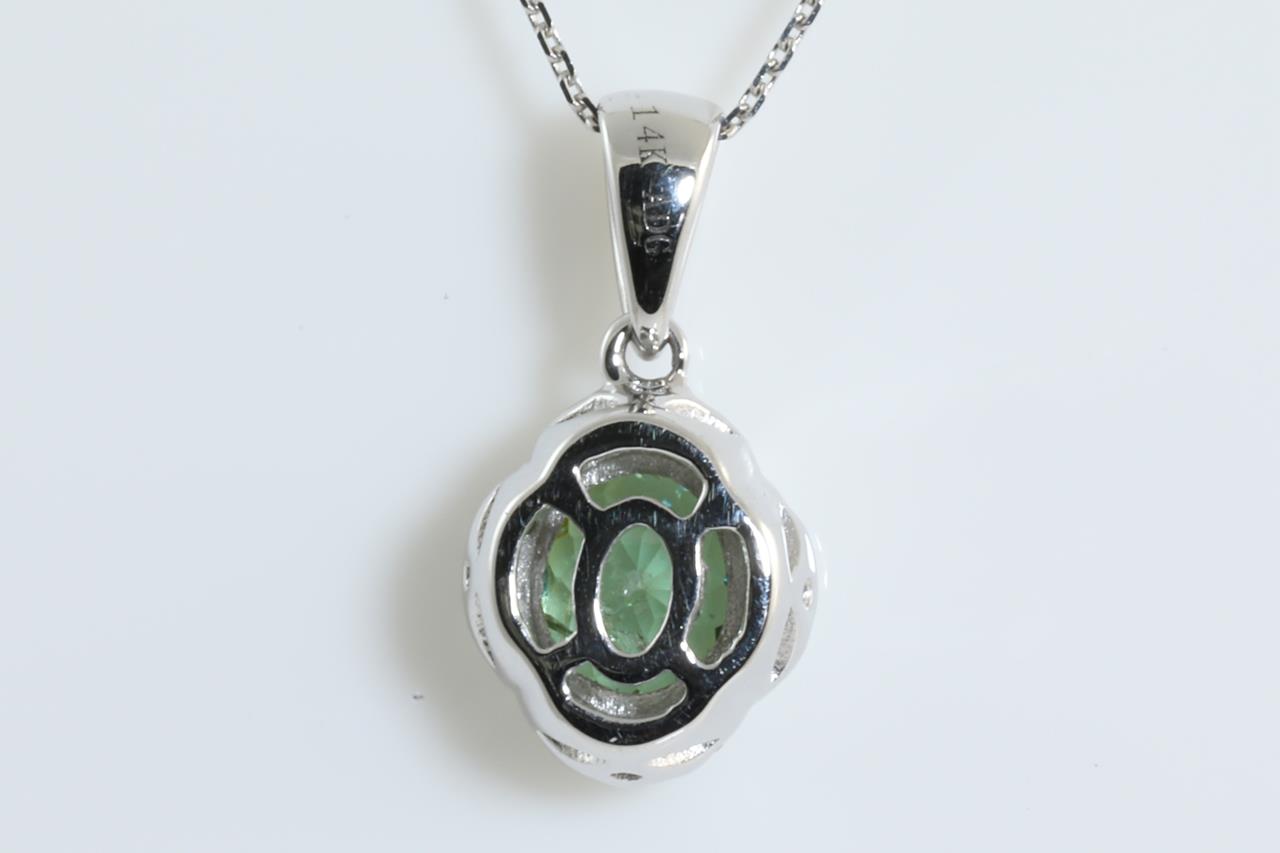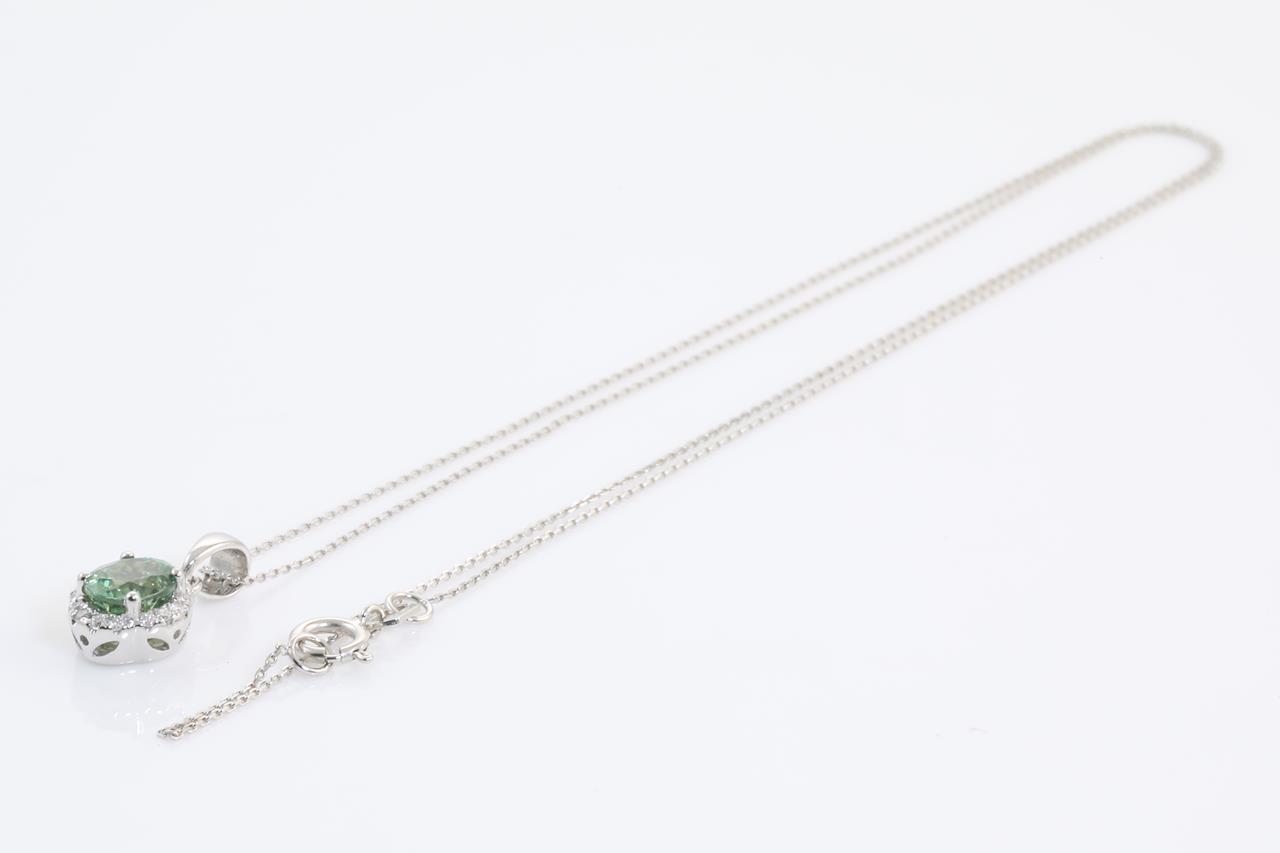 Tsavorite and Diamond pendant with oval shape Tsavorite of 1.05cts and round Diamonds totalling 0.09cts. 14ct white gold with 14ct gold, 45cm chain. Weight: 1.8g (New).