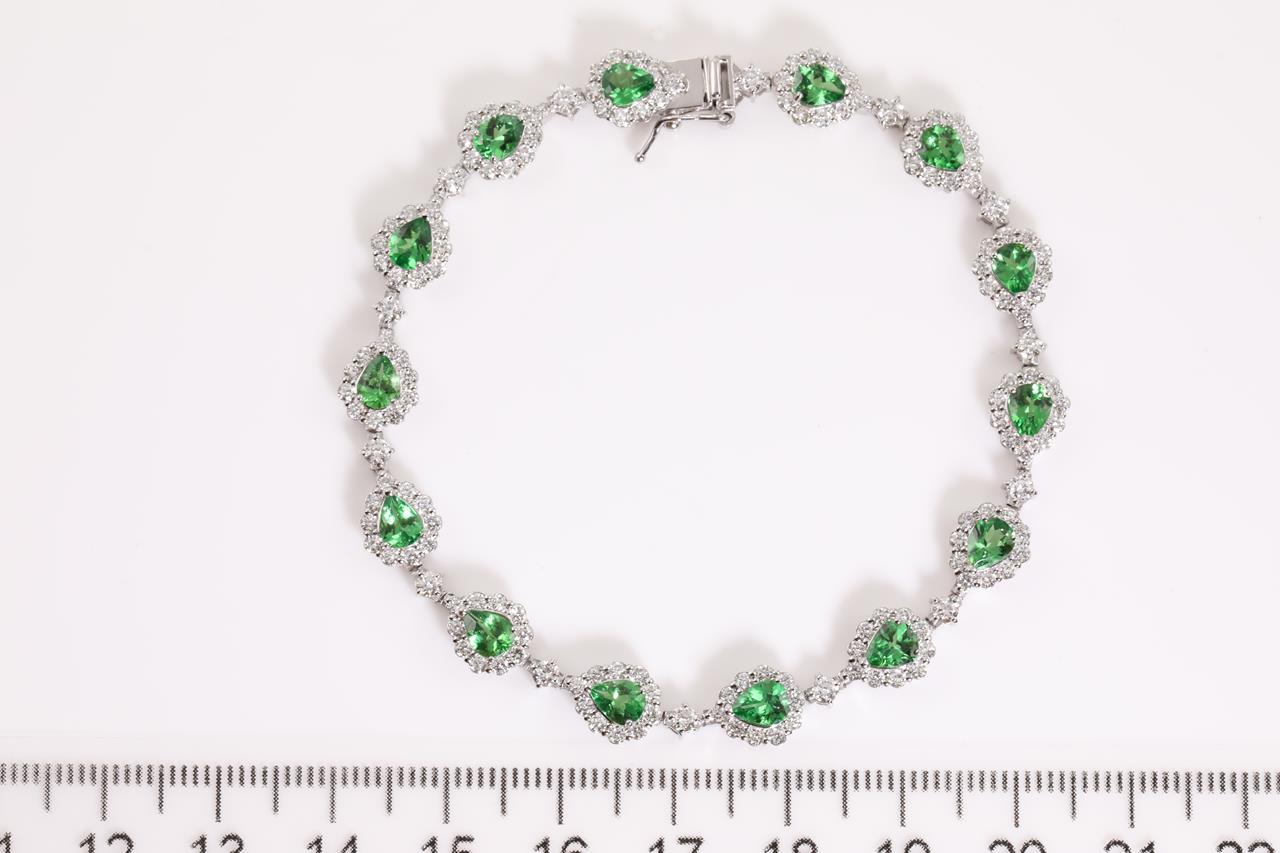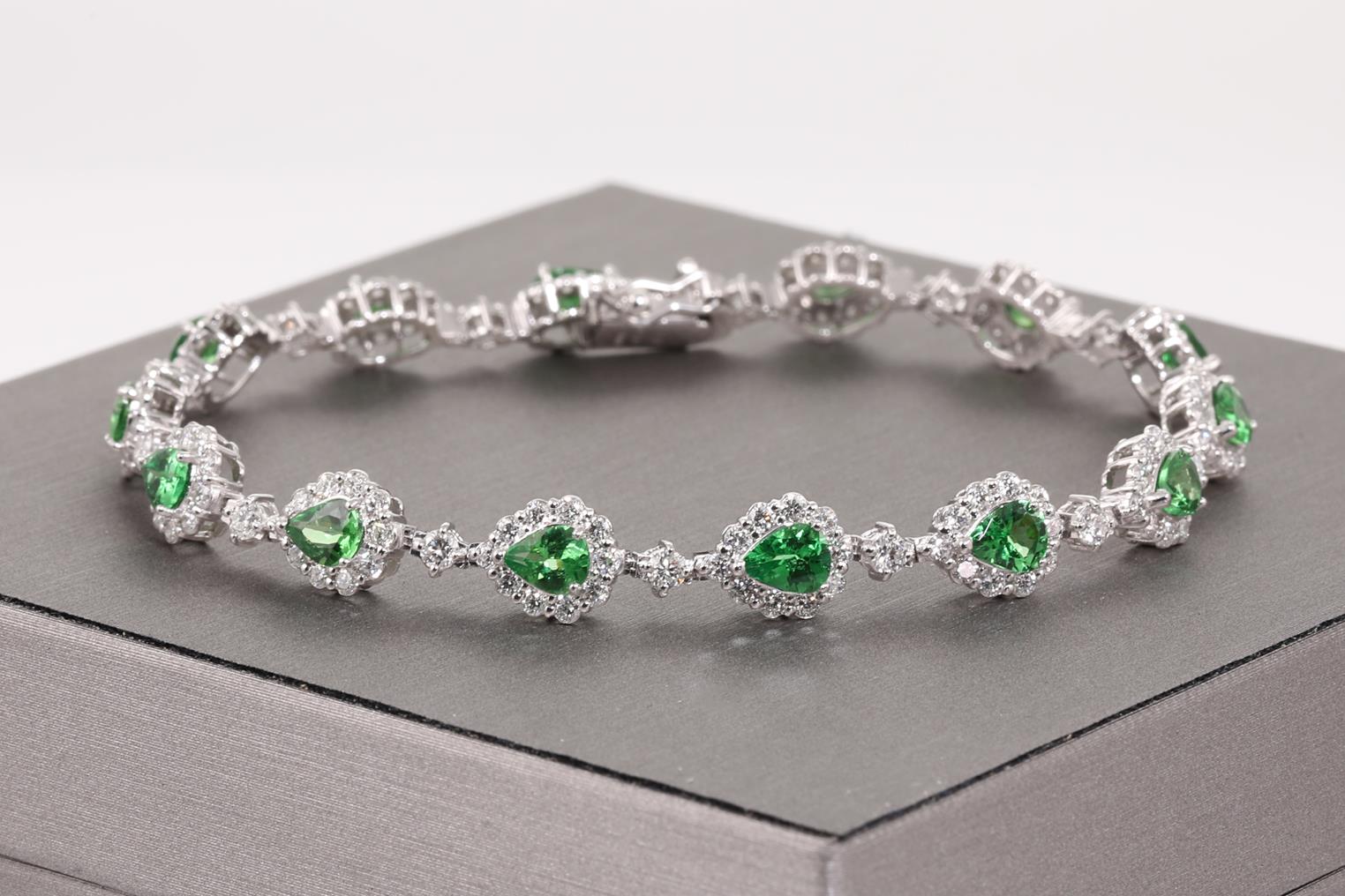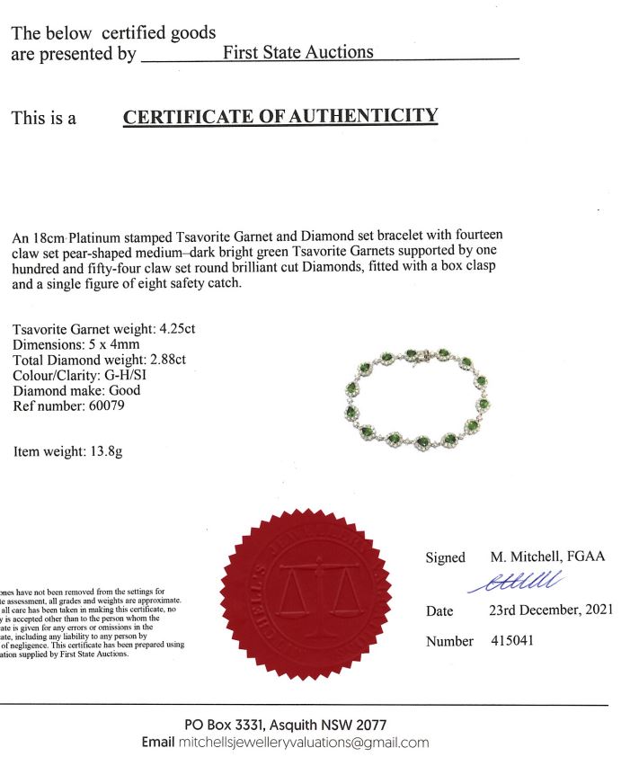 Garnet and Diamond bracelet with pear shape Tsavorite Garnet totalling 4.25cts and round Diamonds totalling 2.88cts (Estimated grading: G-H SI). Platinum. Length: 18cm. Weight: 13.8g. With certificate #415041 (Pre-owned)