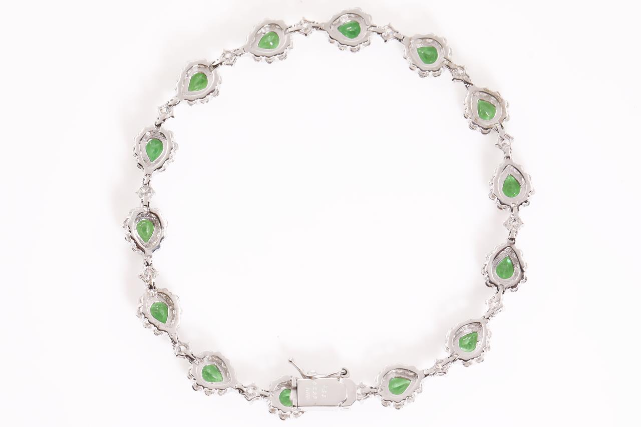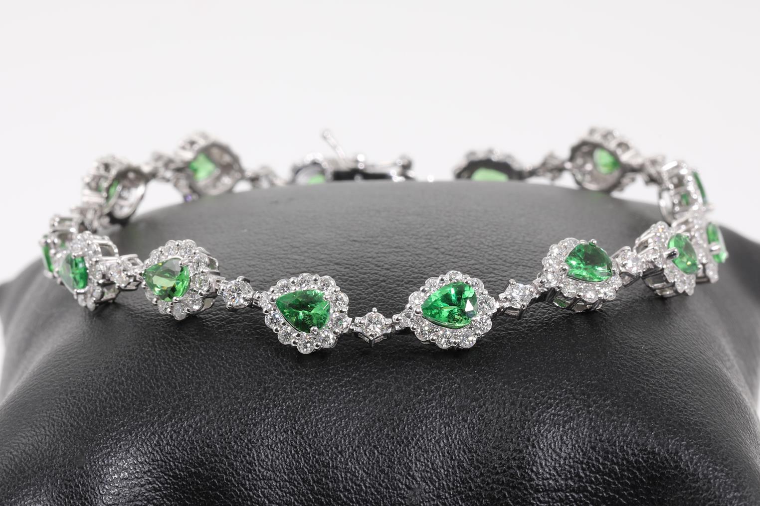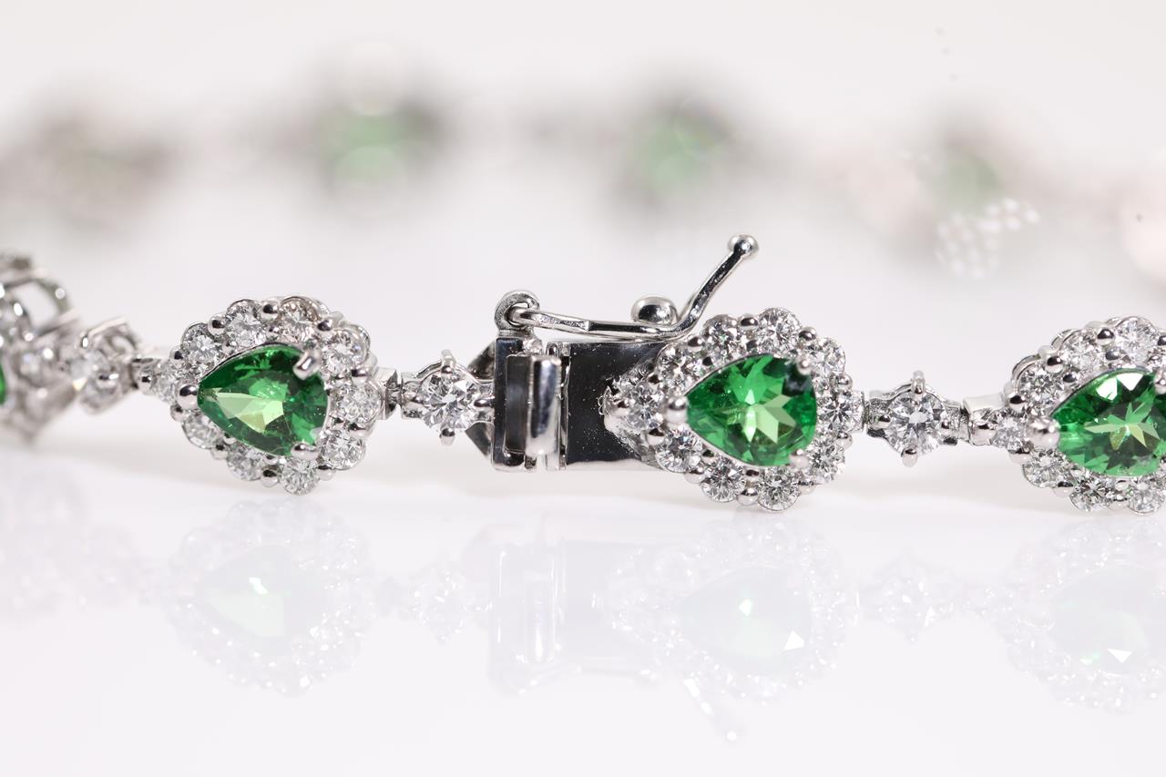 Garnet and Diamond bracelet with pear shape Tsavorite Garnet totalling 4.25cts and round Diamonds totalling 2.88cts (Estimated grading: G-H SI). Platinum. Length: 18cm. Weight: 13.8g. With certificate #415041 (Pre-owned)