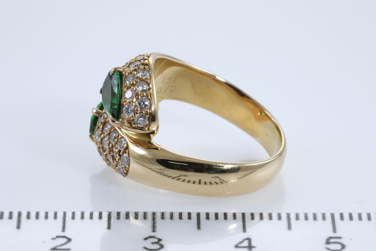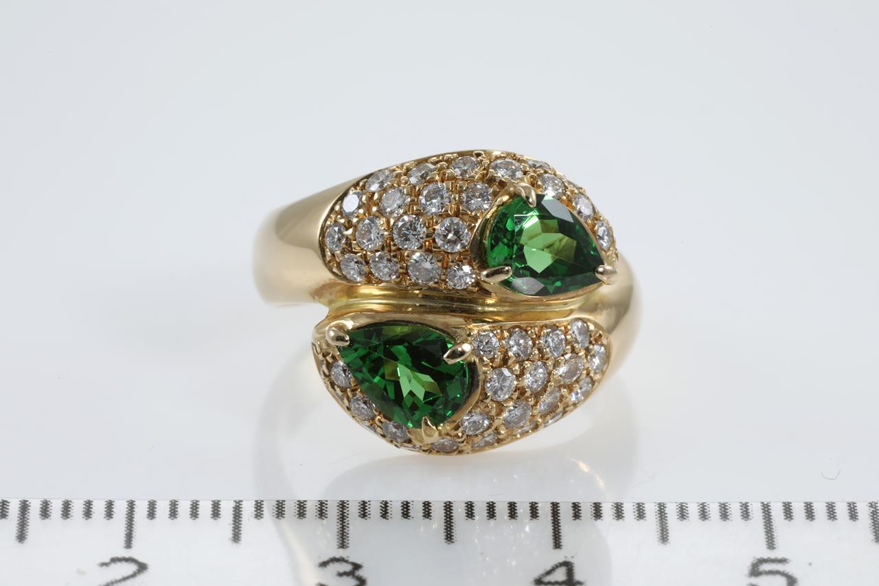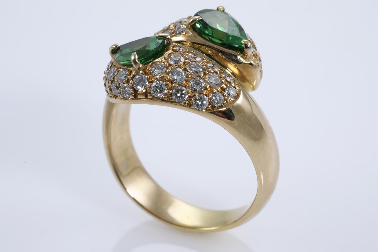 Garnet and Diamond ring with 2 pear shape Tsavorite Garnets totalling 1.31cts and Diamonds totalling 0.72cts (Estimated grading: G-H SI). 18ct yellow gold. Ring size L. Weight: 10.6g (Pre-owned)