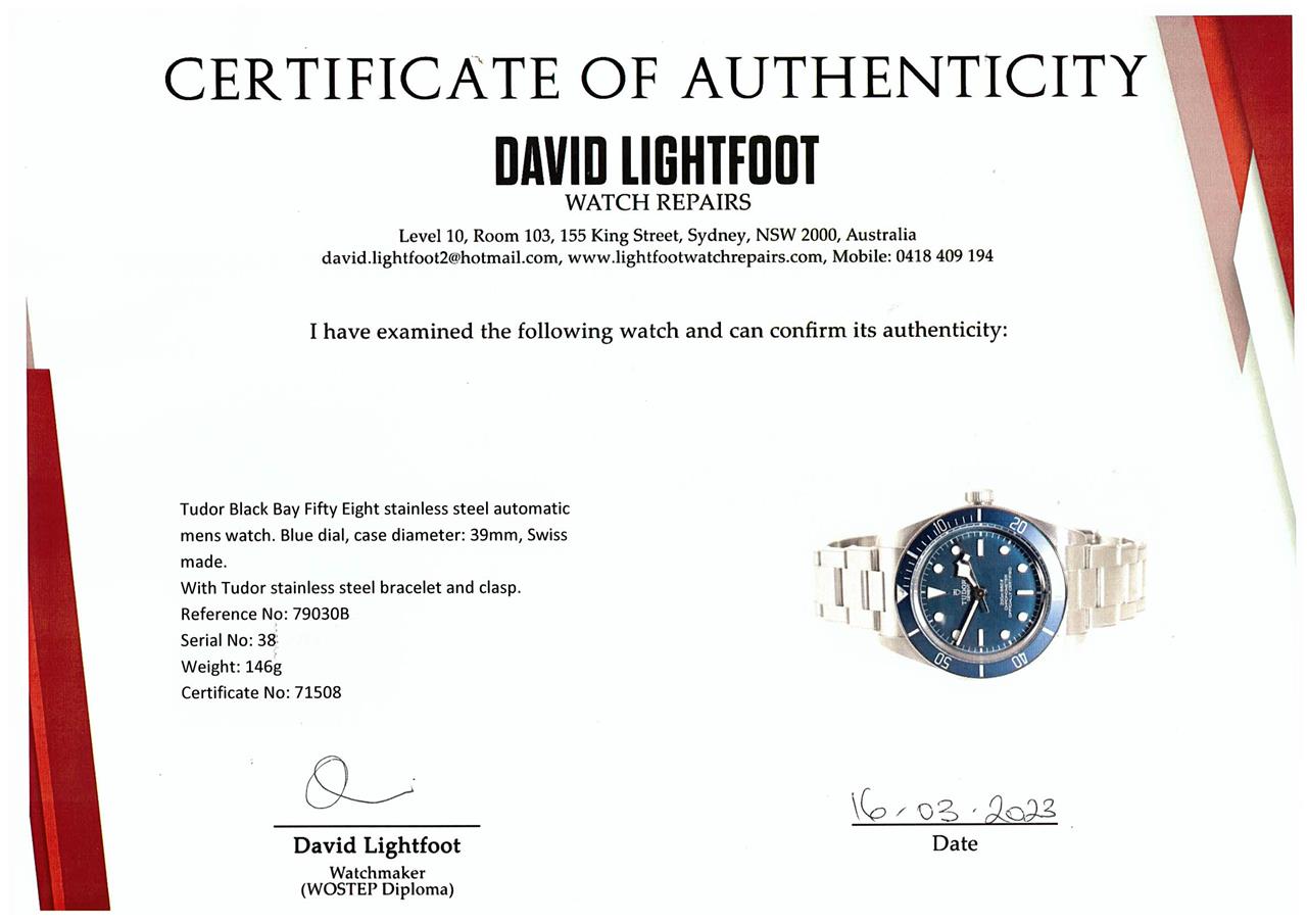Tudor Black Bay Fifty Eight stainless steel automatic men's watch. Blue dial, case diameter: 39mm, wrist size: 19cm, Swiss made. Ref# 79030B. With Tudor stainless steel bracelet and clasp. With Certificate of Authenticity, Tudor International Guarantee dated 12/09/2022 and Tudor box. Balance of 5 year Tudor Warranty. (Pre-owned)