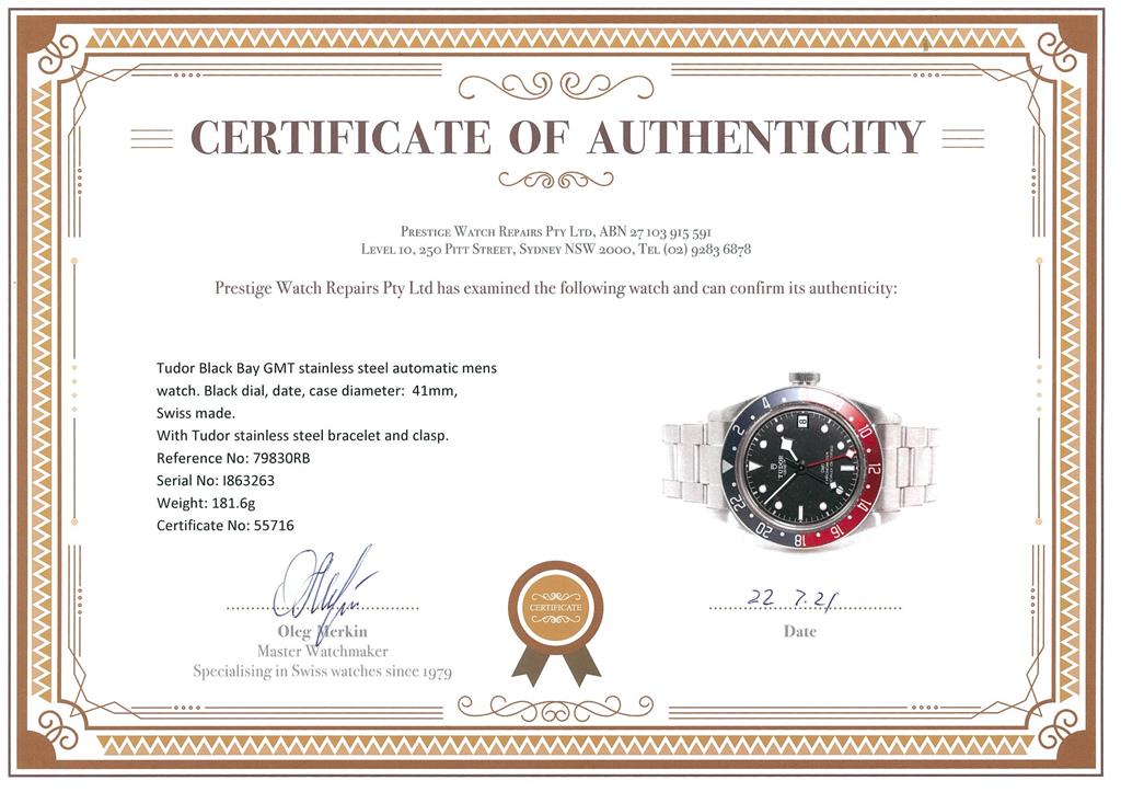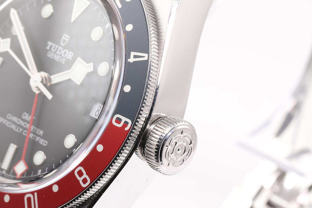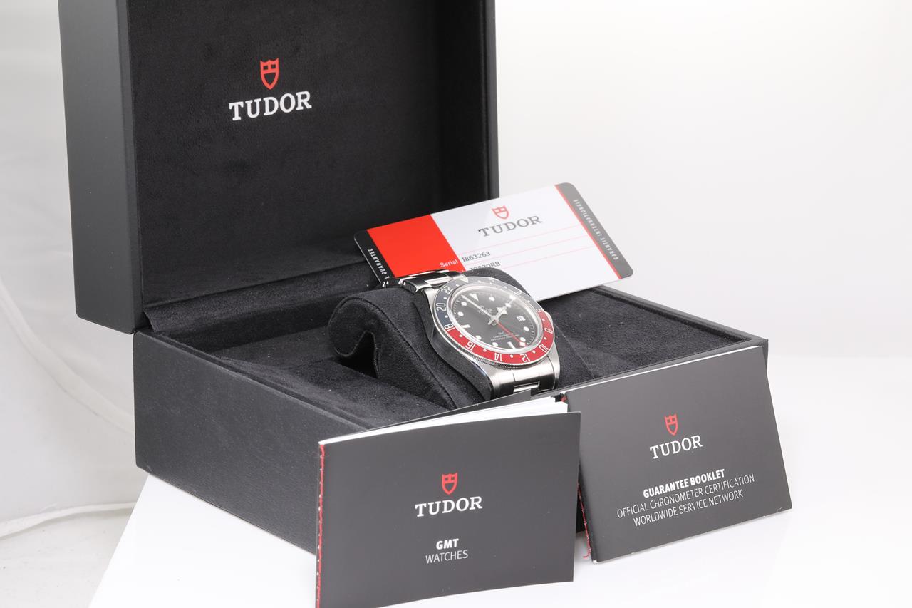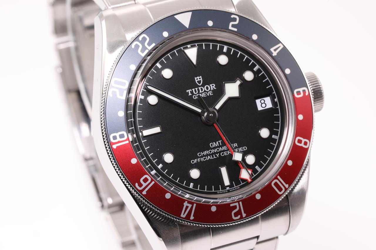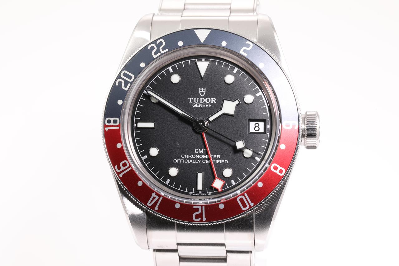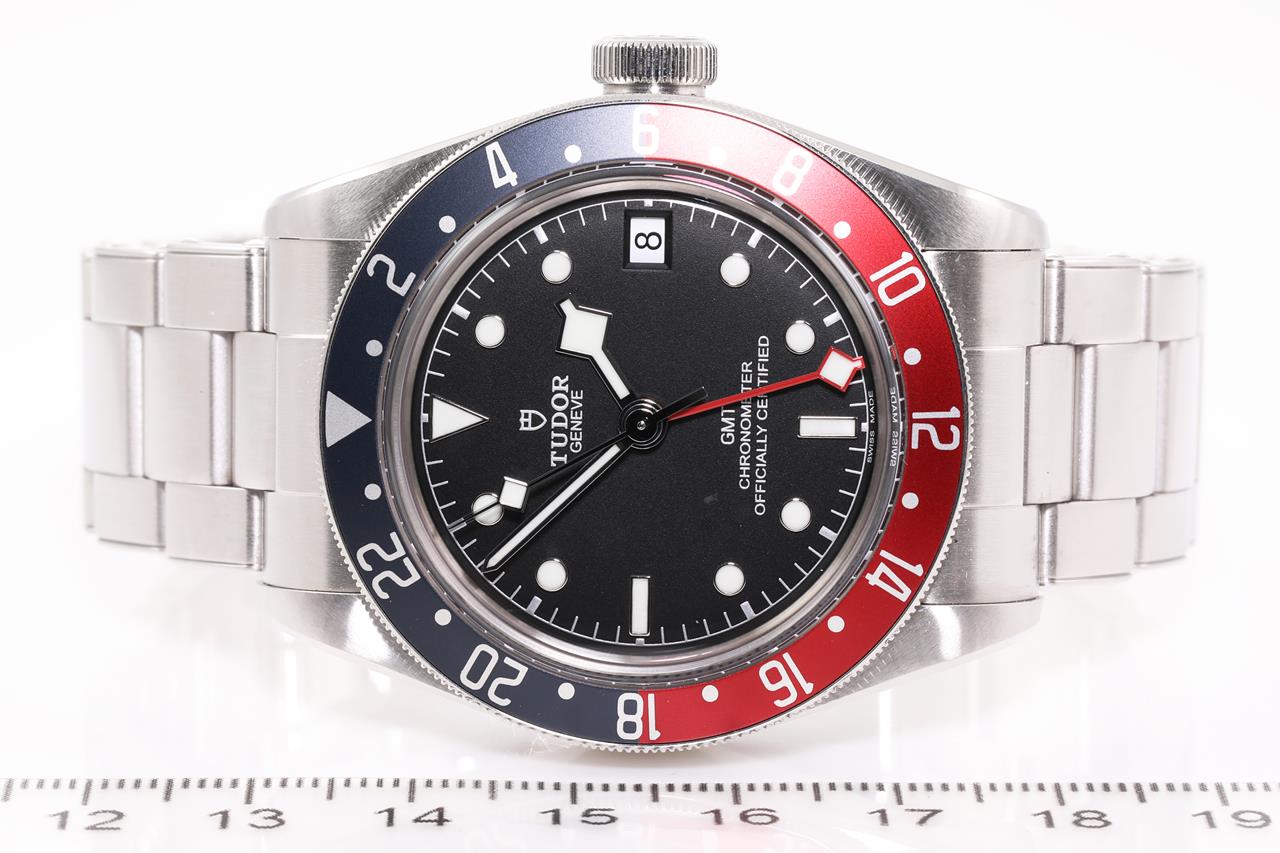 Tudor Black Bay GMT stainless steel automatic mens watch. Black dial, date, case diameter: 41mm, wrist size: 19.5cm, Swiss made. Ref# 79830RB. With Tudor stainless steel bracelet and clasp. With Certificate of authenticity, Tudor International guarantee card dated March 15, 2019 and Tudor box. 3 month FSA warranty. (Pre-owned)
