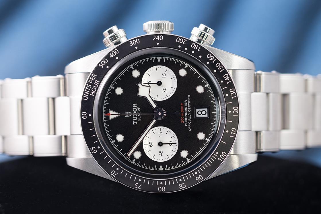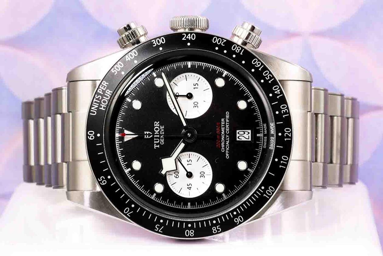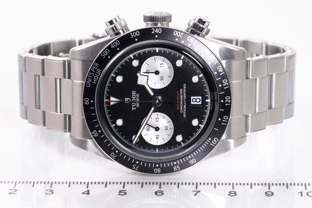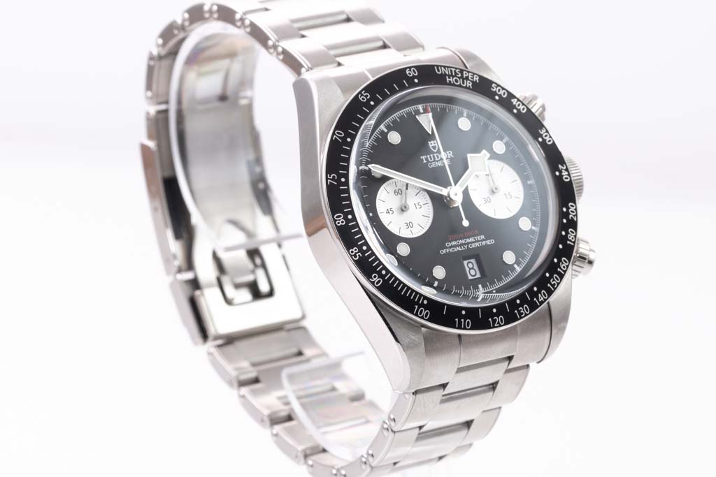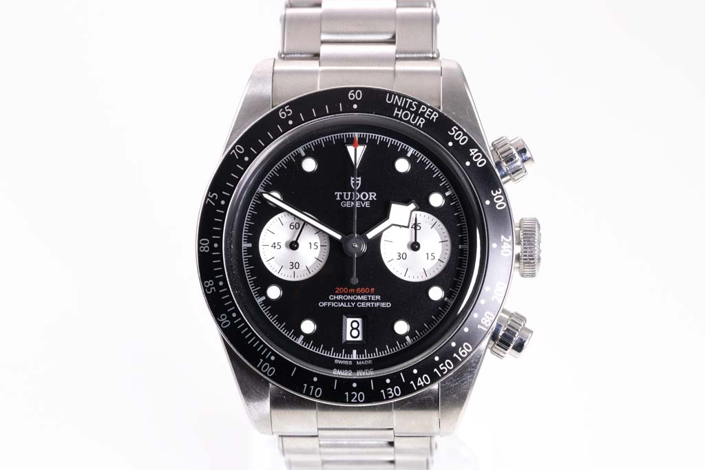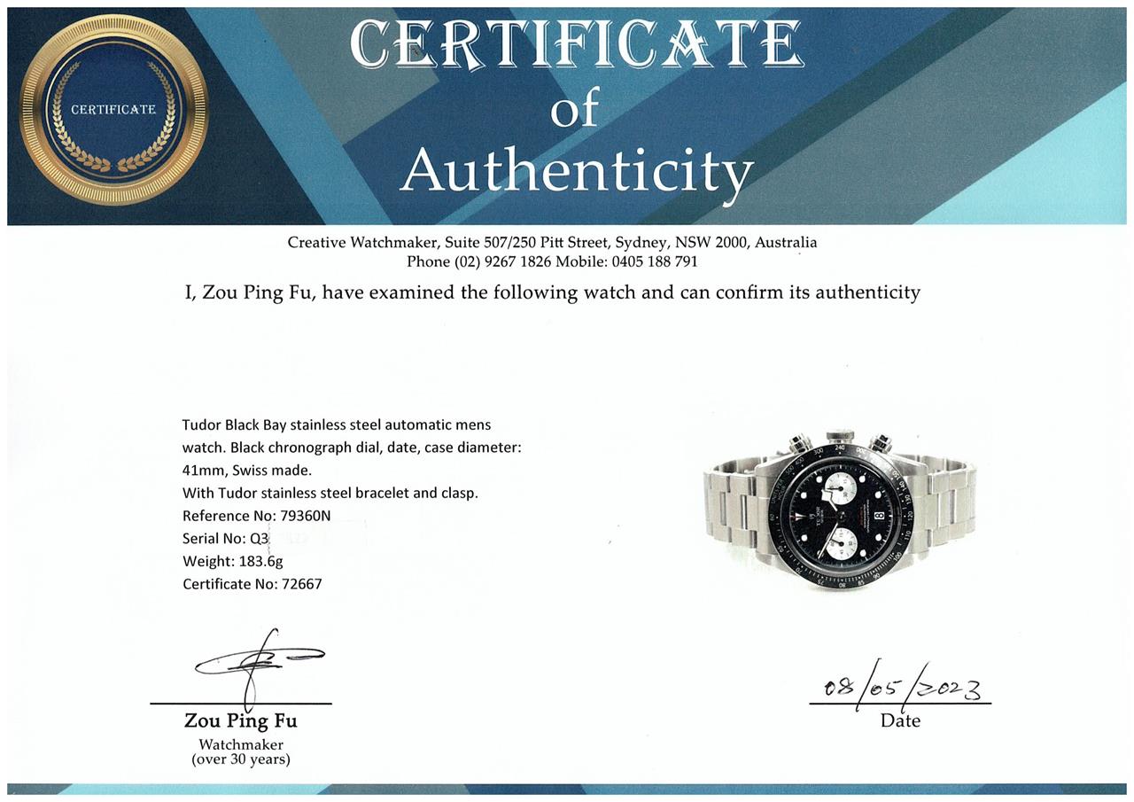 Tudor Black Bay stainless steel automatic mens watch. Black chronograph dial, date, case diameter: 41mm, wrist size: 20.5cm, Swiss made. Ref# 79360N. With Tudor stainless steel bracelet and clasp. With Certificate of Authenticity, Tudor International Guarantee card dated 08/04/2021 and Tudor box. Balance of 5 year Tudor manufacturer warranty applies. (Pre-owned)