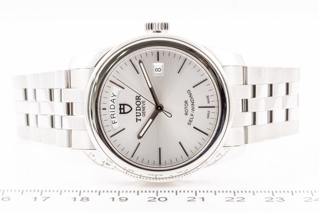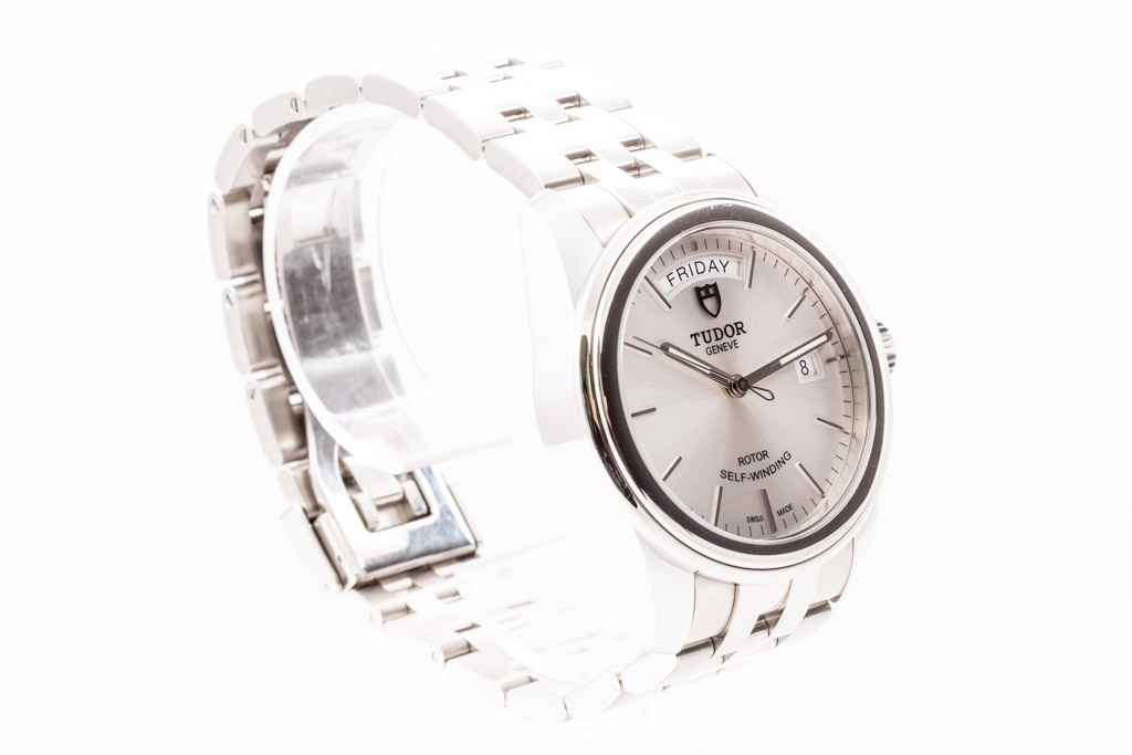 Tudor Glamour Day-Date stainless steel automatic mens watch. Silver dial, day & date, case diameter: 39mm, wrist size: 19cm, Swiss made. Ref# 56000. With Tudor stainless steel bracelet and clasp. With Certificate of Authenticity, Tudor International Guarantee Card dated 29/09/2022, Tudor Guarantee Booklet and Tudor box. Balance of 5 year Tudor Warranty. (Pre-owned)