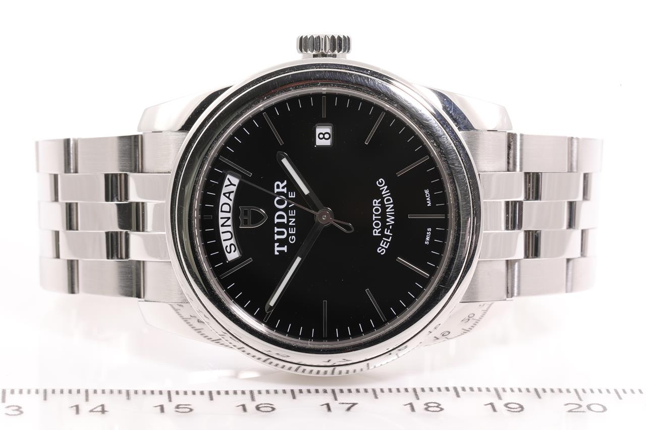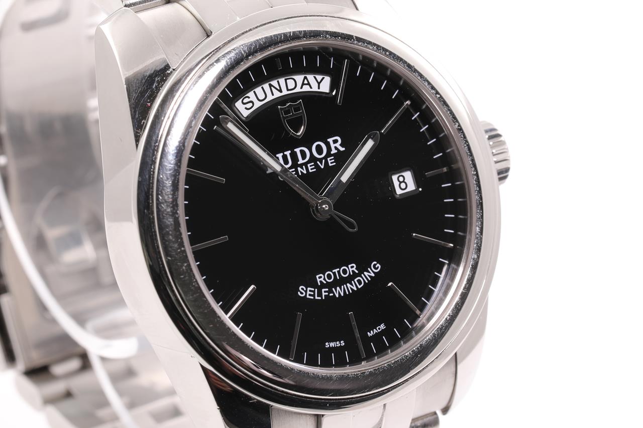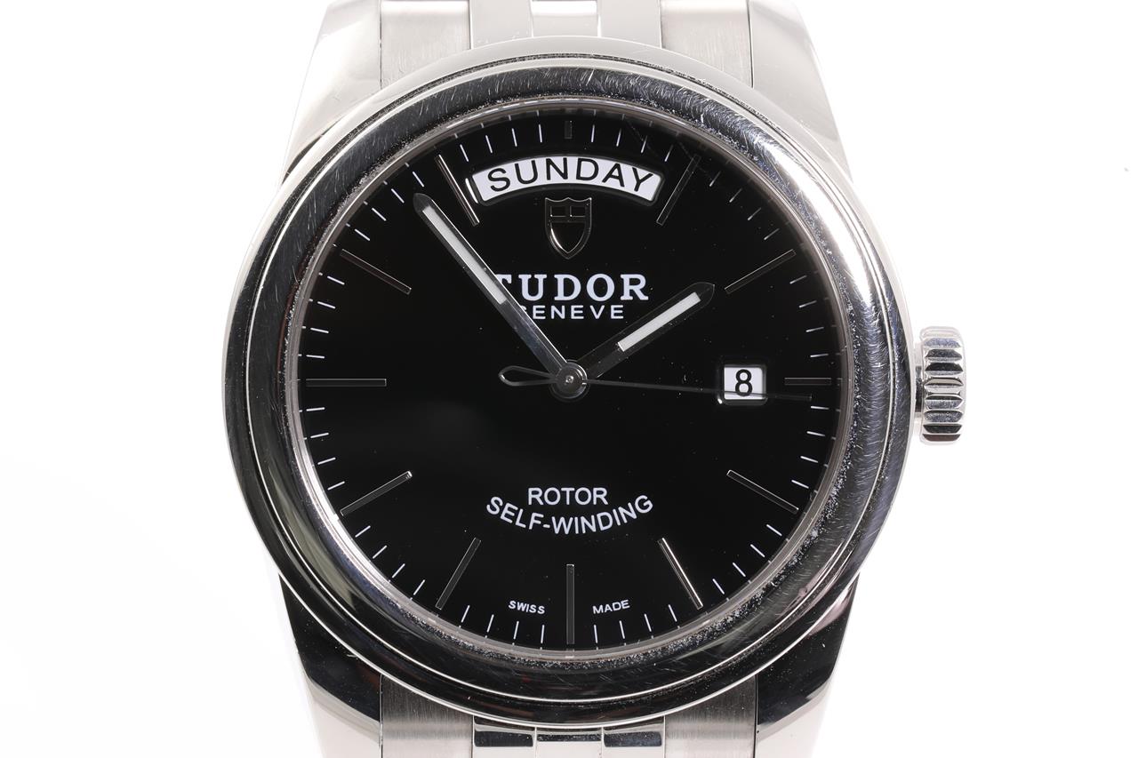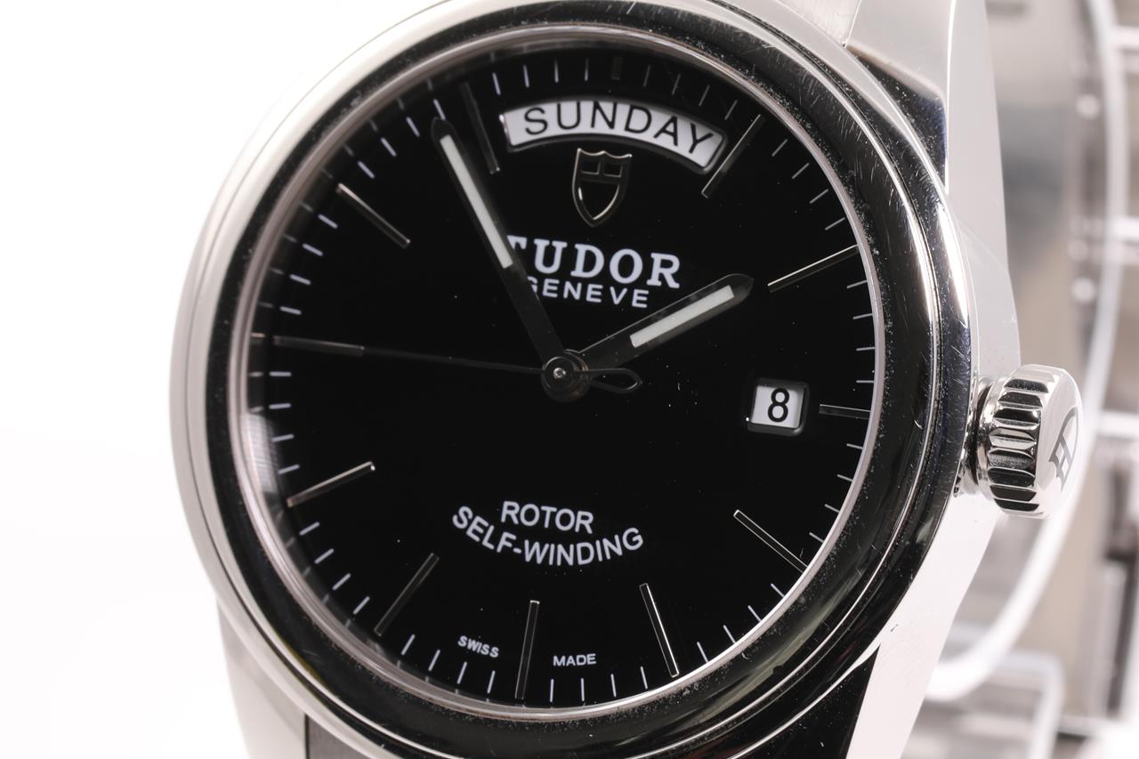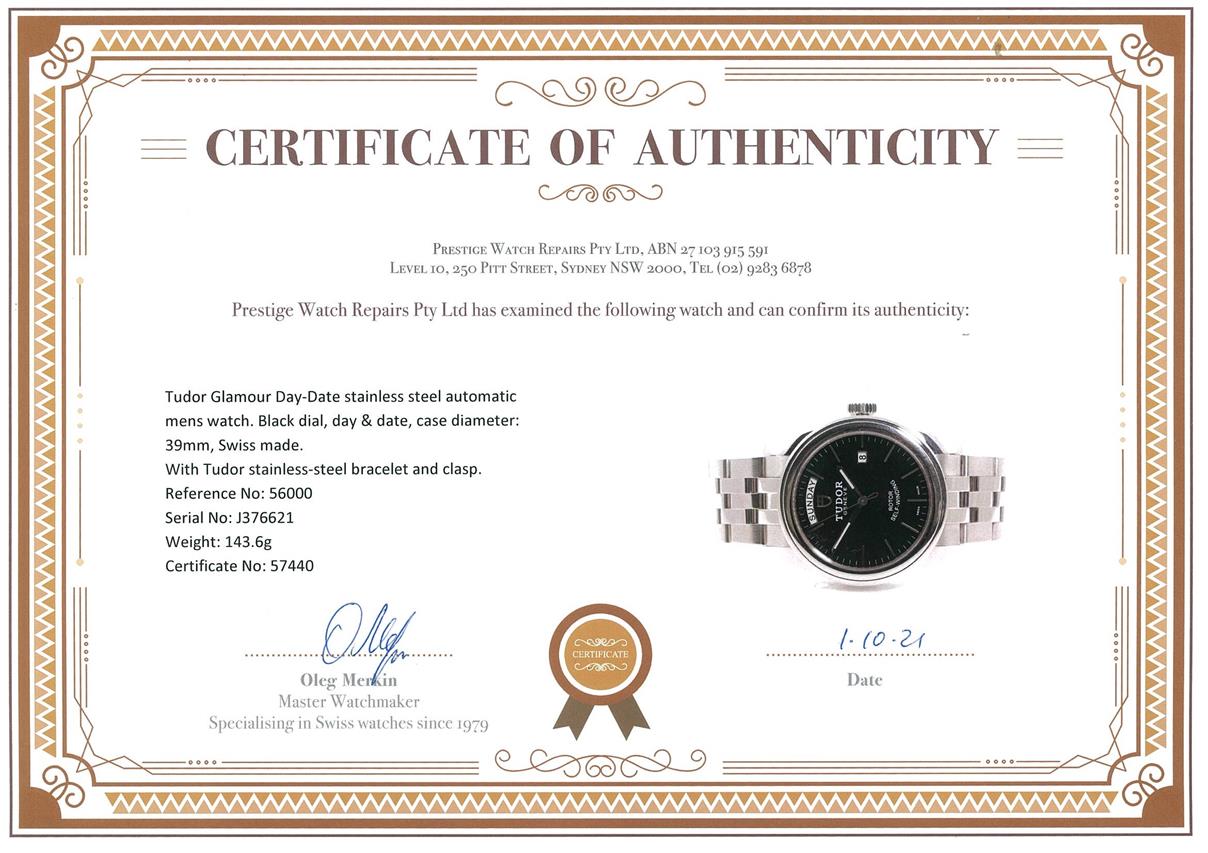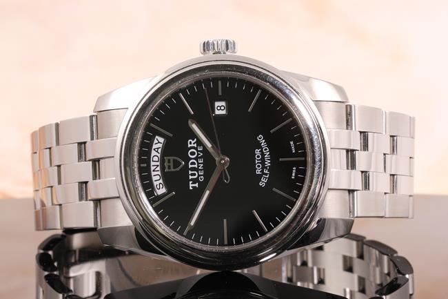 Tudor Glamour Day-Date stainless steel automatic mens watch. Black dial, day & date, case diameter: 39mm, wrist size: 17cm, Swiss made. Ref# 56000. With Tudor stainless steel bracelet and clasp. With certificate of authenticity. 3 month FSA warranty. (Pre-owned)