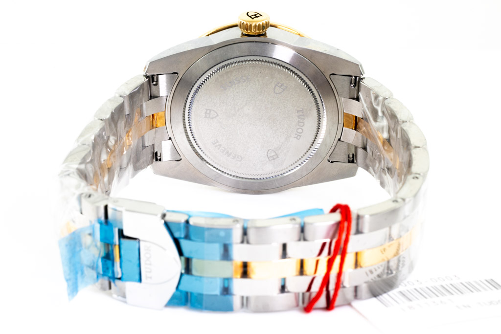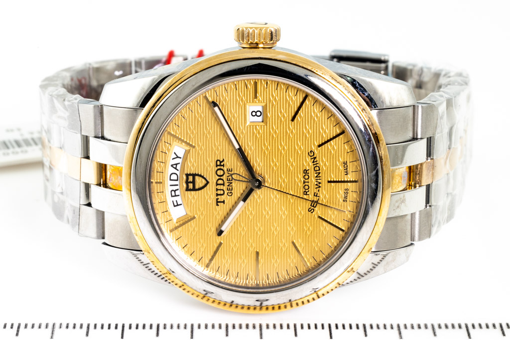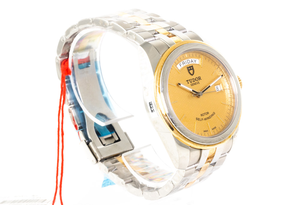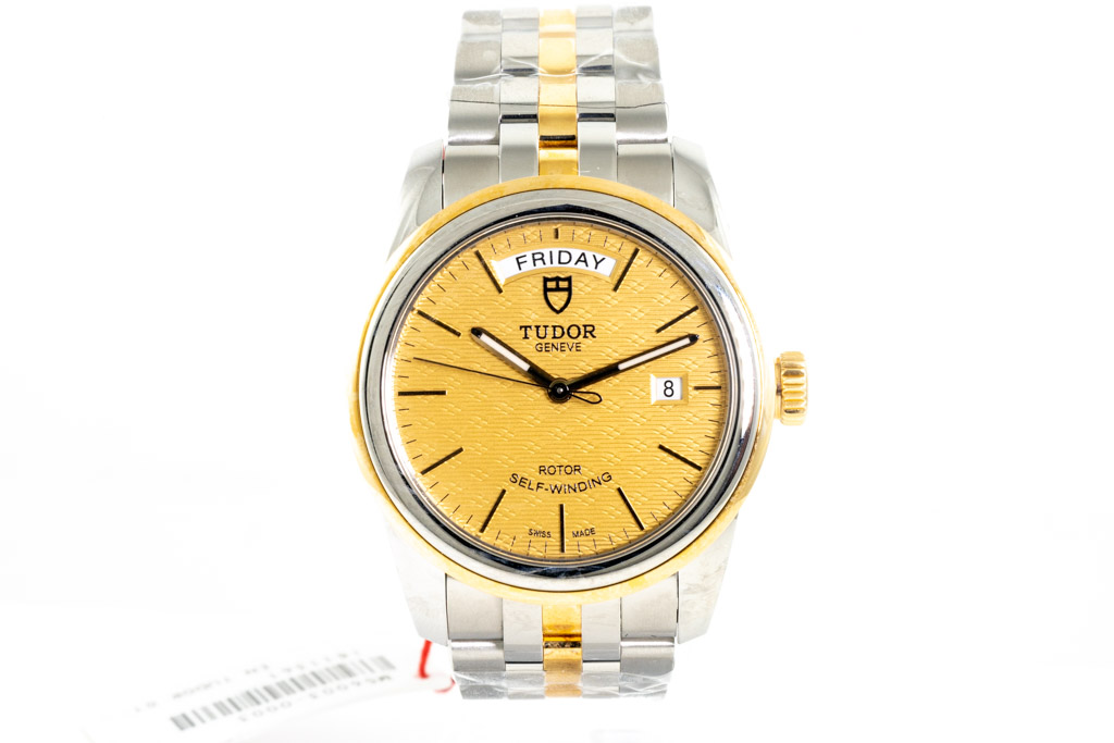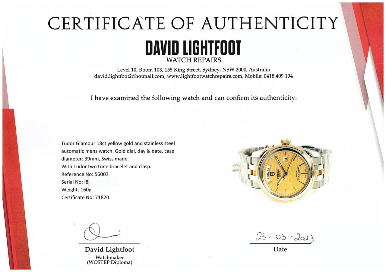 Tudor Glamour 18ct yellow gold and stainless steel automatic mens watch. Gold dial, day & date, case diameter: 39mm, wrist size: 19cm, Swiss made. Ref# 56003. With Tudor two tone bracelet and clasp. With Certificate and Authenticity, Tudor International Guarantee card dated 19/01/23 and Tudor box. Balance of 5 year Tudor warranty. (Pre-owned, Note: bracelet and case in original wrap)