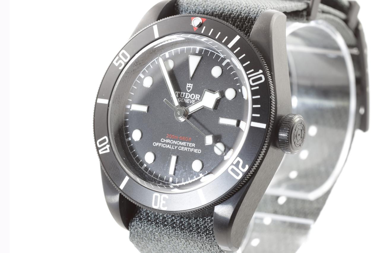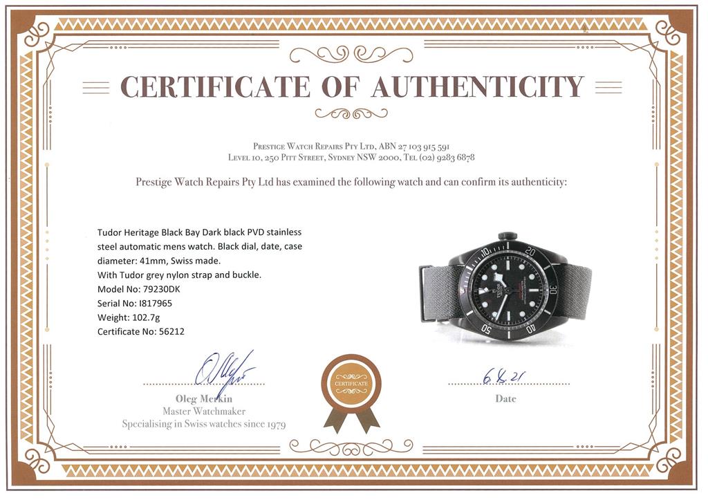 Tudor Heritage Black Bay Dark black PVD stainless steel automatic mens watch. Black dial, date, case diameter: 41mm, length: 20cm, Swiss made. Ref #79230DK. With Tudor grey nylon strap and buckle. With Tudor warranty card dated 19/6/2021, certificate of authenticity and Tudor box. 3 month FSA warranty. (Pre-owned)