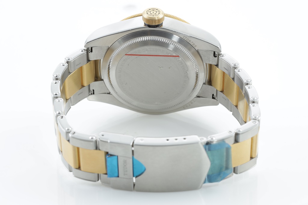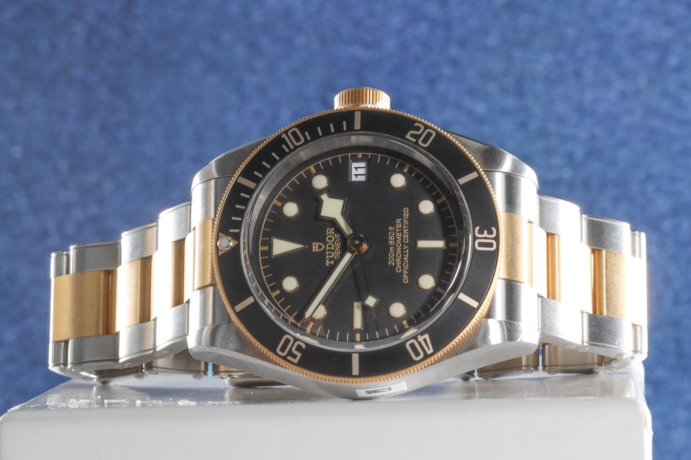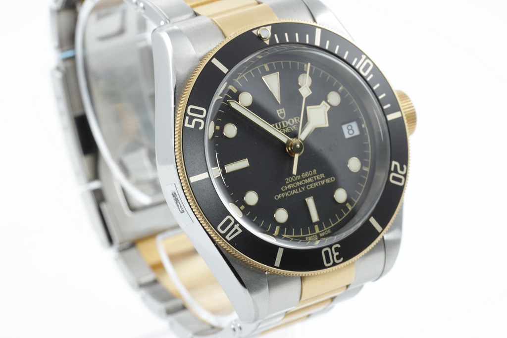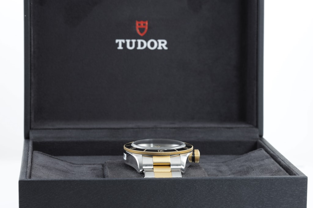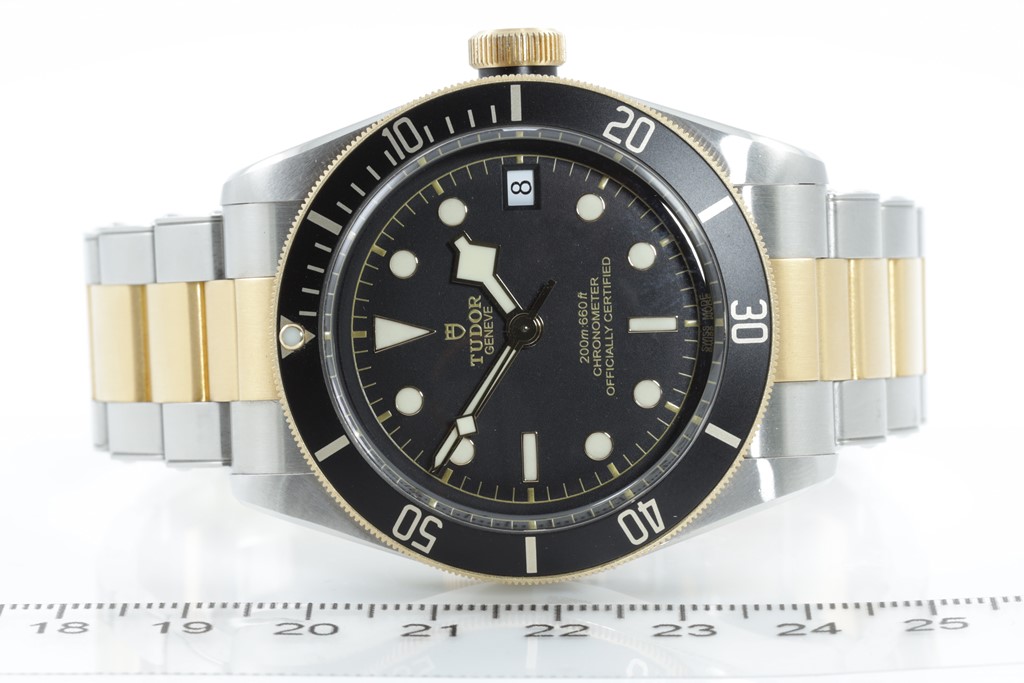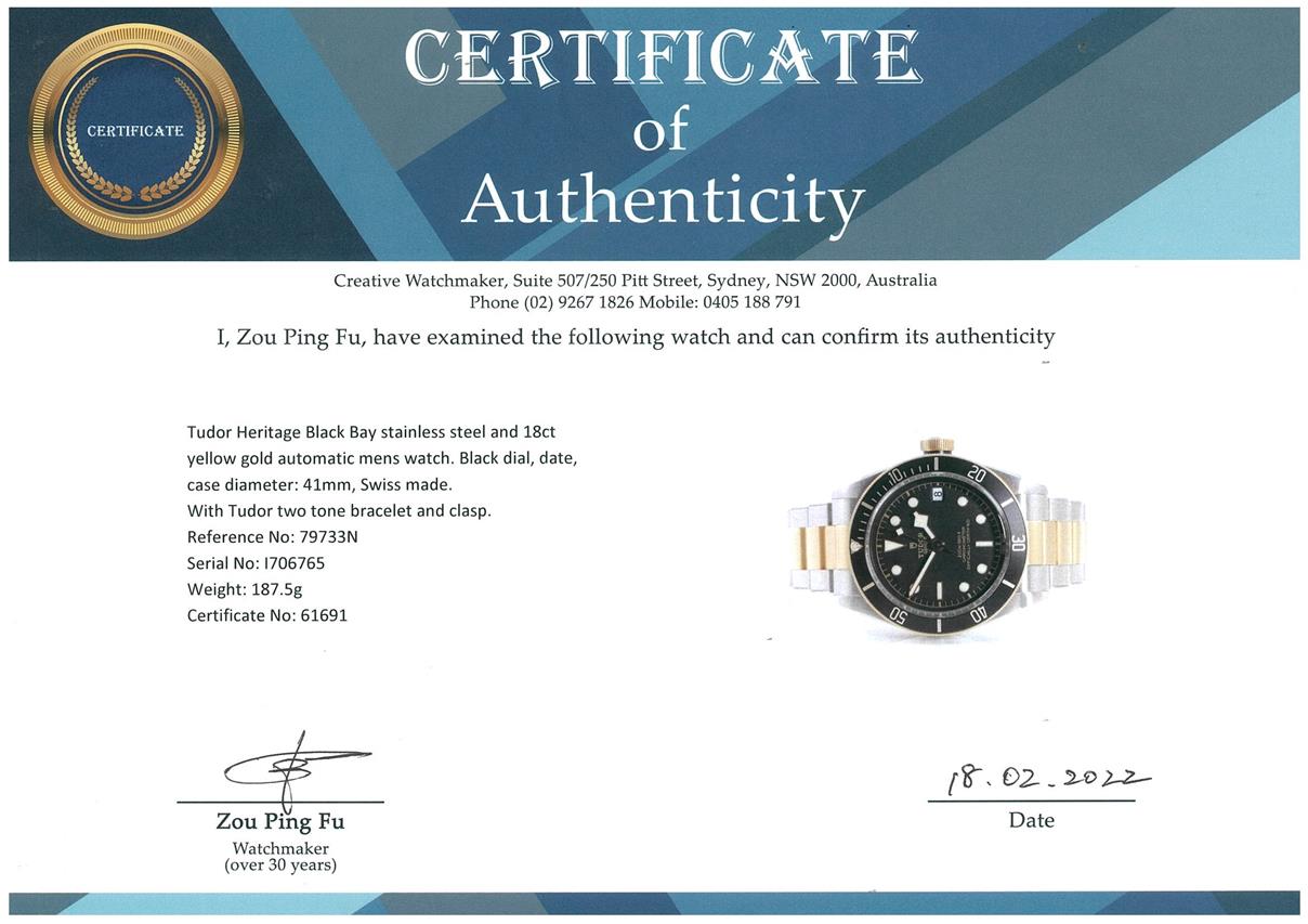 Tudor Heritage Black Bay stainless steel and 18ct yellow gold automatic mens watch. Black dial, date, case diameter: 41mm, wrist size: 18.5cm, Swiss made. Ref# 79733N. With Tudor two tone bracelet and clasp. With Certificate of Authenticity, Tudor Guarantee Card dated 15/05/2019 and Tudor box. 3 month FSA warranty. (Pre-owned)