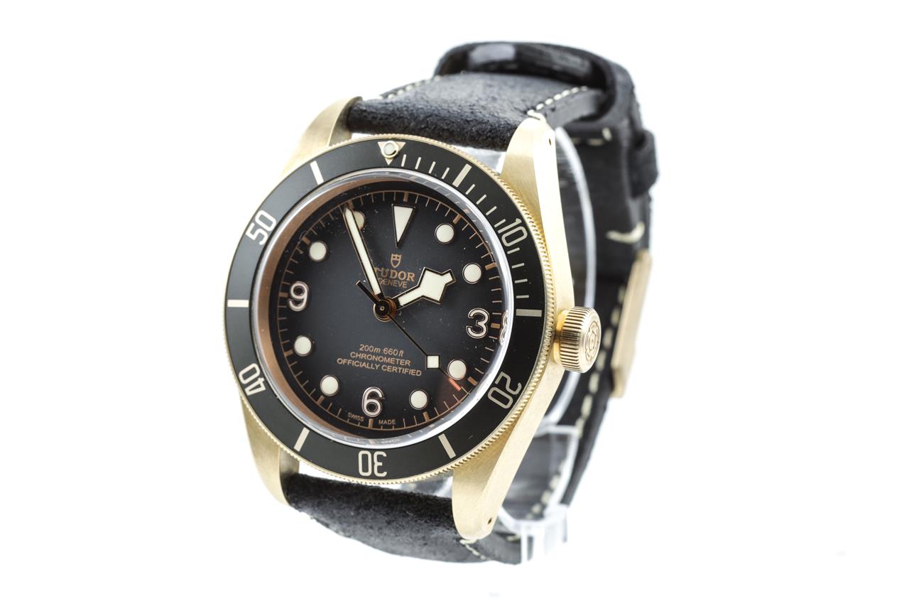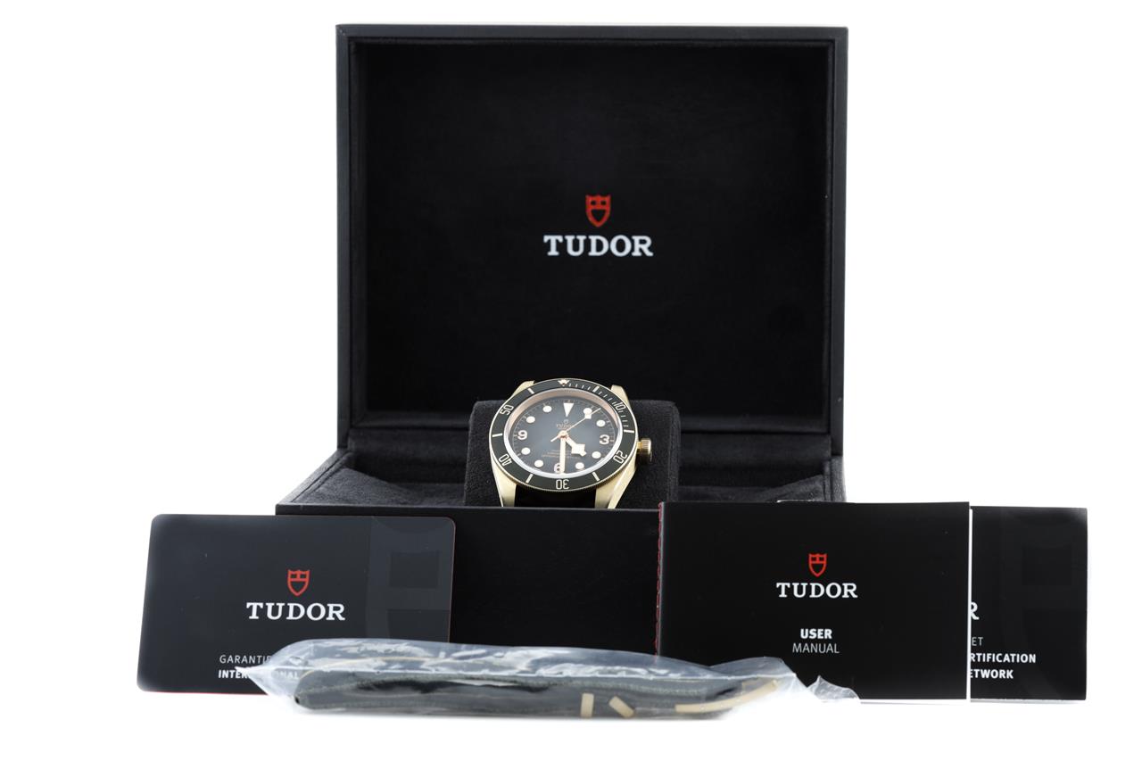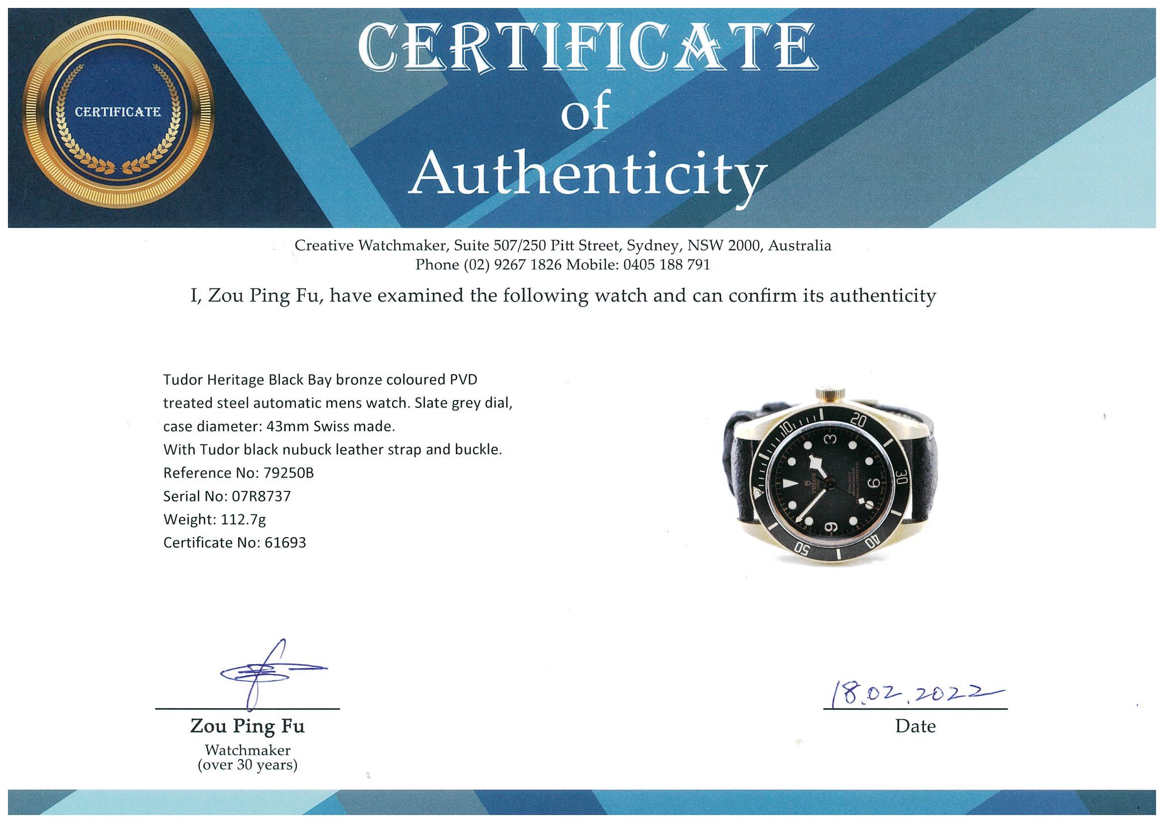 Tudor Heritage Black Bay bronze automatic mens watch. Slate grey dial, case diameter: 43mm, length: 20.5cm, Swiss made. Ref# 79250B. With Tudor black nubuck leather strap and buckle. With Certificate of Authenticity, Tudor International Guarantee Card dated 30/12/2021, spare fabric strap and Tudor box. 3 month FSA warranty. (Pre-owned)