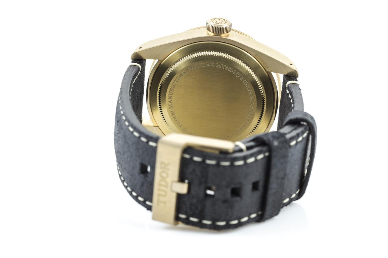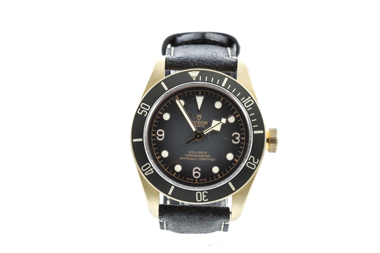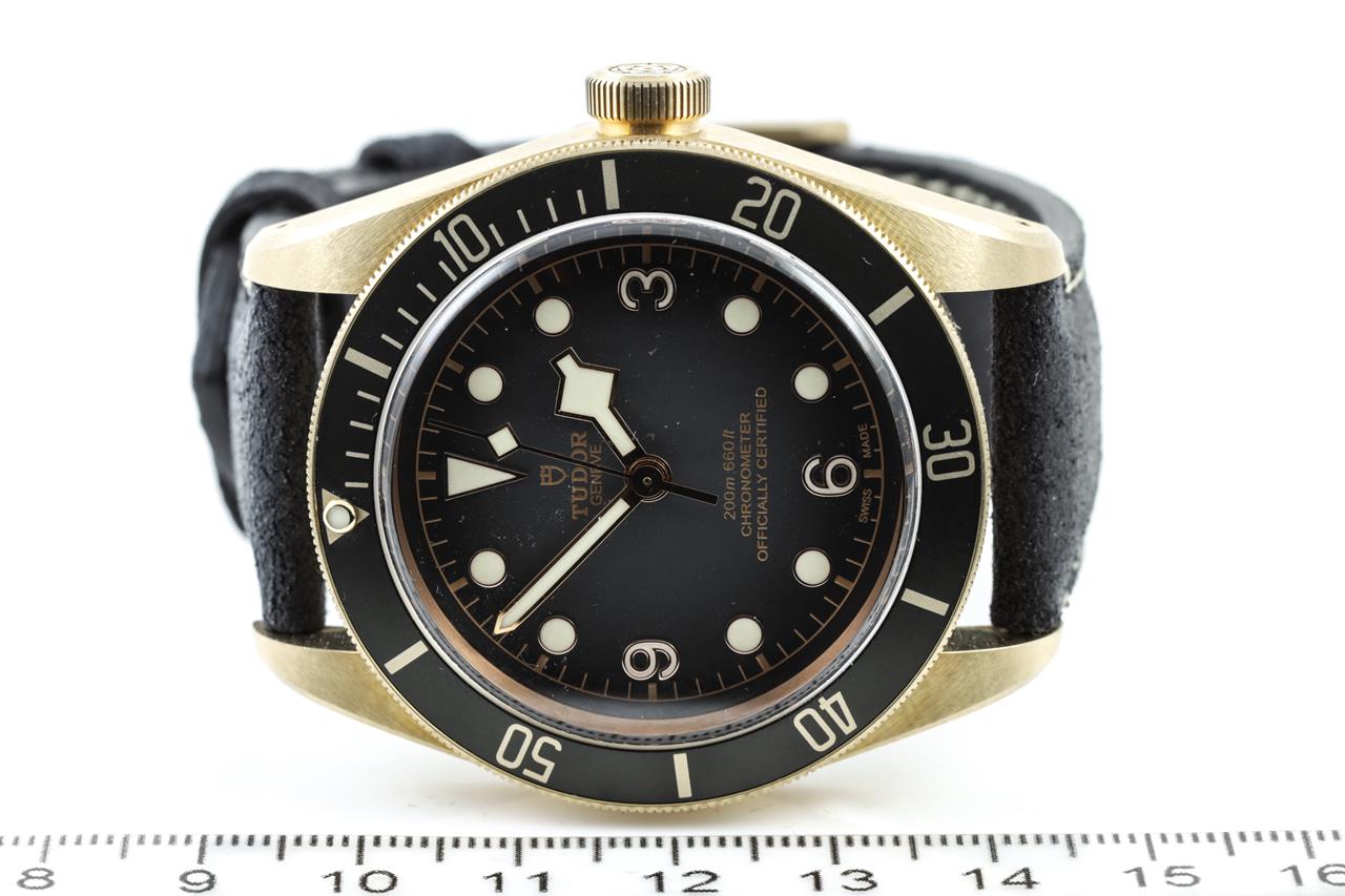Tudor Heritage Black Bay bronze automatic mens watch. Slate grey dial, case diameter: 43mm, length: 20.5cm, Swiss made. Ref# 79250B. With Tudor black nubuck leather strap and buckle. With Certificate of Authenticity, Tudor International Guarantee Card dated 30/12/2021, spare fabric strap and Tudor box. 3 month FSA warranty. (Pre-owned)
