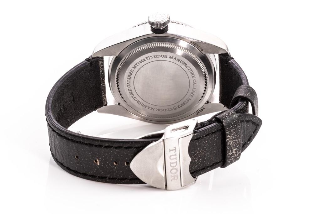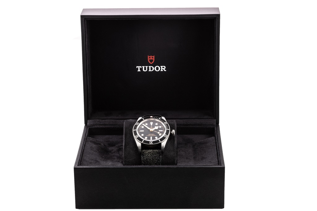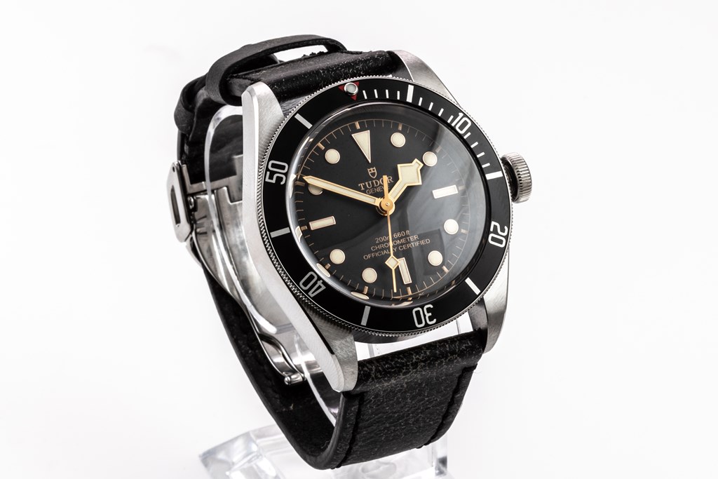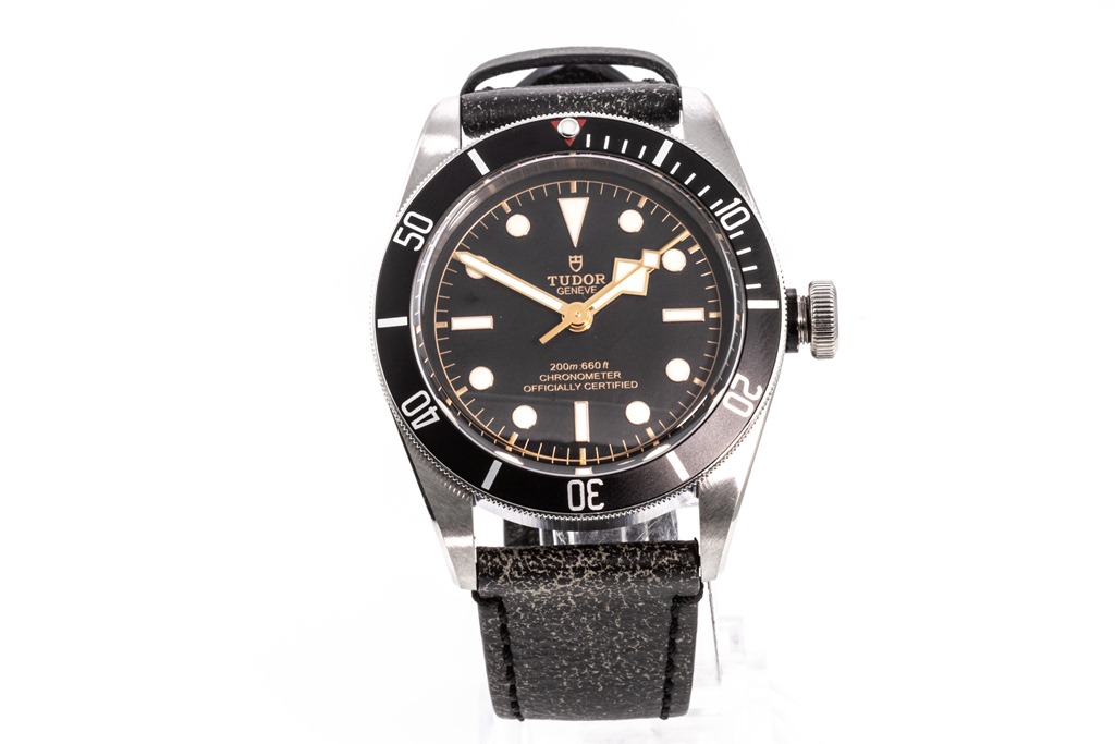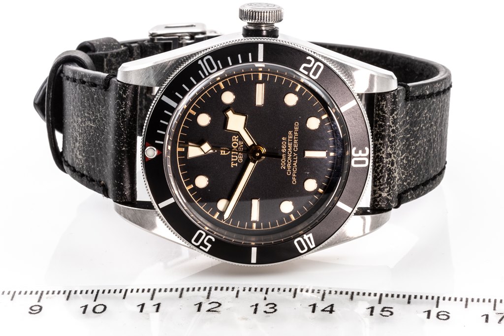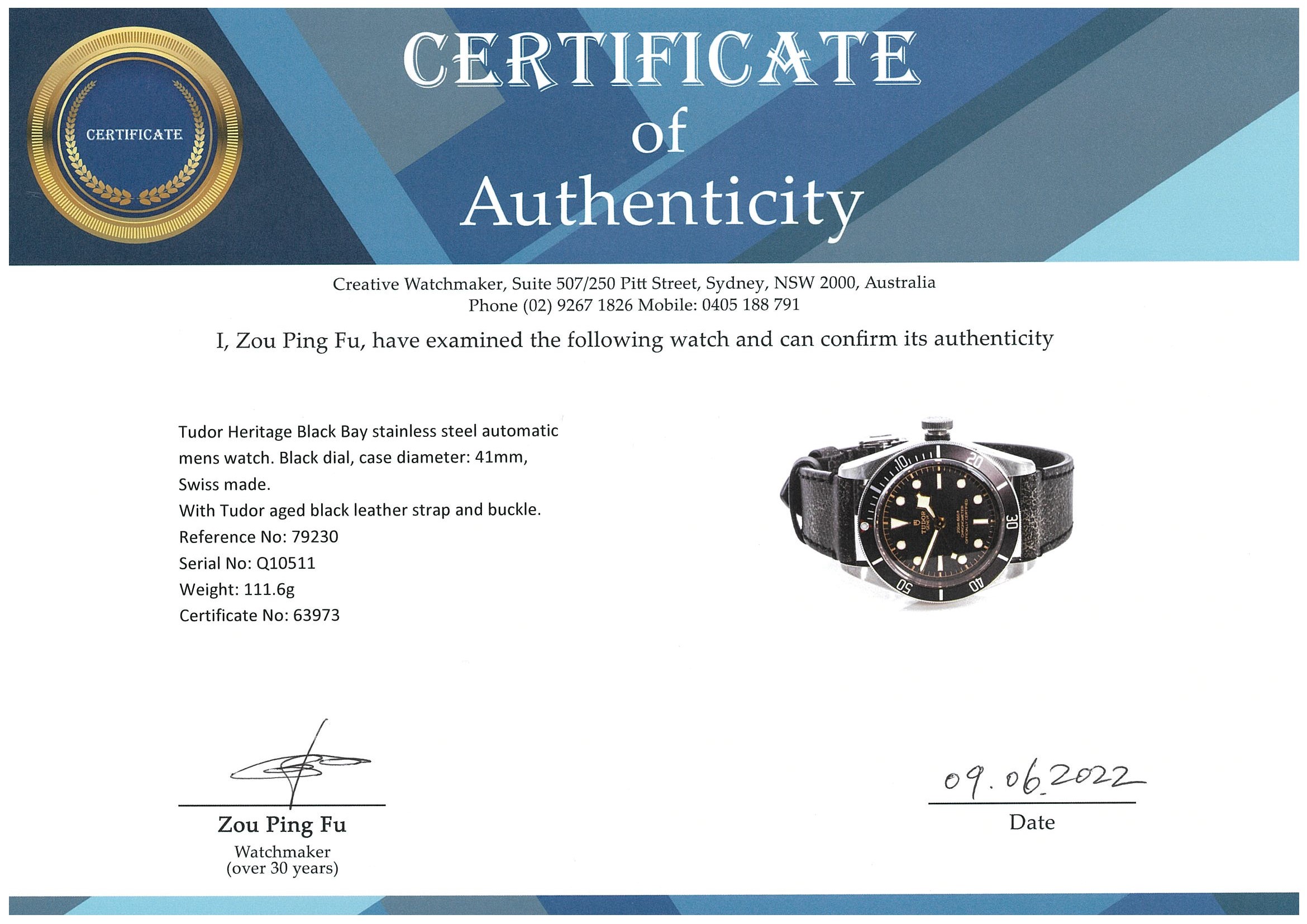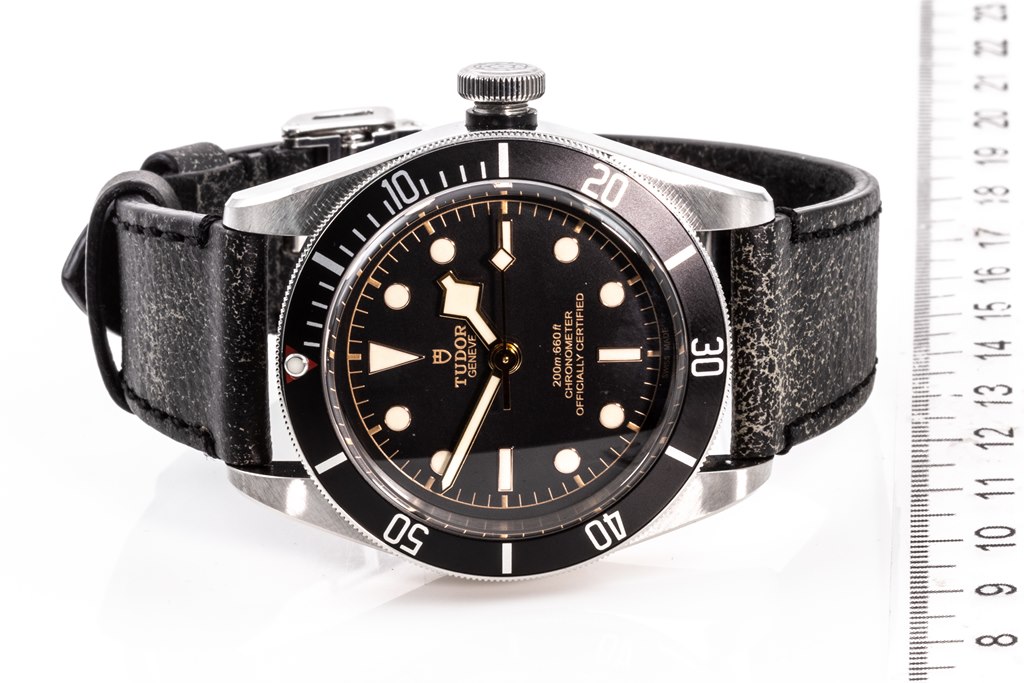 Tudor Heritage Black Bay stainless steel automatic mens watch. Black dial, case diameter: 41mm, wrist size: 19cm, Swiss made. Ref# 79230. With Tudor aged black leather strap and clasp. With Certificate of Authenticity and Tudor box. 3 month FSA warranty. (Pre-owned)