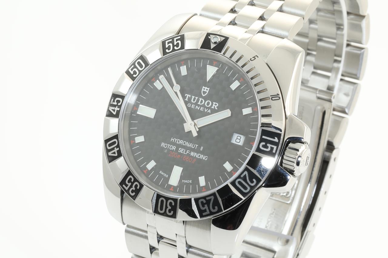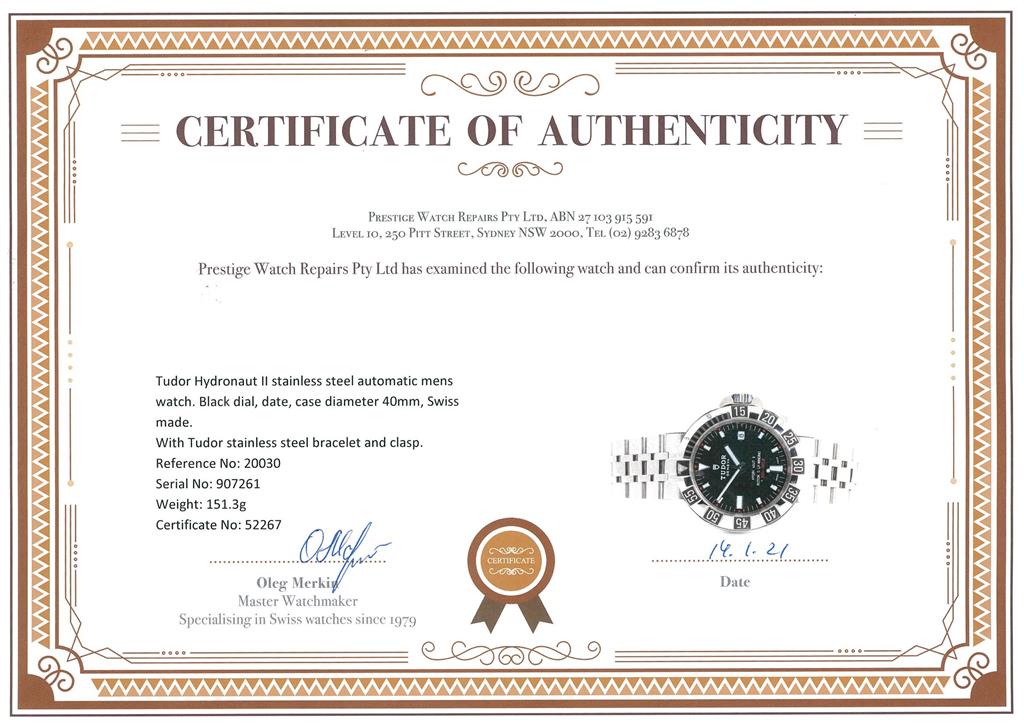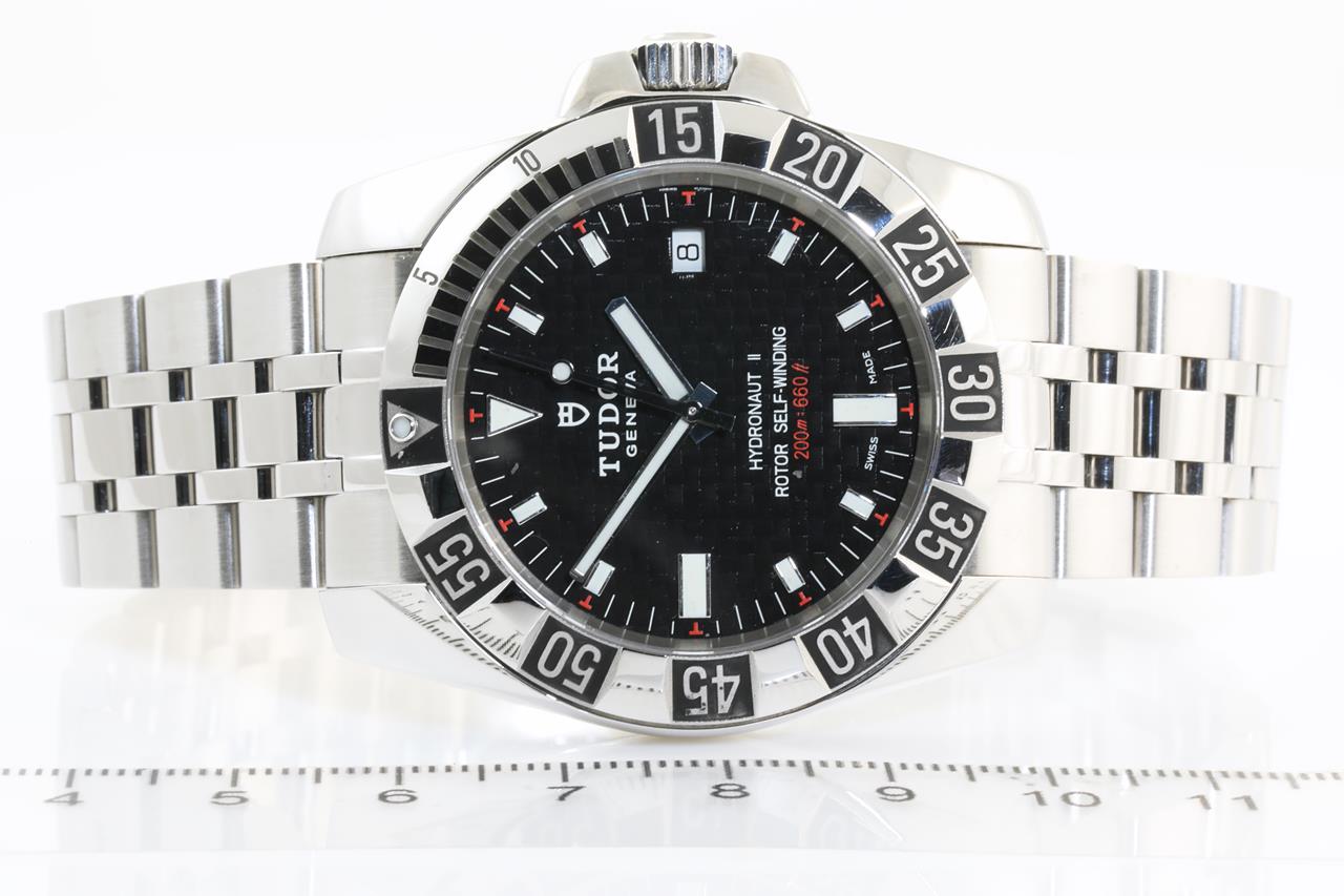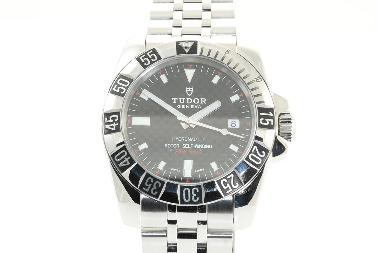 Tudor Hydronaut II stainless steel automatic mens watch. Black dial, date, case diameter 40mm, wrist size 20cm, Swiss made. Ref #20030. With Tudor stainless steel bracelet and clasp. With Certificate of Authenticity. Tudor guarantee card dated 14/07/2010 inside worn box. With 6 month Prestige watchmaker warranty from the date of full service. (Pre-owned)