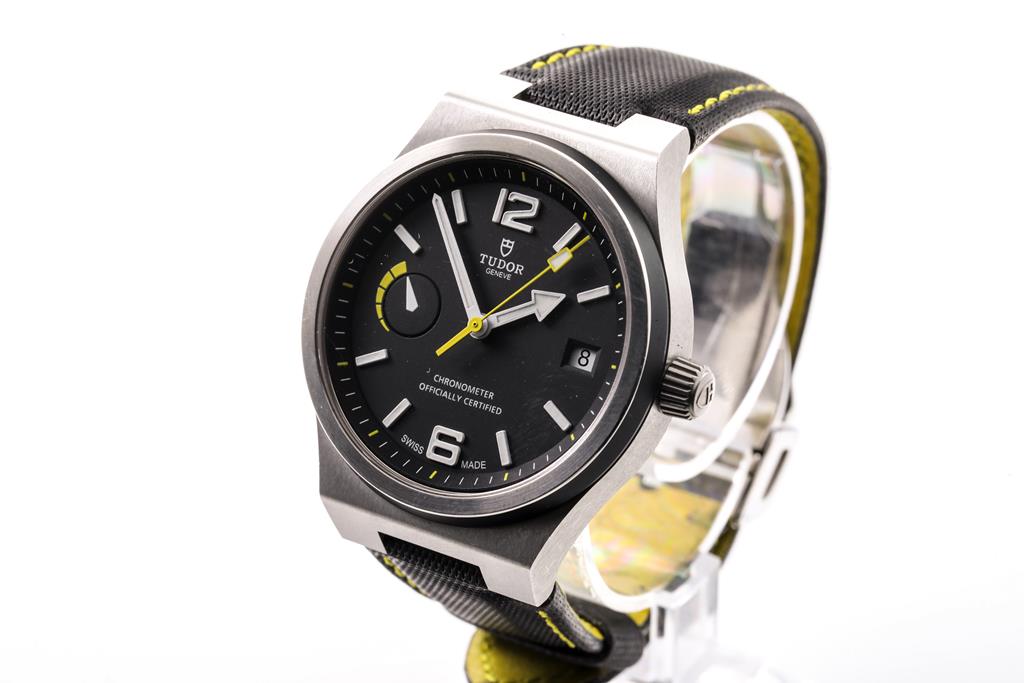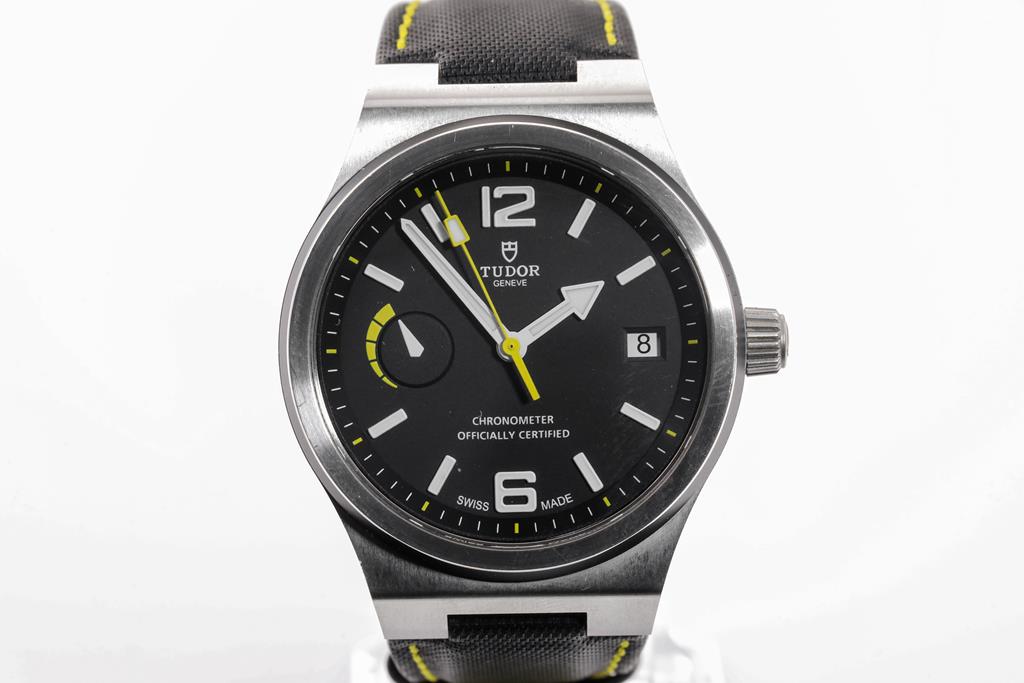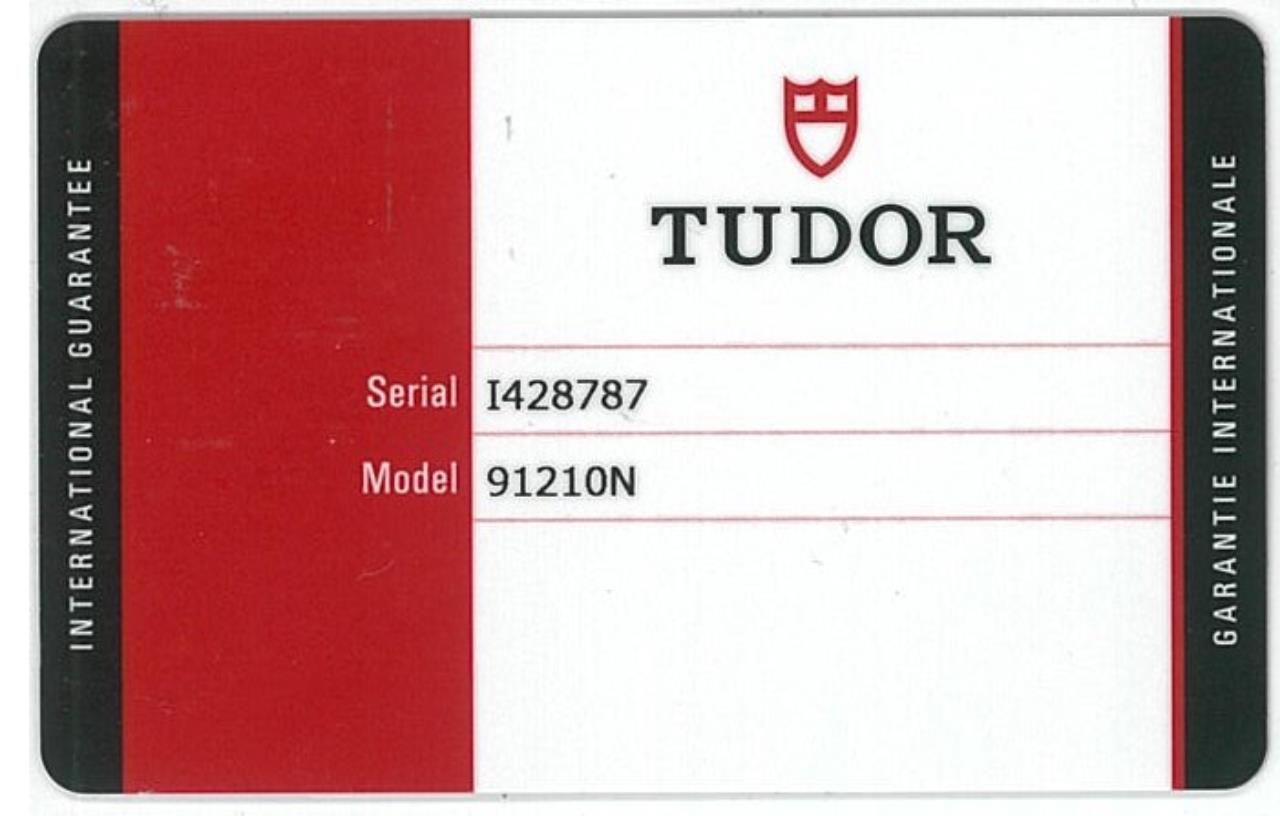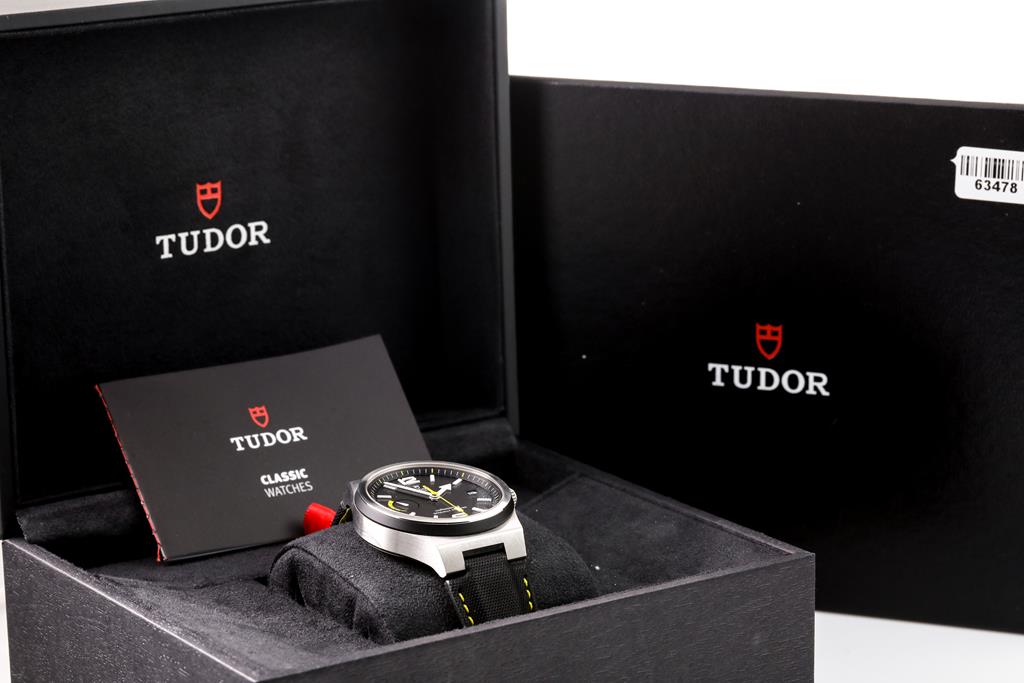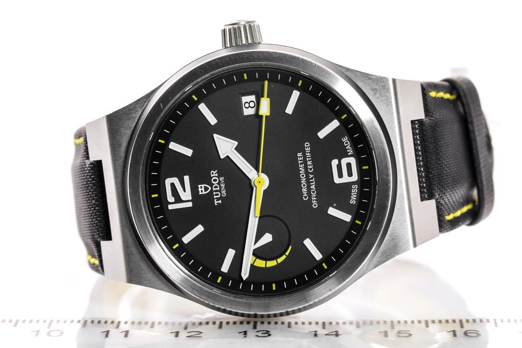 Tudor North Flag stainless steel automatic mens watch. Black dial, date, case diameter: 40mm, wrist size: 19cm, Swiss made. Ref# 91210N. With Tudor black leather strap and clasp. With Certificate of Authenticity, Tudor International certificate card dated 20/10/2019 and Tudor box. 3 month FSA warranty. (Pre-owned)
