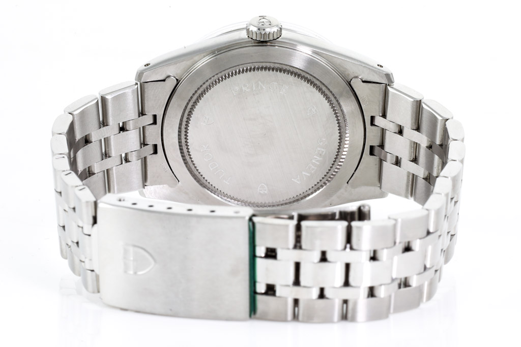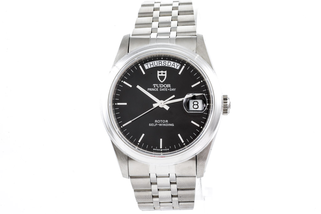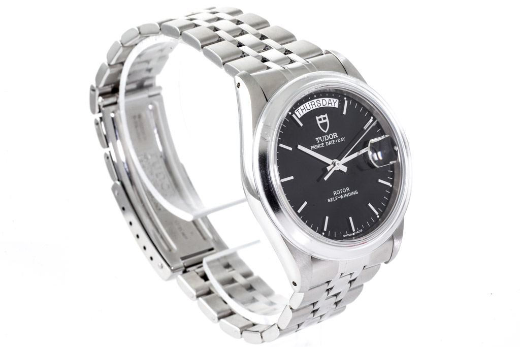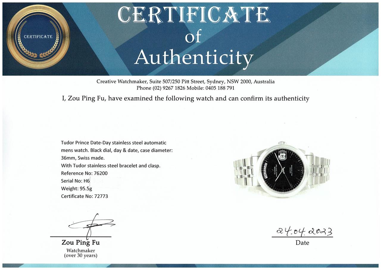Tudor Prince Date-Day stainless steel automatic mens watch. Black dial, day & date, case diameter: 36mm, wrist size: 18.5cm, Swiss made. Ref# 76200. With Tudor stainless steel bracelet and clasp. With Certificate of Authenticity, Tudor Guarantee certificate dated 08/2008 and Tudor box. 3 month FSA warranty. (Pre-owned)