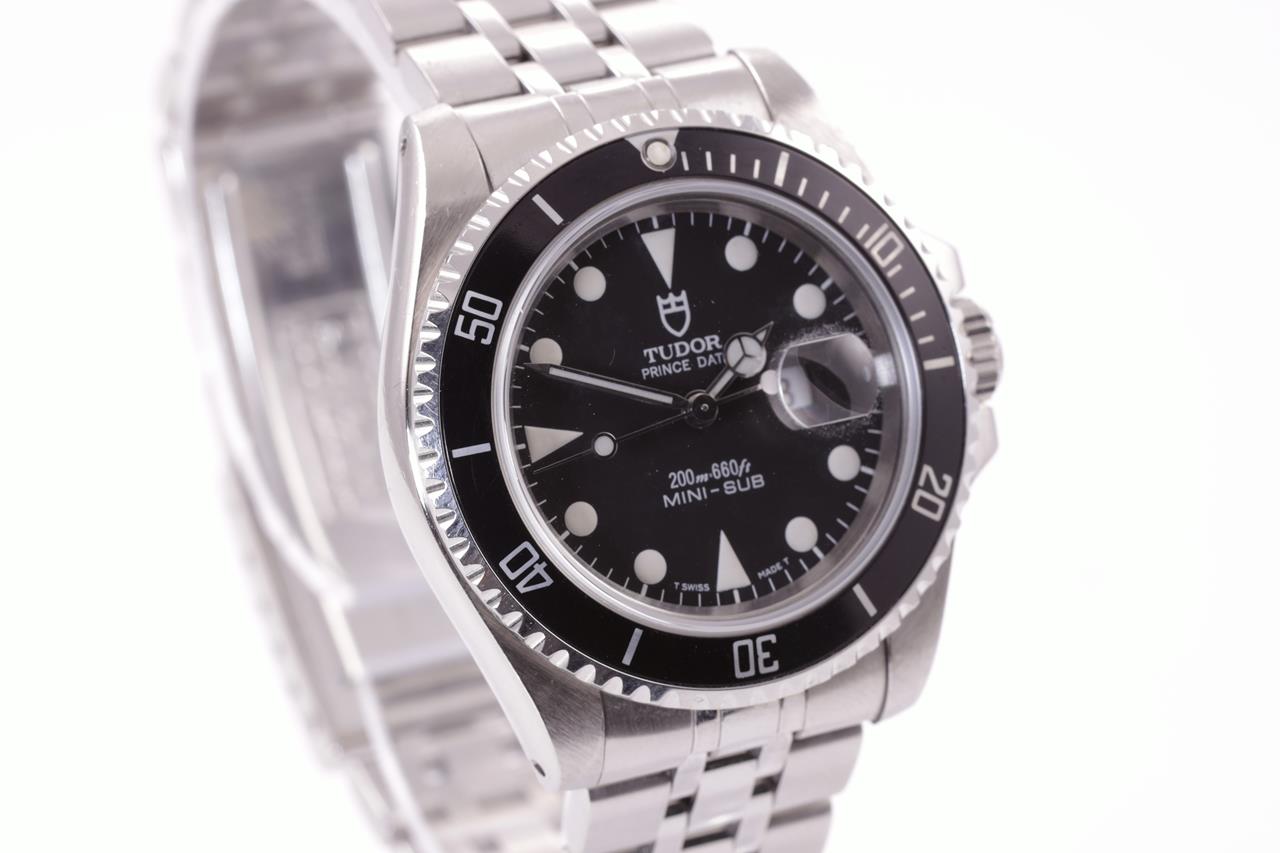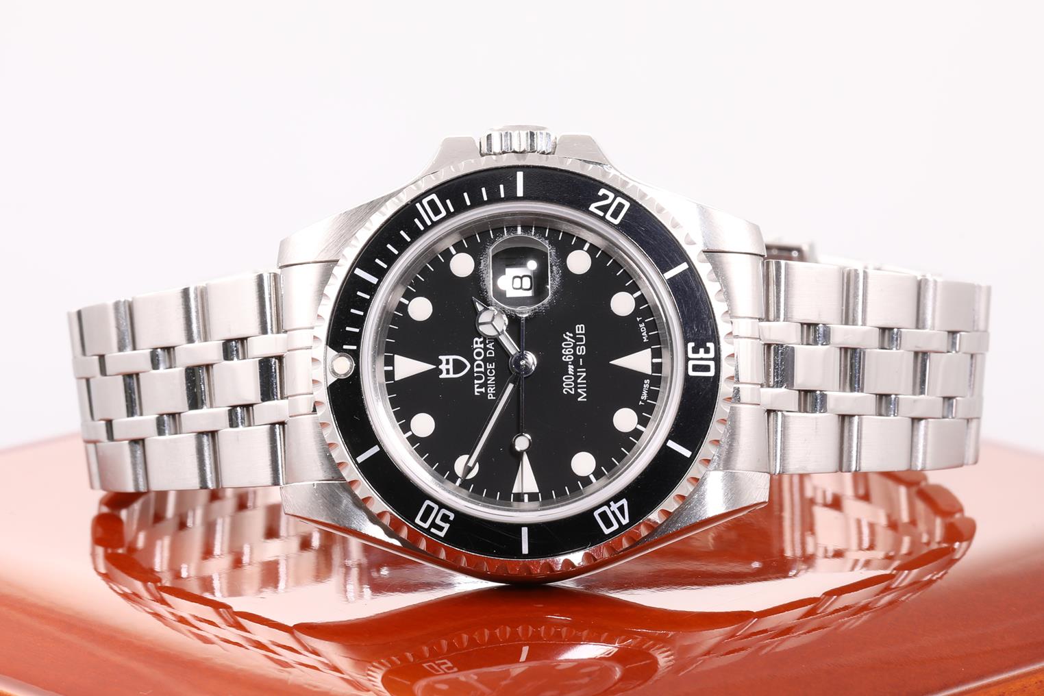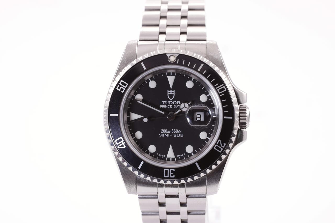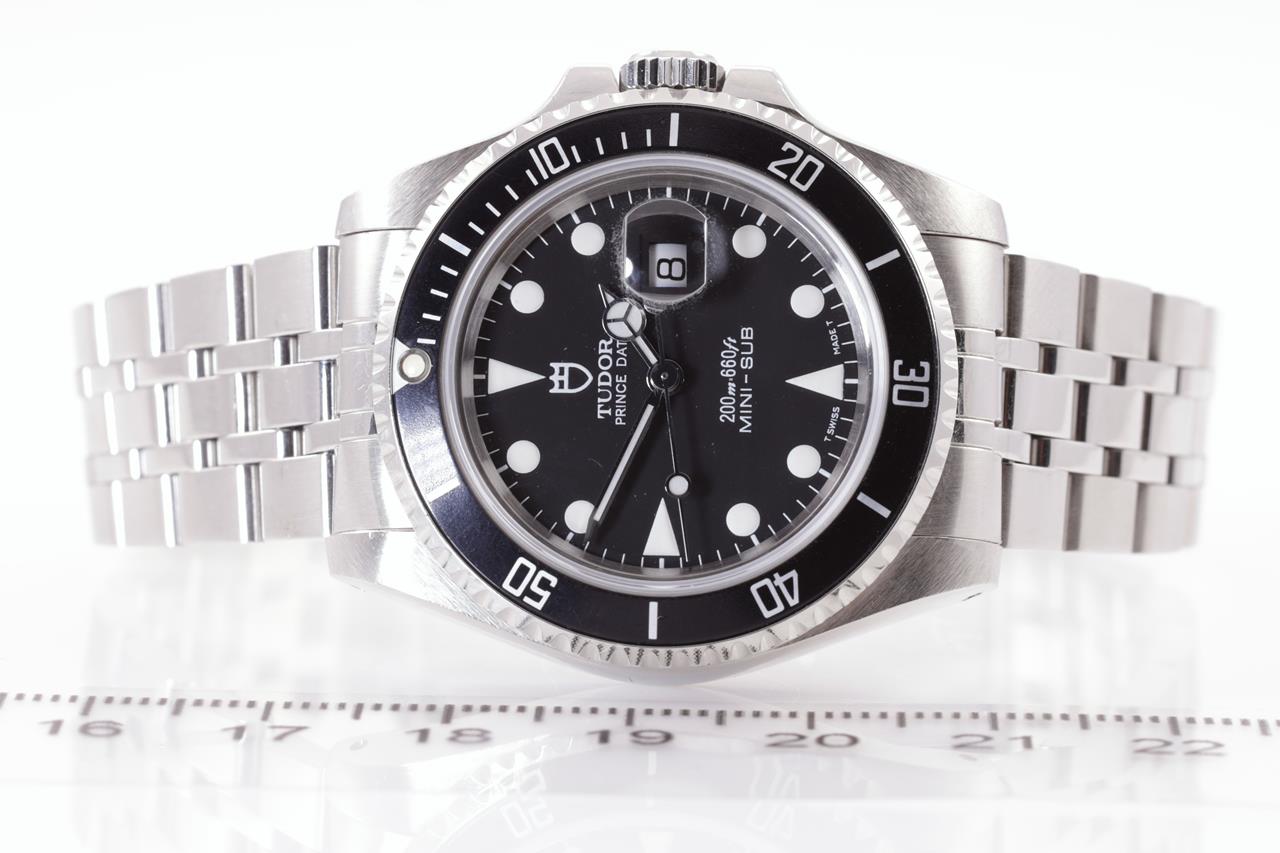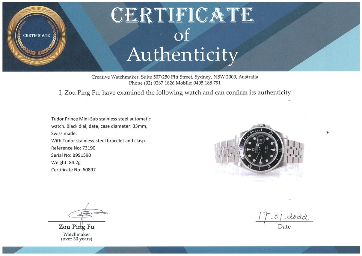 Tudor Prince Mini-Sub stainless steel automatic watch. Black dial, date, case diameter: 33mm, wrist size: 17.5cm, Swiss made. Ref# 73190. With Tudor stainless steel bracelet and clasp. With Certificate of Authenticity, Tudor Guarantee Certificate dated 26/01/2000. 3 month FSA warranty. (Pre-owned)