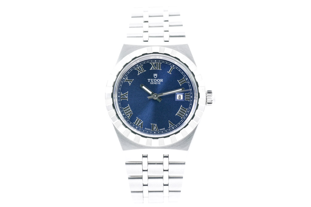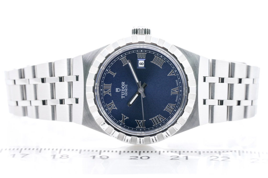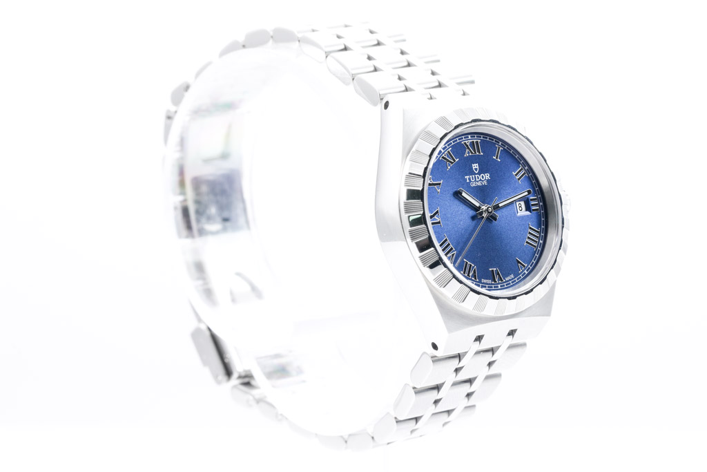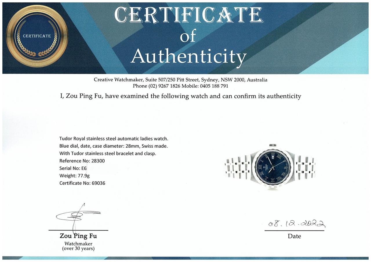 Tudor Royal stainless steel automatic ladies watch. Blue dial, date, case diameter: 28mm, wrist size: 16.5cm, Swiss made. Ref# 28300. With Tudor stainless steel bracelet and clasp. With Certificate of Authenticity, Tudor International Warranty Card dated 14/08/2021 and Tudor box. Balance of 5 year Tudor Warranty (Pre-owned)