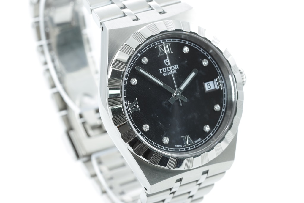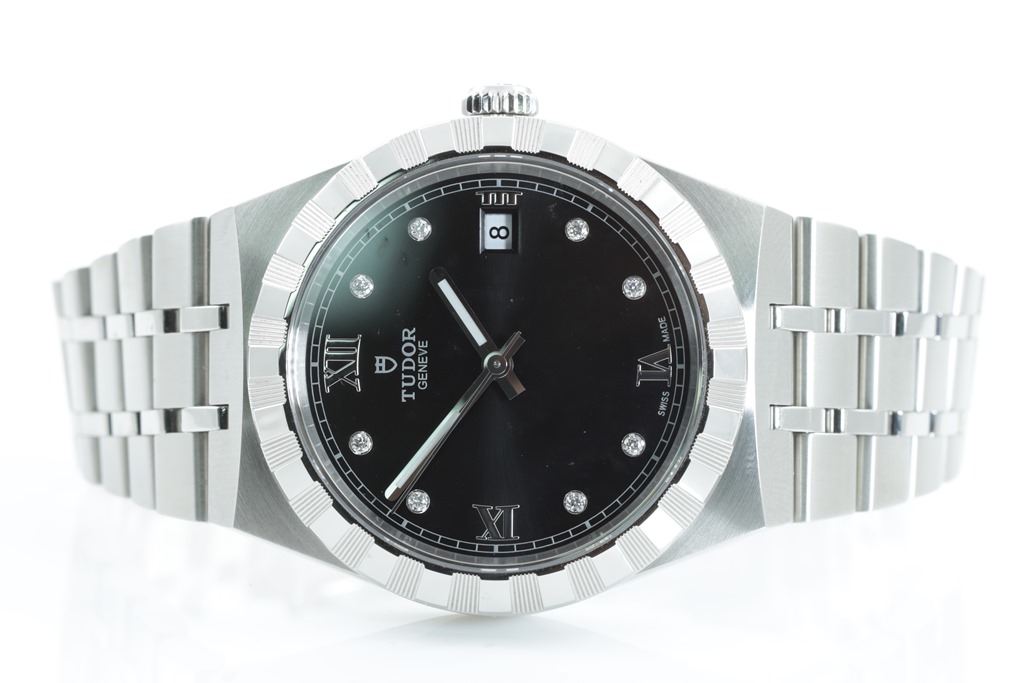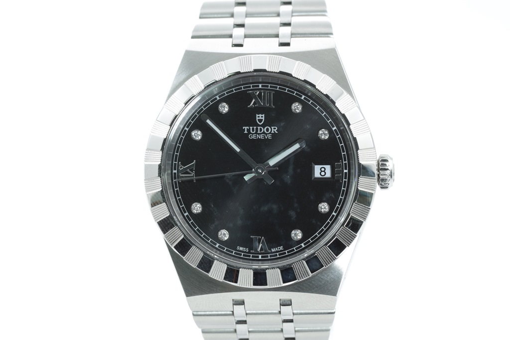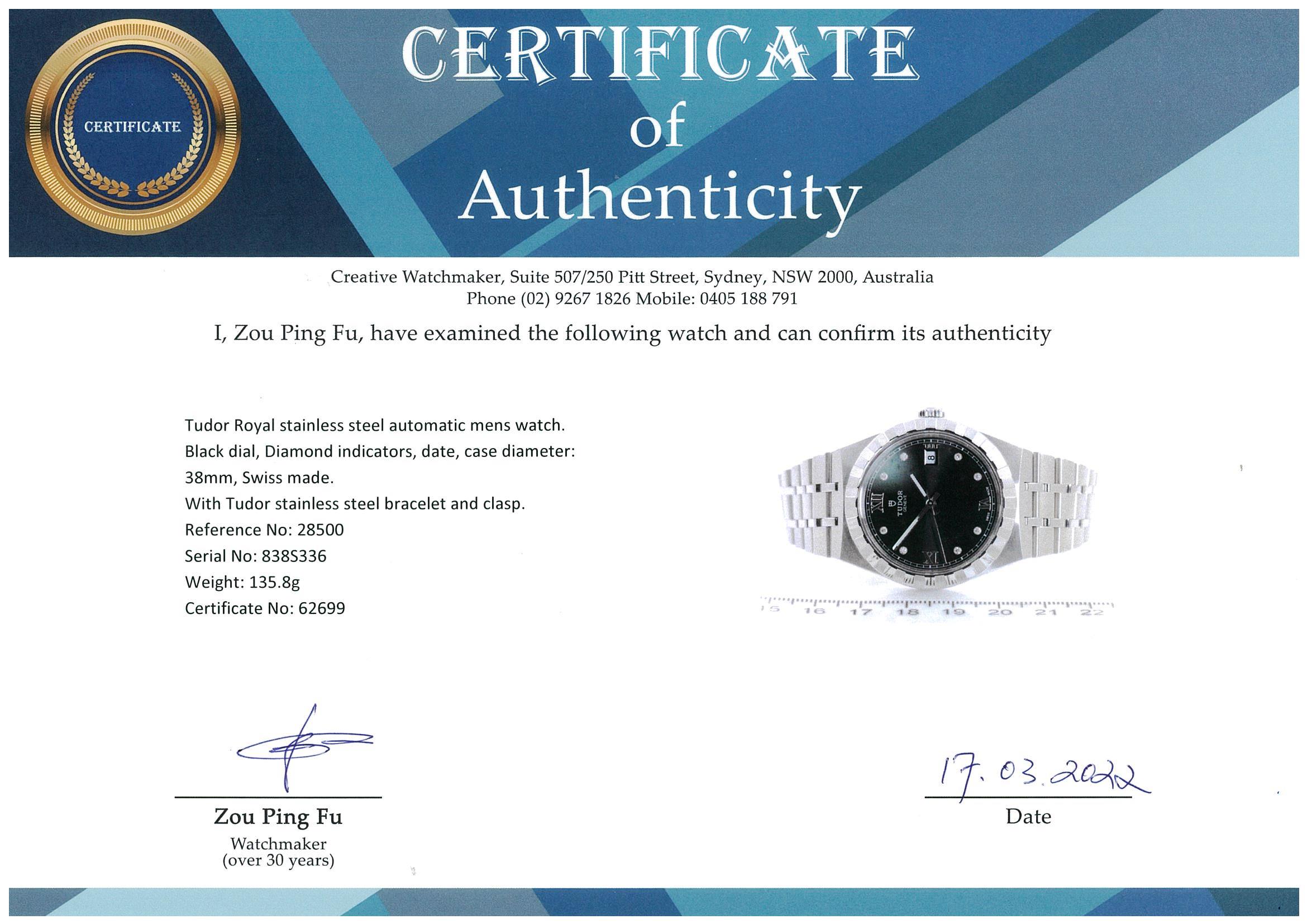 Tudor Royal stainless steel automatic mens watch. Black dial, Diamond indicators, date, case diameter: 38mm, wrist size: 19cm, Swiss made. Ref# 28500. With Tudor stainless steel bracelet and clasp. With Certificate of Authenticity, Tudor International Guarantee card dated 14/02/2022 (balance of 5 year Tudor Warranty) and Tudor box. (As New)