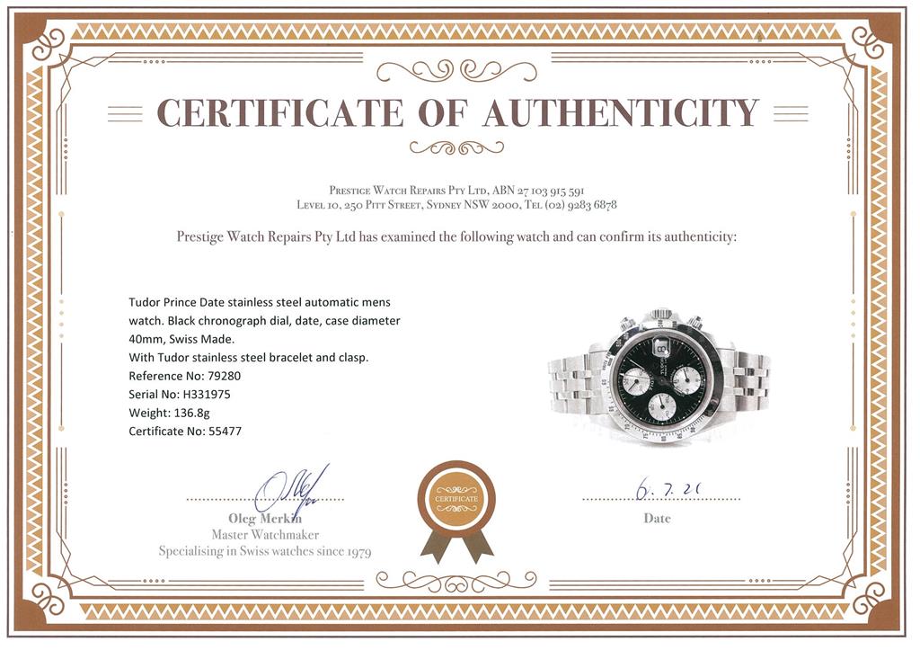 Tudor Prince Date stainless steel automatic mens watch. Black chronograph dial, date, case diameter 40mm, wrist size: 18cm, Swiss made. Ref# 79280. With Tudor stainless steel bracelet and clasp. With certificate of authenticity. 3 month FSA warranty. (Pre-owned)
