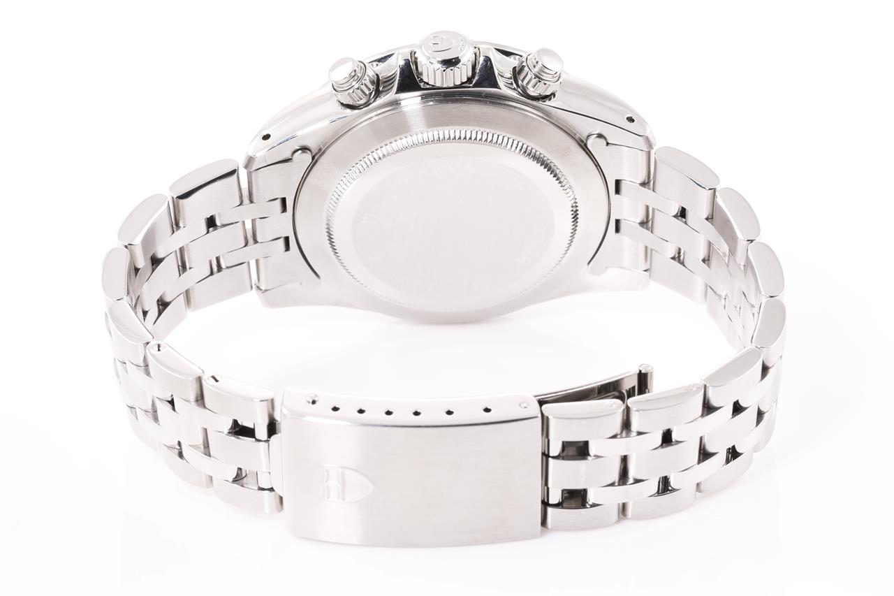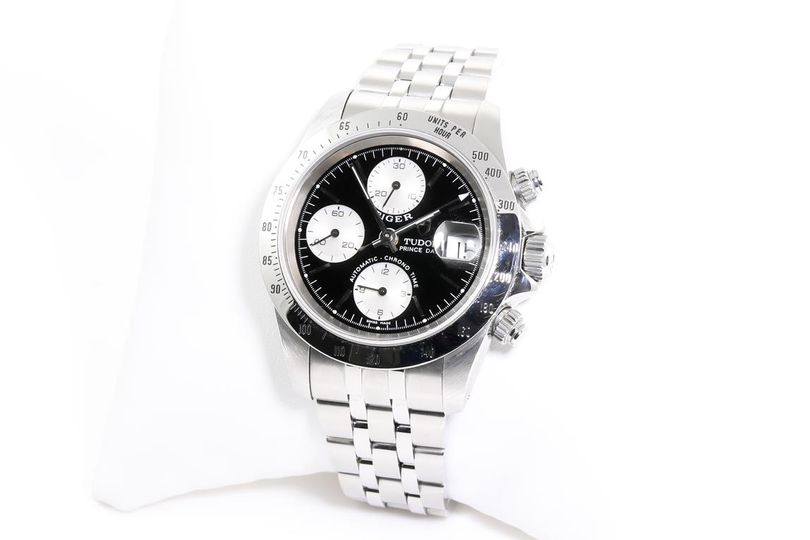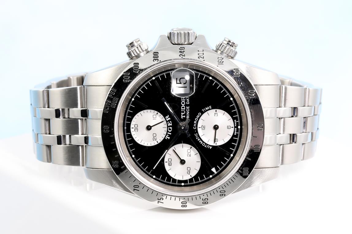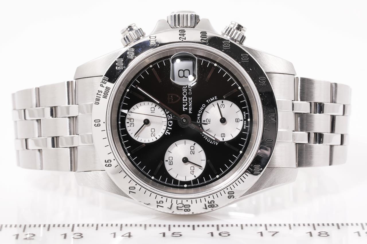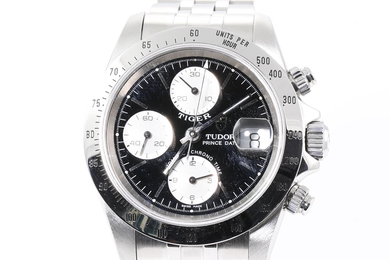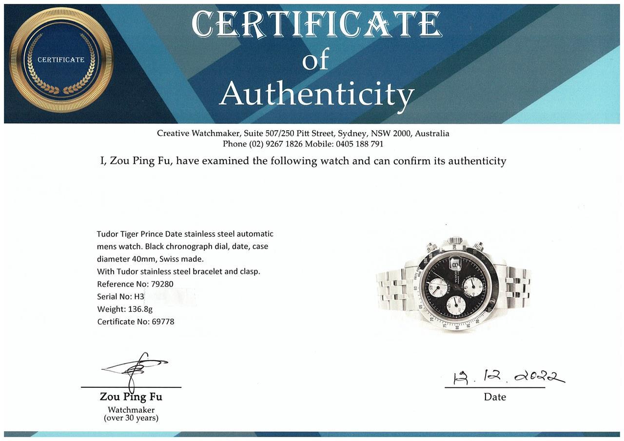 Tudor Tiger Prince Date stainless steel automatic mens watch. Black chronograph dial, date, case diameter 40mm, wrist size: 17.5cm, Swiss made. Ref# 79280. With Tudor stainless steel bracelet and clasp. With Certificate of Authenticity. 3 month FSA warranty. (Pre-owned)
