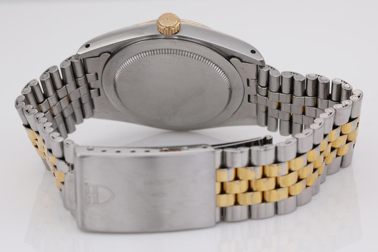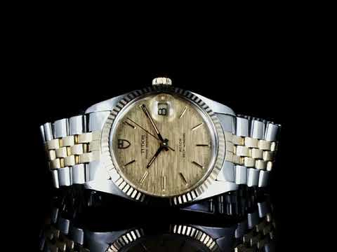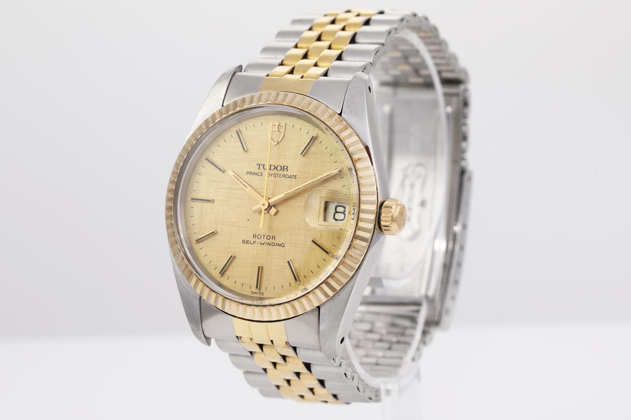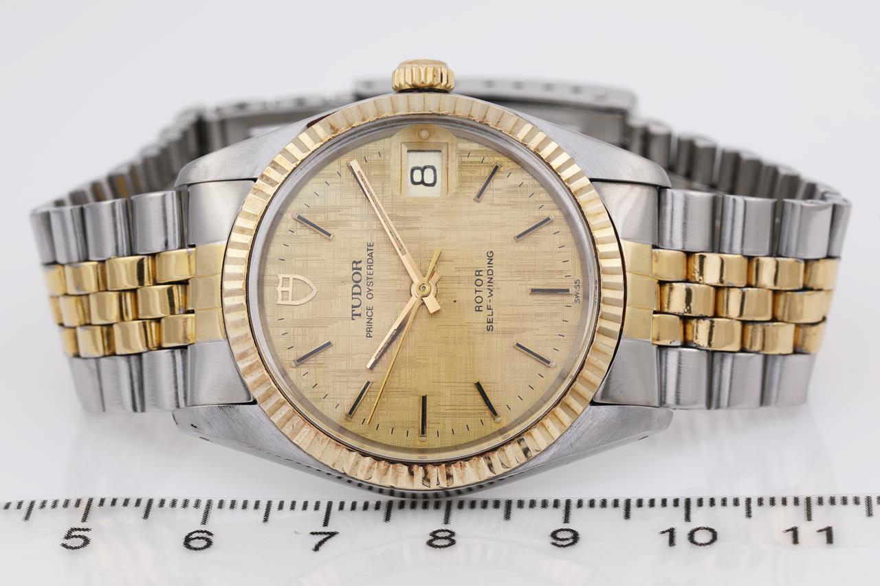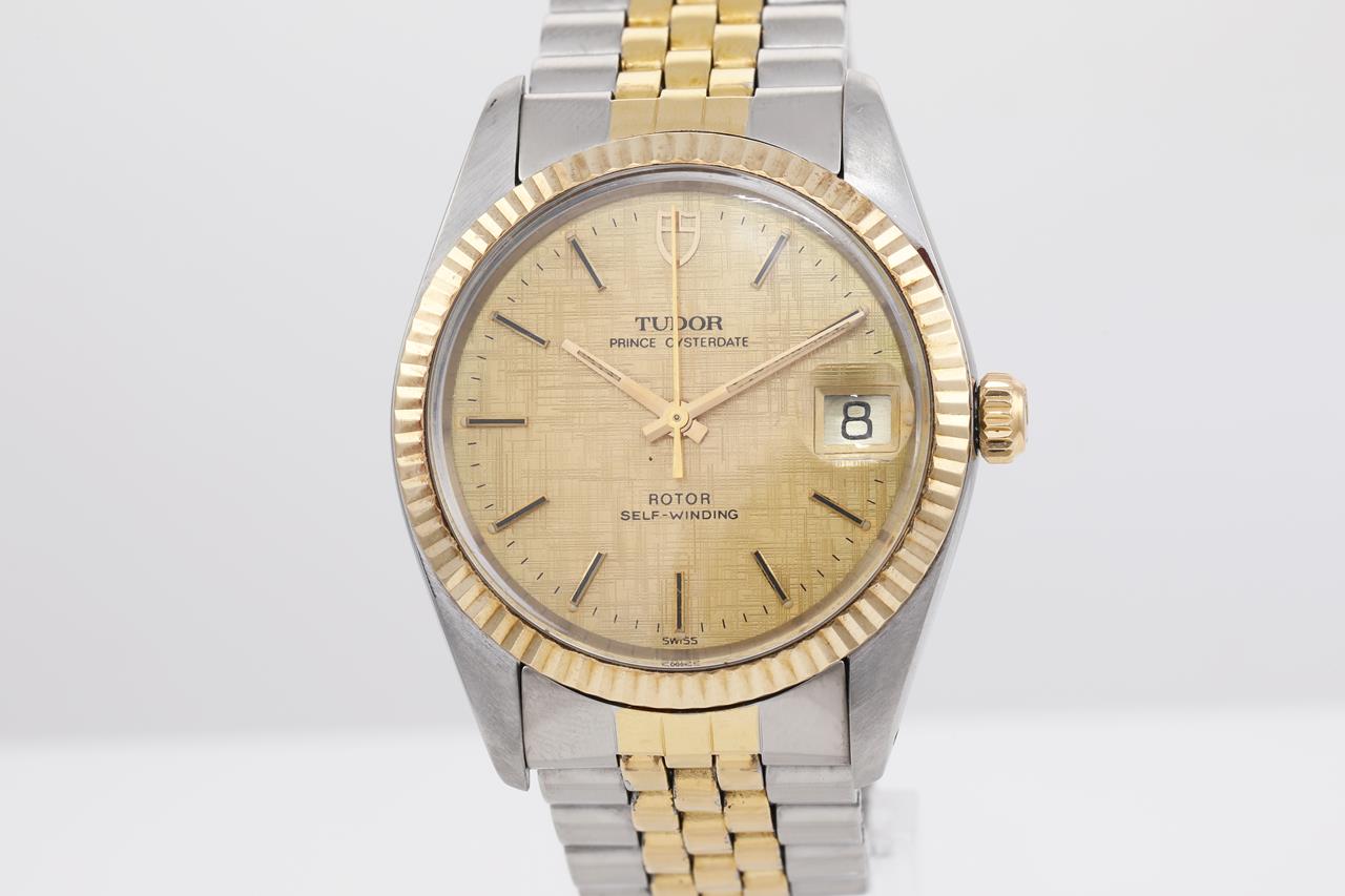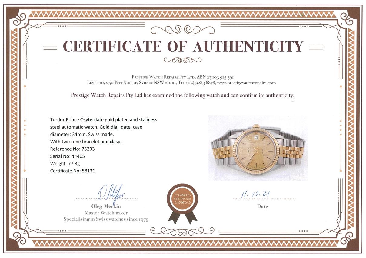 Tudor Prince Osyterdate gold plated and stainless steel automatic mens watch. Gold dial, date, case diameter: 34mm, wrist size: 17cm, Swiss made. Ref# 75203. With two tone bracelet and clasp. With certificate of authenticity. 3 month FSA warranty. (Pre-owned)