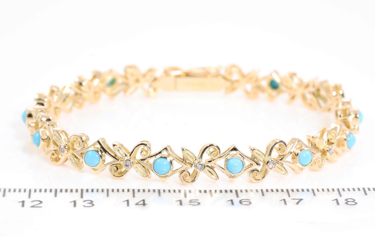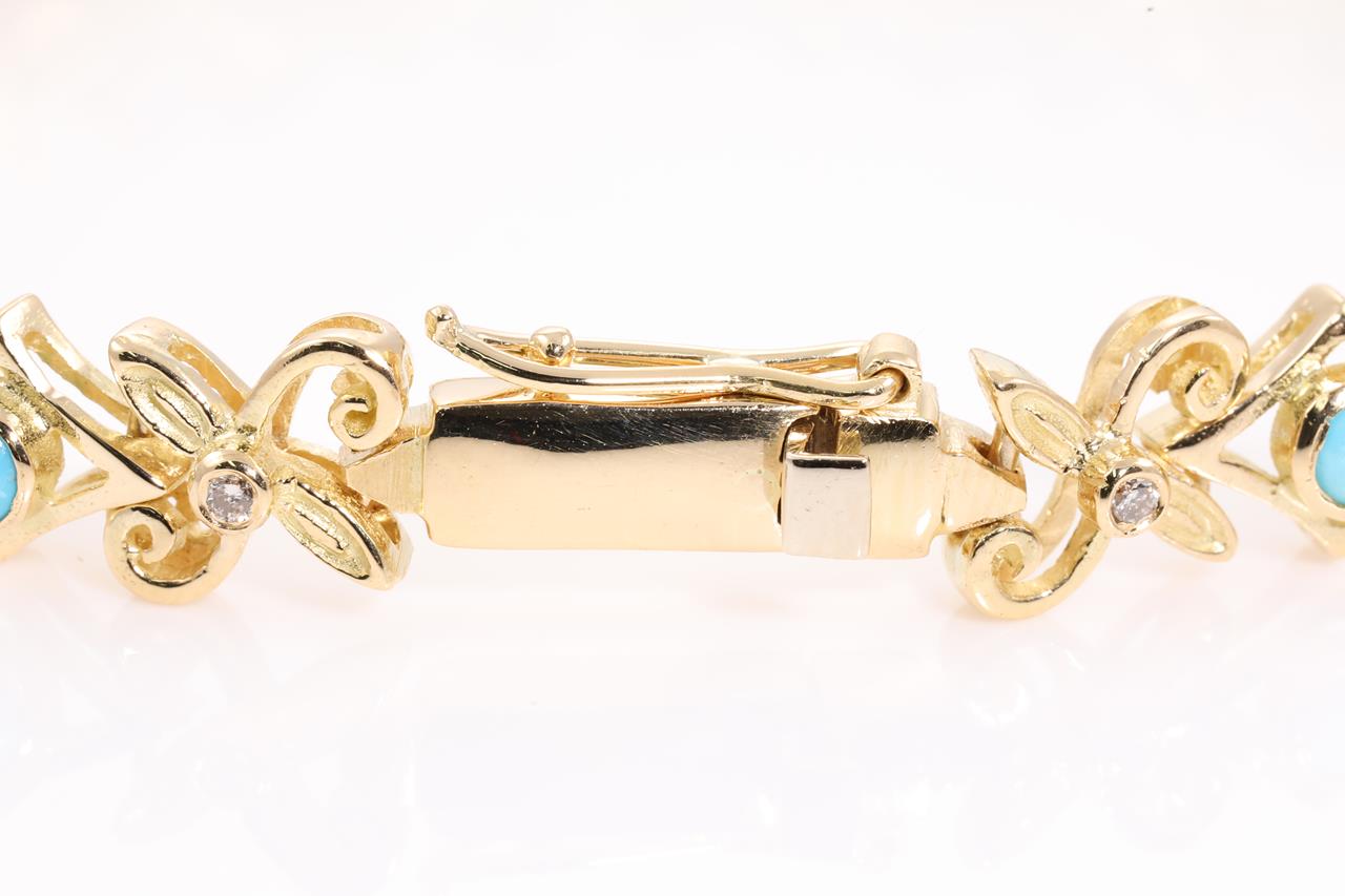 Turquoise and Diamond bracelet with round Turquoise and Diamonds totalling approximately 0.28cts. 18ct yellow gold. Length: 18.7cm. Weight: 20.7g. (Pre-owned)
