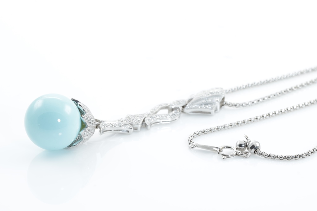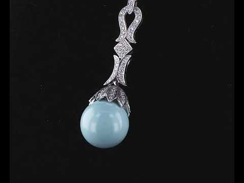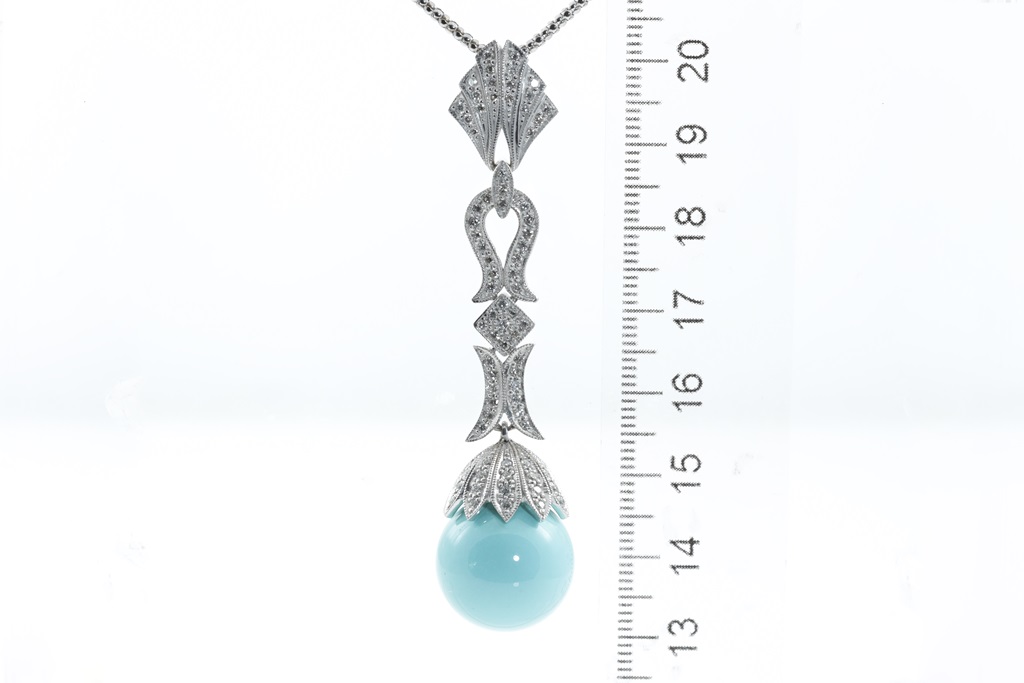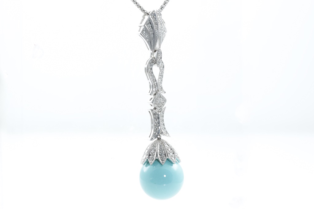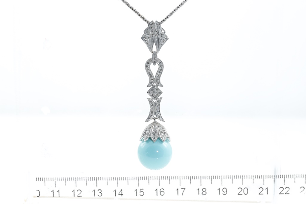 Turquoise and Diamond pendant with a spherical Turquoise of 16.60mm and round Diamonds totalling 0.84cts (Estimated grading: G-H SI). 18ct white gold with adjustable 50cm chain. Weight: 19.5g. (Pre-owned)