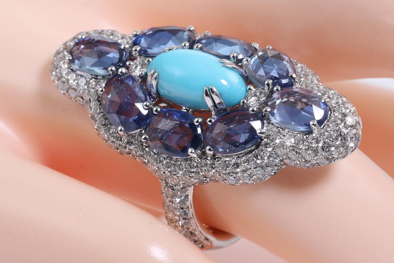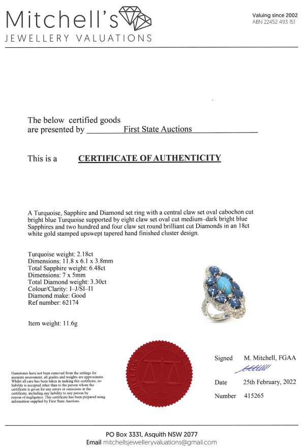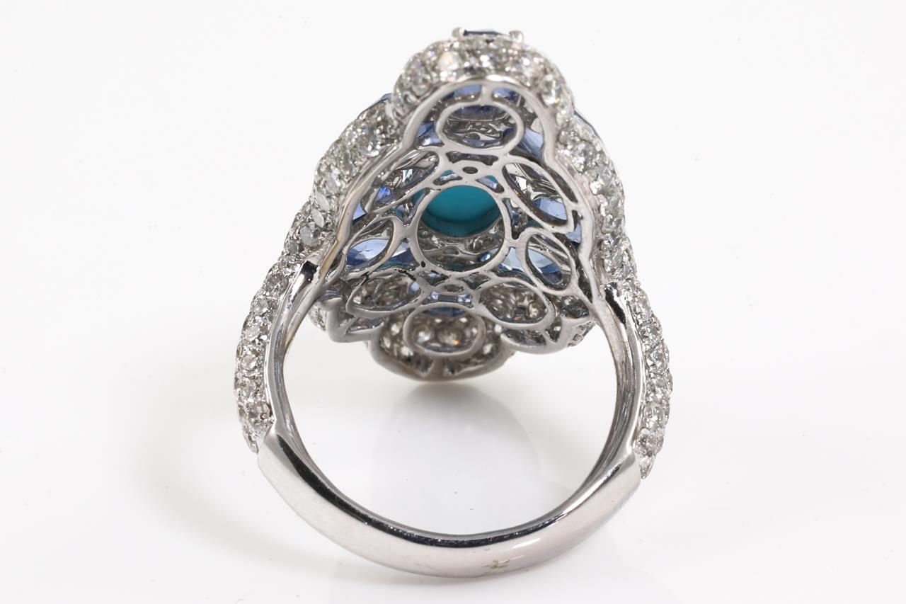 Dress ring with centre cabochon oval cut Turquoise of 2.18ct, oval blue Sapphires totalling approximately 6.48cts and round Diamonds totalling approximately 3.3cts (Estimated grading I-J SI-P1). 18ct white gold. Ring size N. Weight 11.6g. With Certificate #415265. (As New)