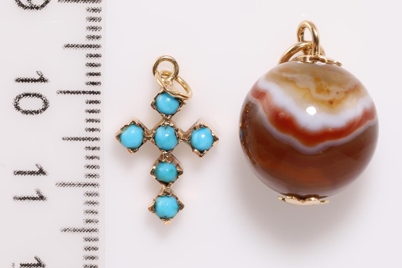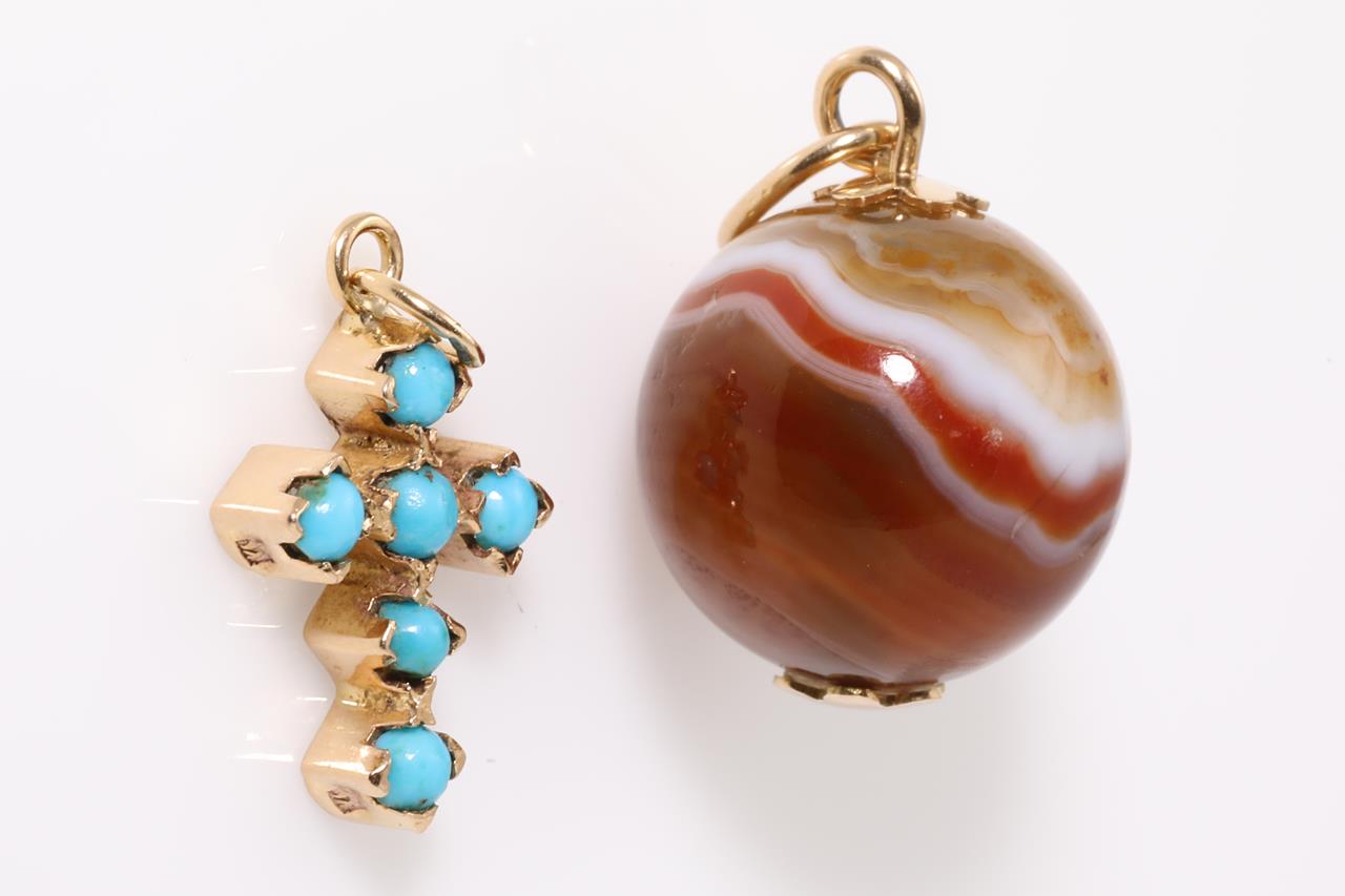 Two 18ct Gold Pendants. 1) set with turquoise cabochon beads 2) with banded Agate. No chain provided. Weight 6.0g. (Pre-owned)