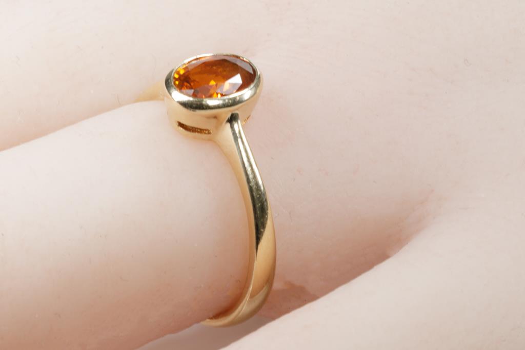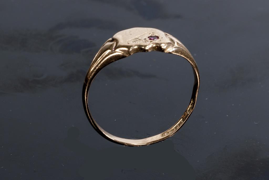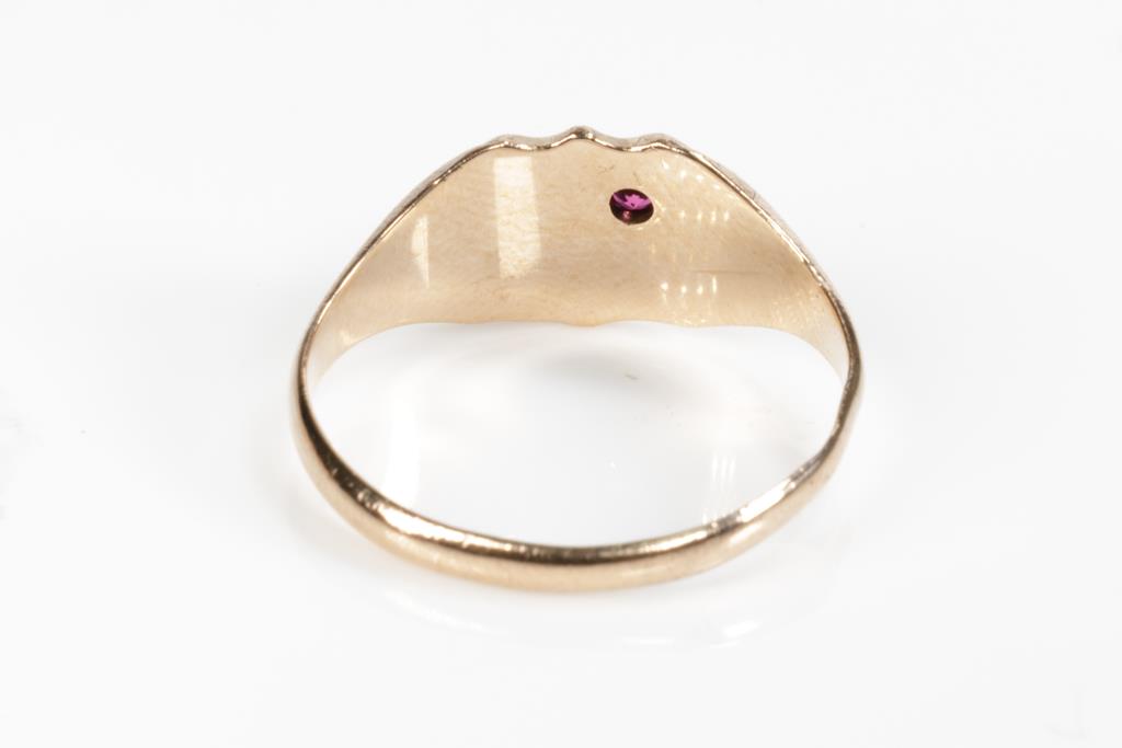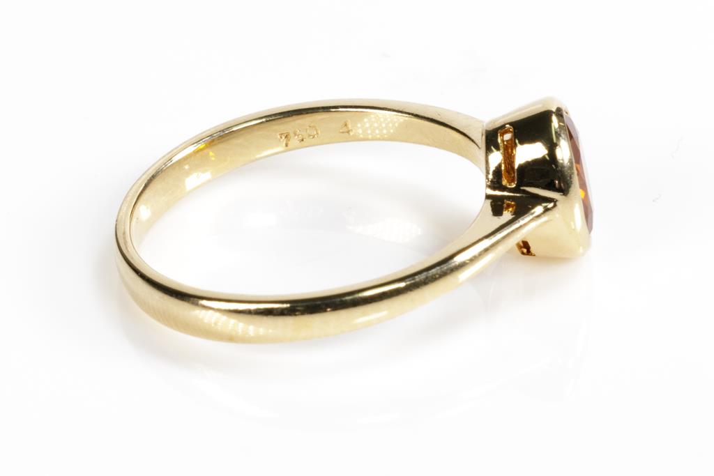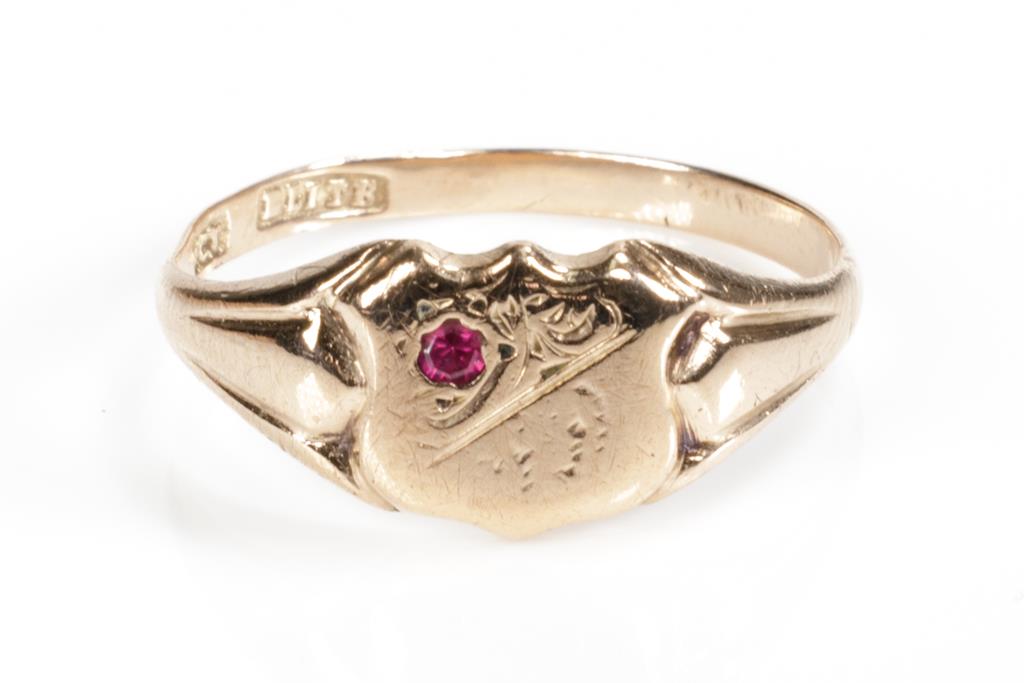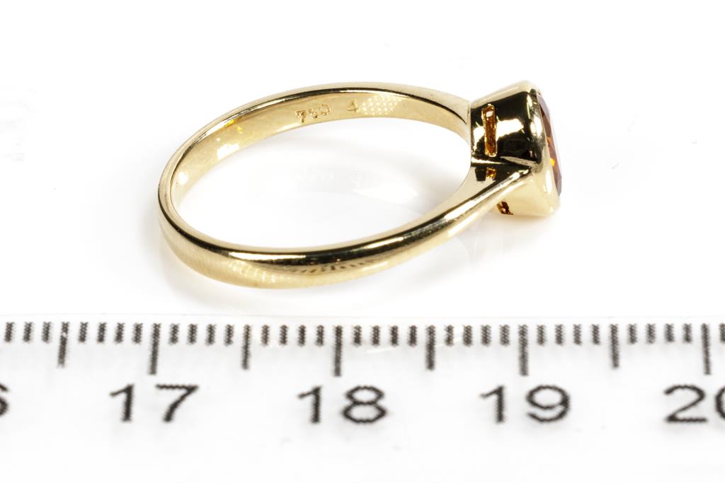 Two Gold Rings comprising a 9ct rose gold shield ring set with small Ruby and a ring with an Orange Sapphire of approximately 0.35cts. 18ct yellow gold. Ring size P, N. Weight combined 5.6g. (Pre-owned)