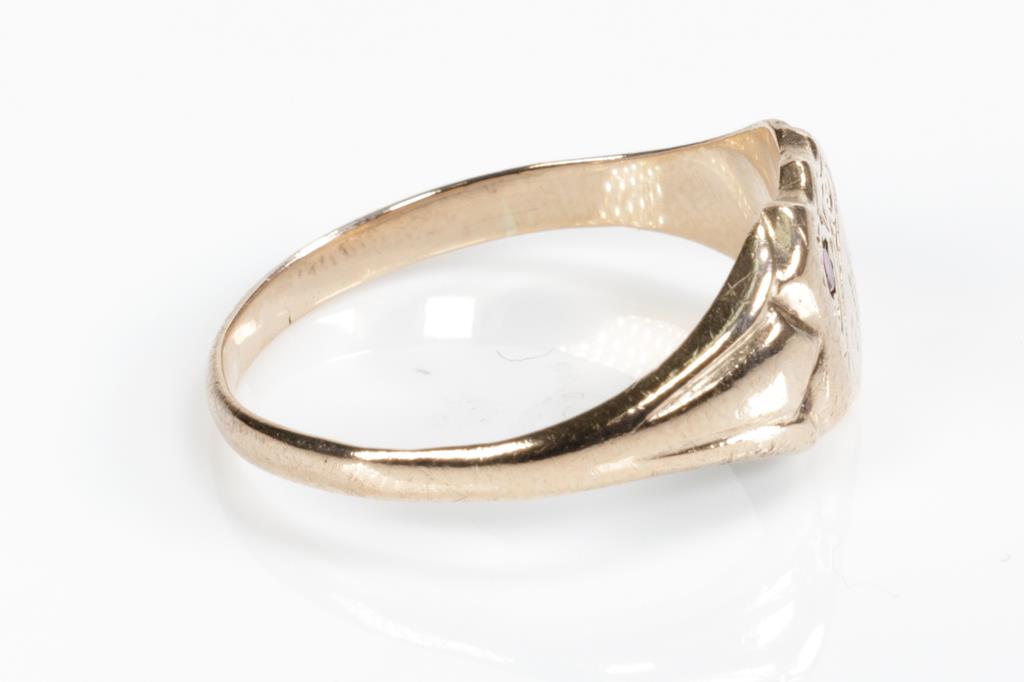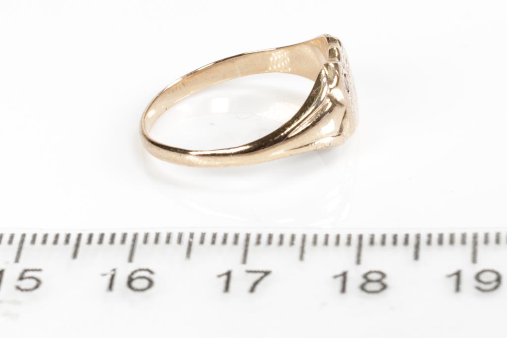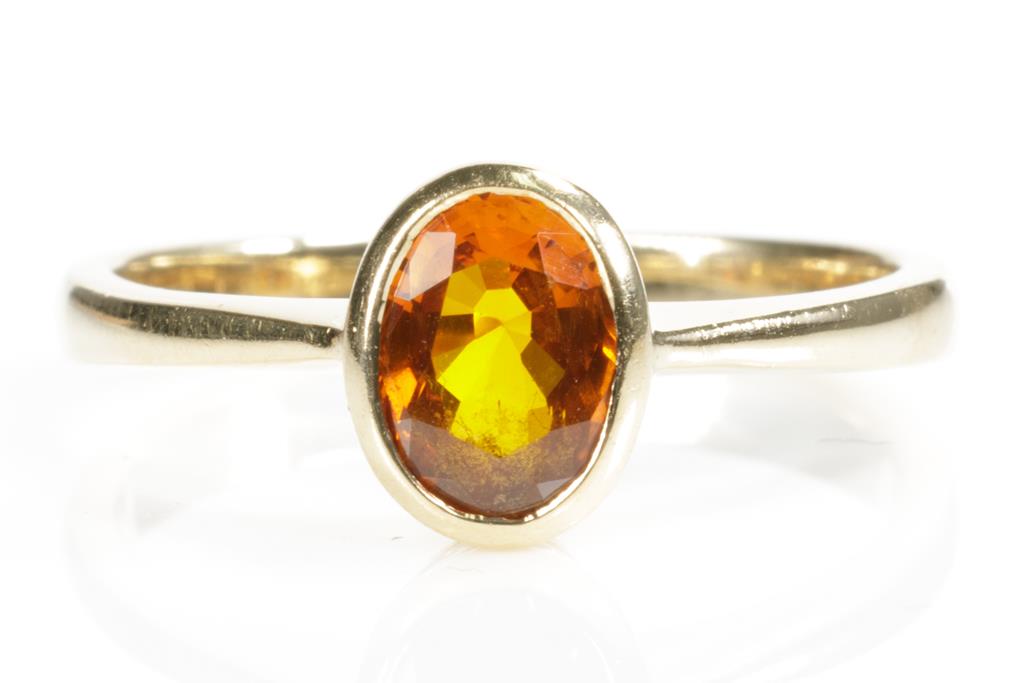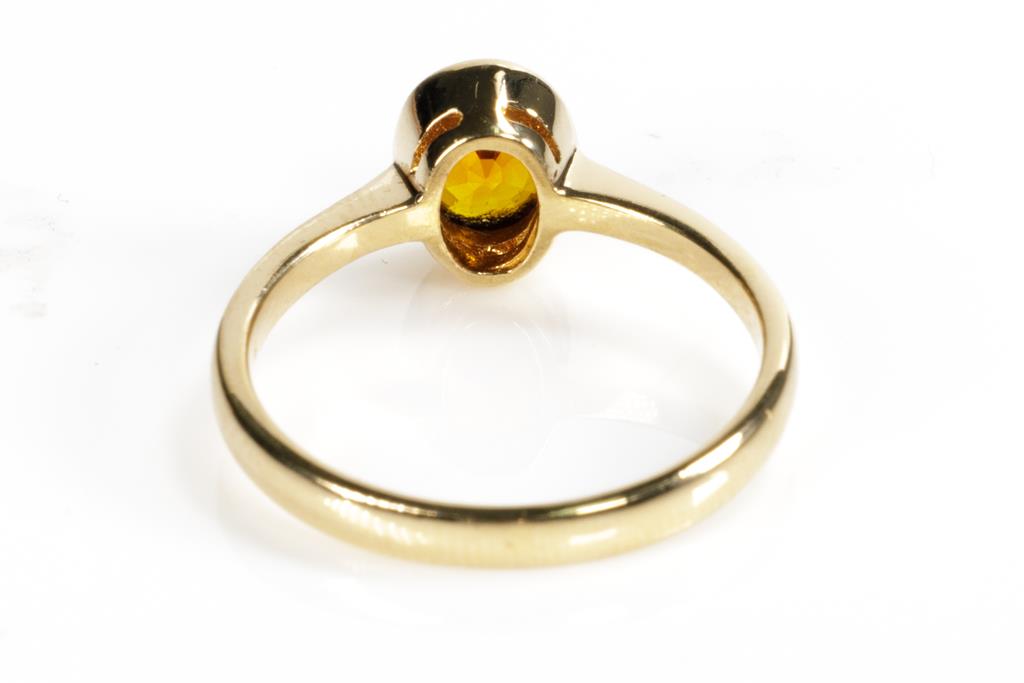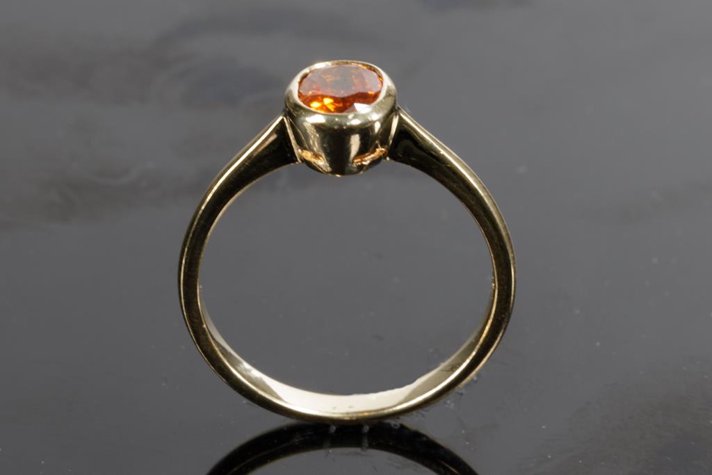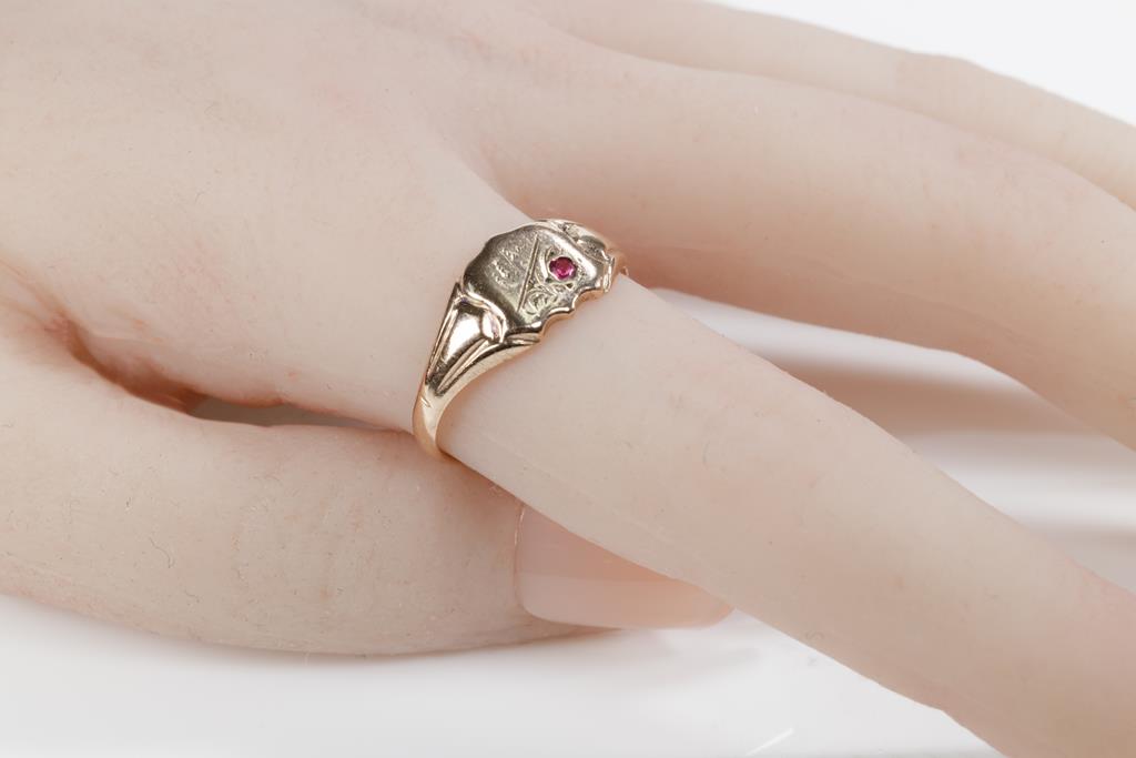 Two Gold Rings comprising a 9ct rose gold shield ring set with small Ruby and a ring with an Orange Sapphire of approximately 0.35cts. 18ct yellow gold. Ring size P, N. Weight combined 5.6g. (Pre-owned)