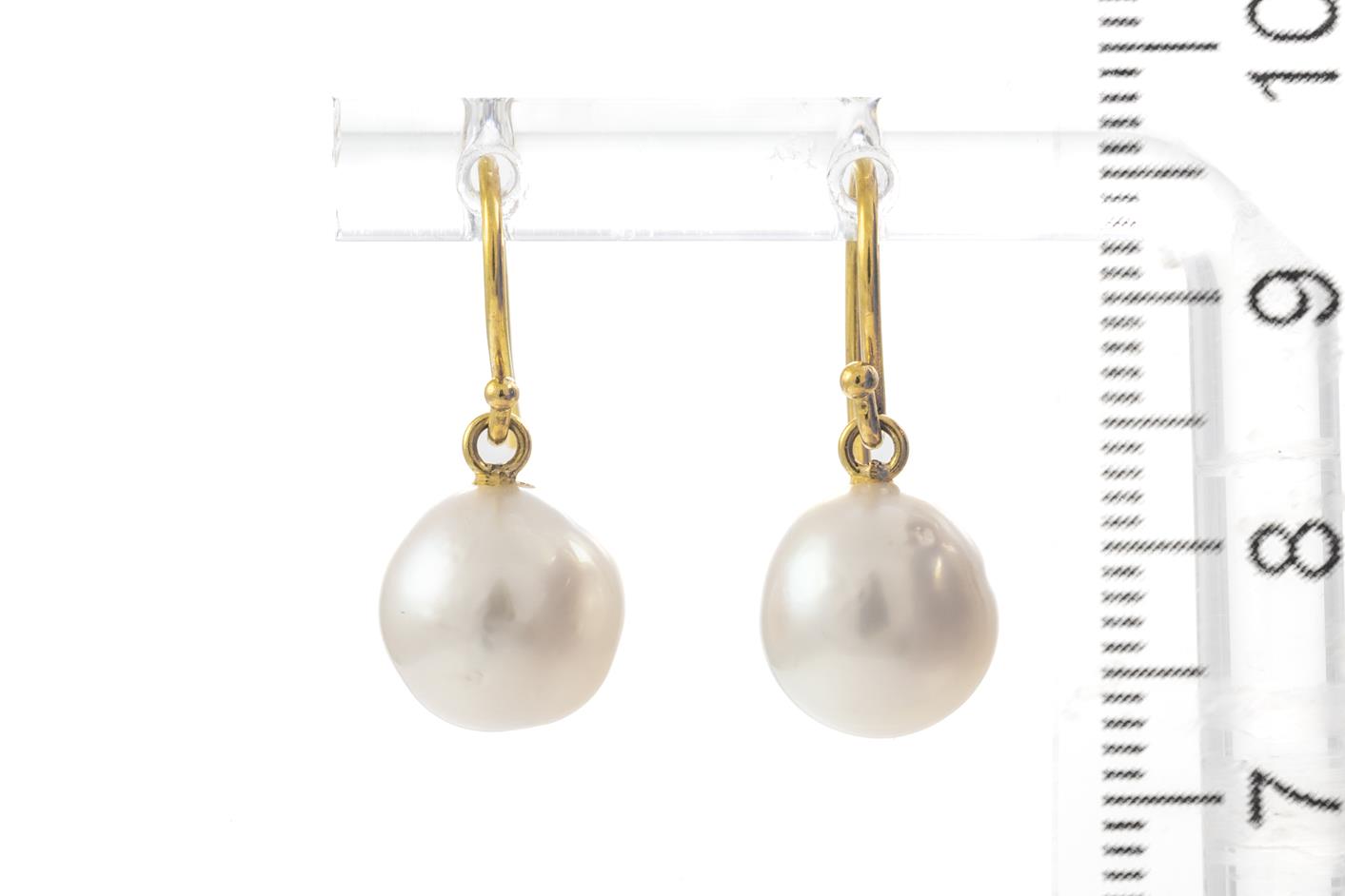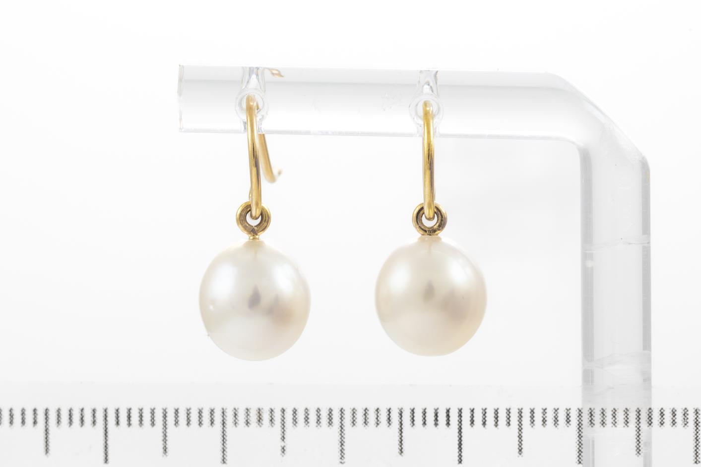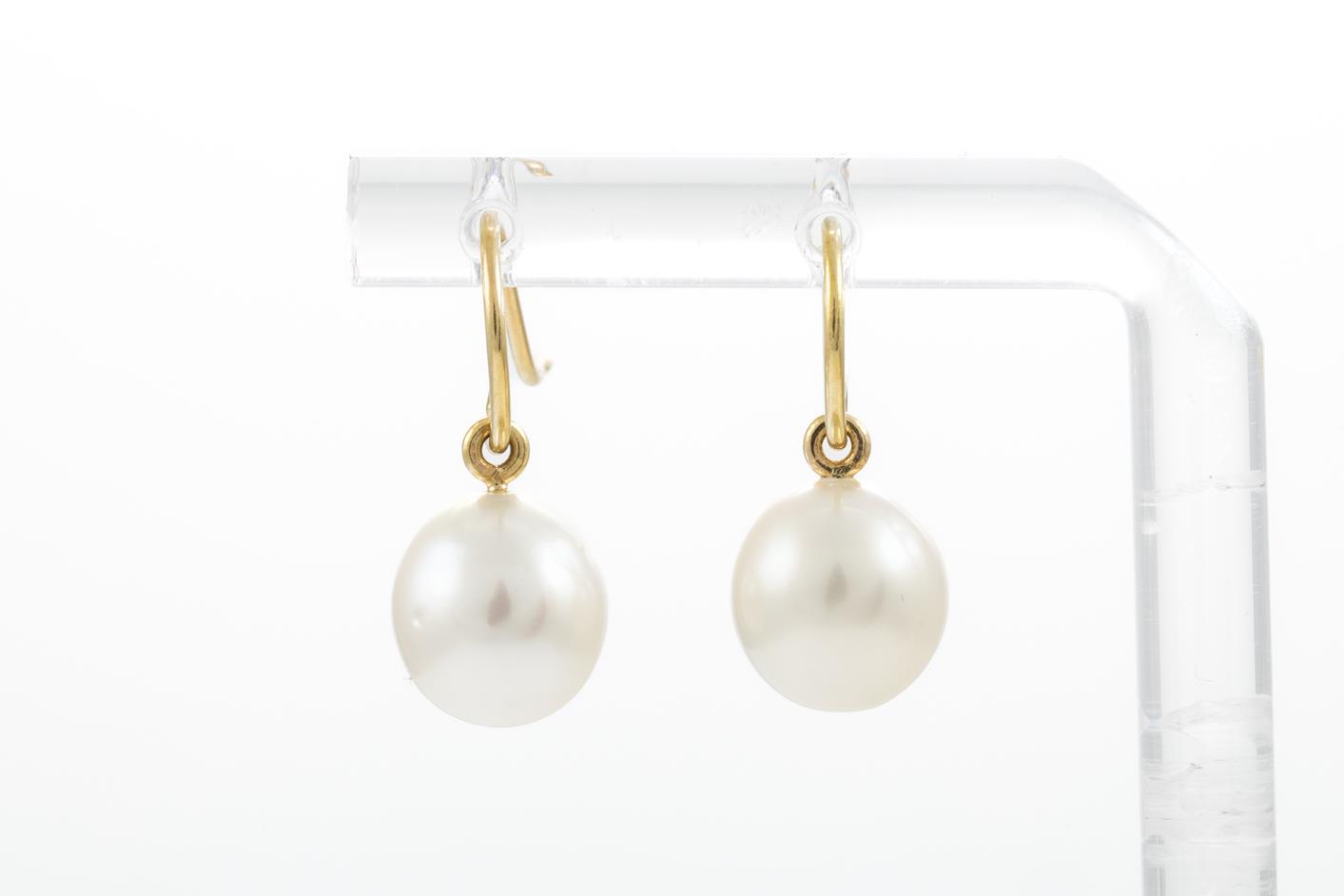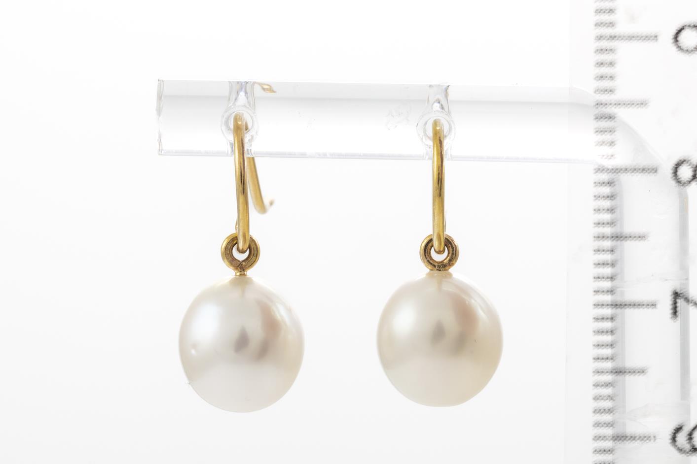 Two Pairs of Drop Pearl Earrings with South Sea Pearls of 9-10mm, 18ct yellow gold. Weight 7.3g. With Valuation certificate (for one pair only). (Pre-owned)
