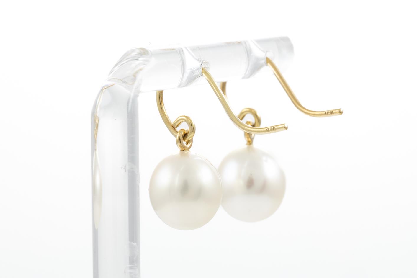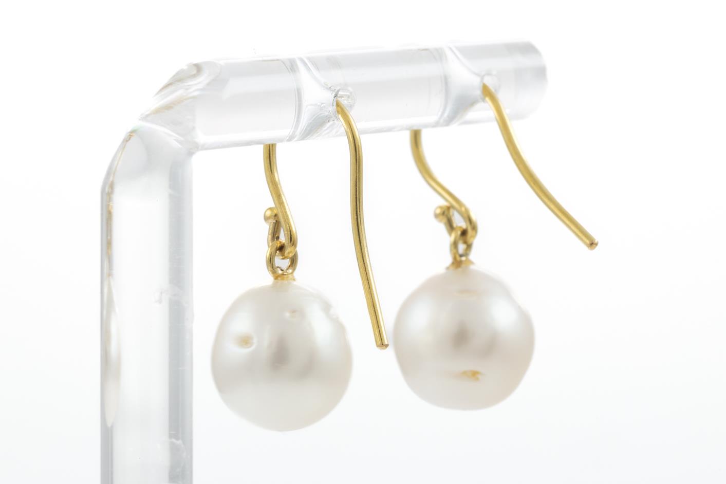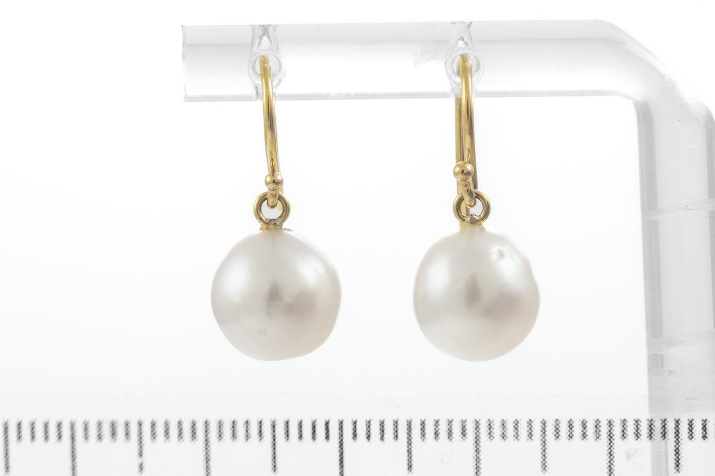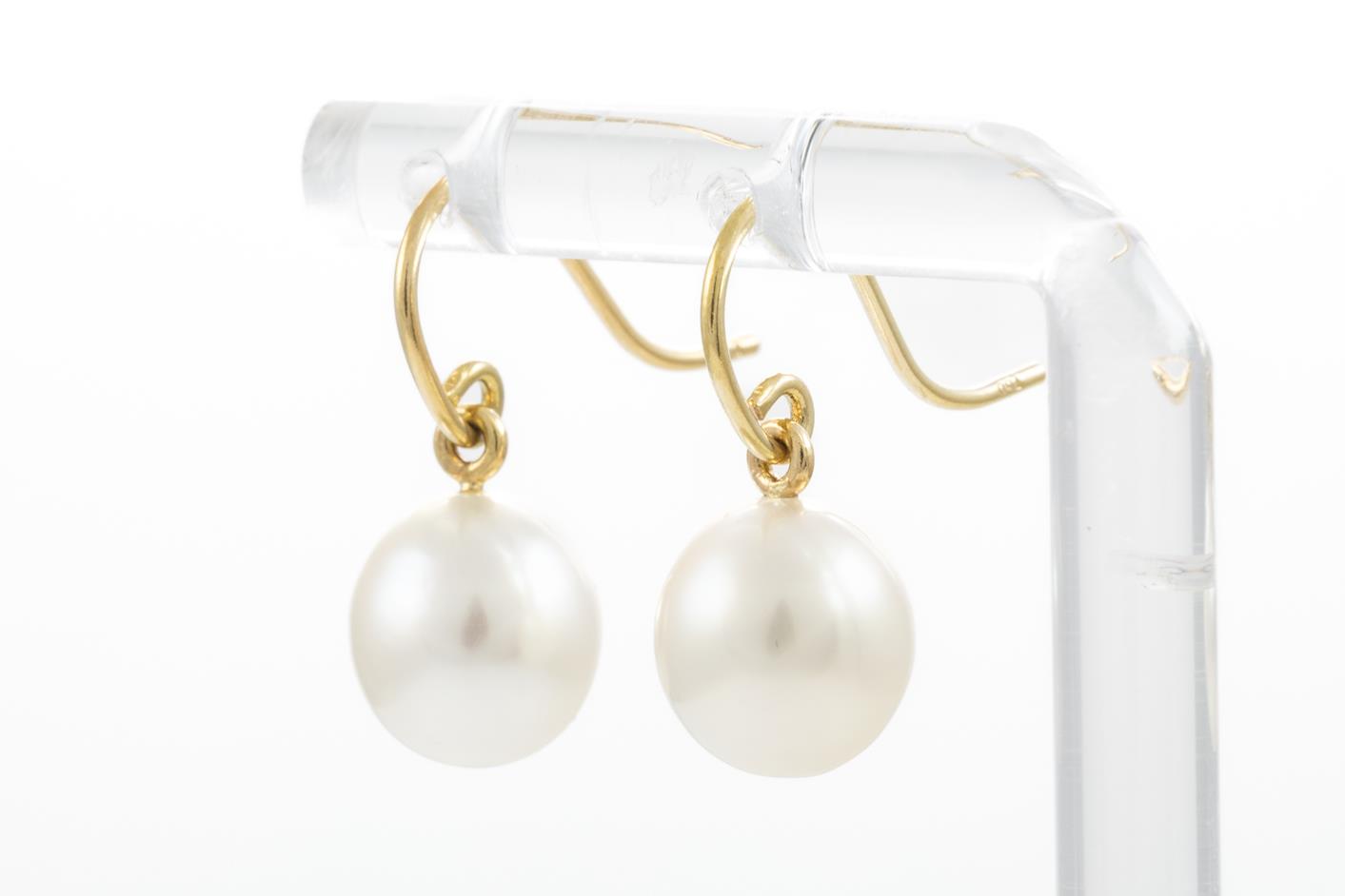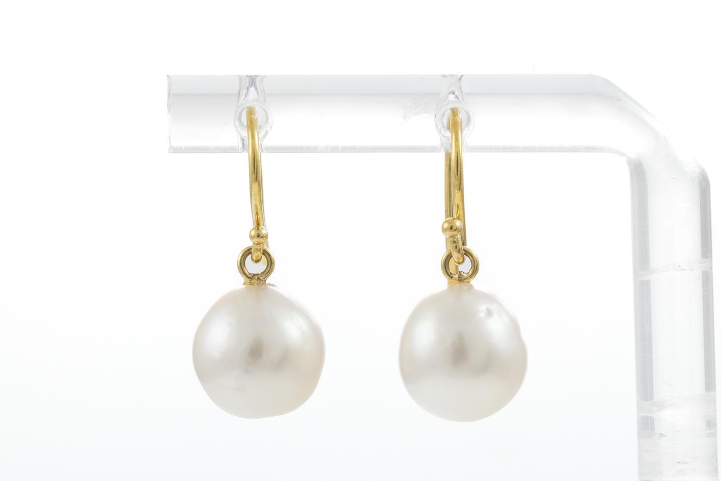 Two Pairs of Drop Pearl Earrings with South Sea Pearls of 9-10mm, 18ct yellow gold. Weight 7.3g. With Valuation certificate (for one pair only). (Pre-owned)