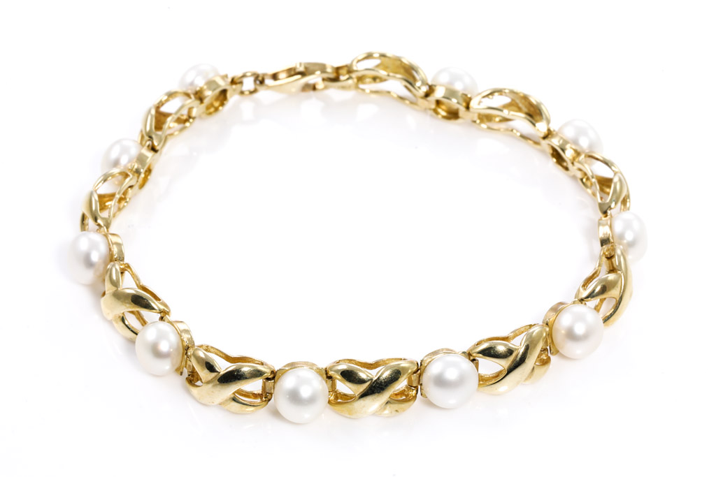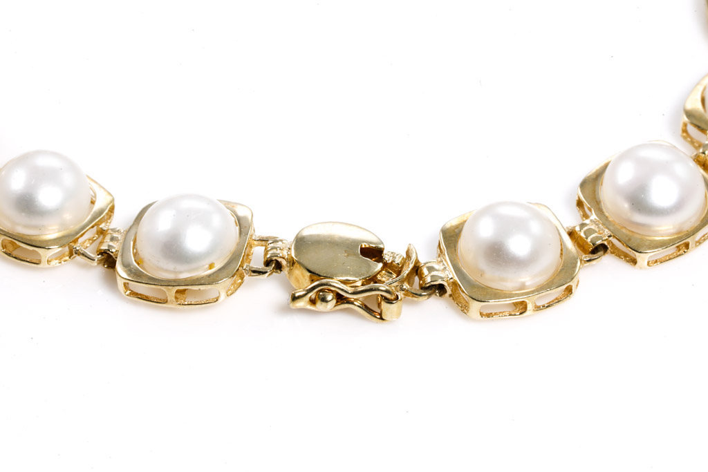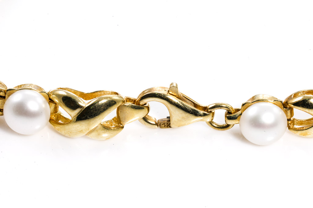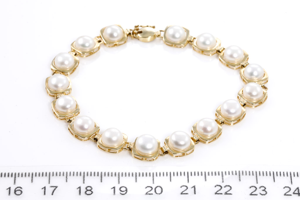 Two Pearl Bracelets with button freshwater Pearls of approximately 6.4-6.5mm. 14ct yellow gold. Length 17.5-18cm. Weight combined 23.8g. (Pre-owned)