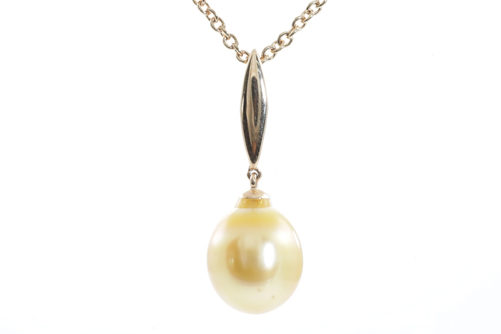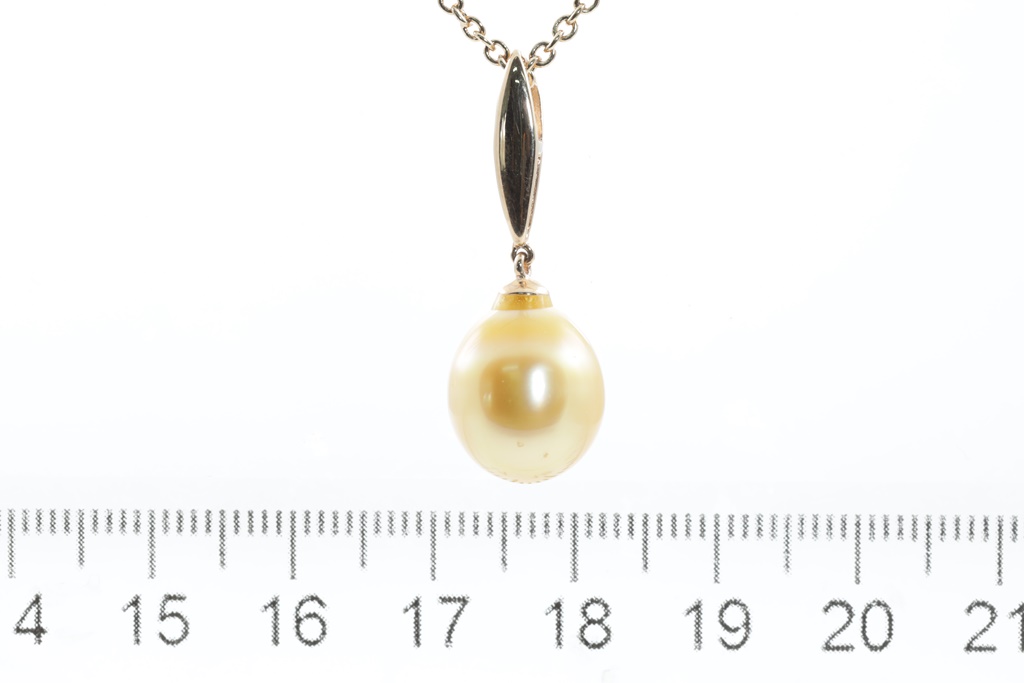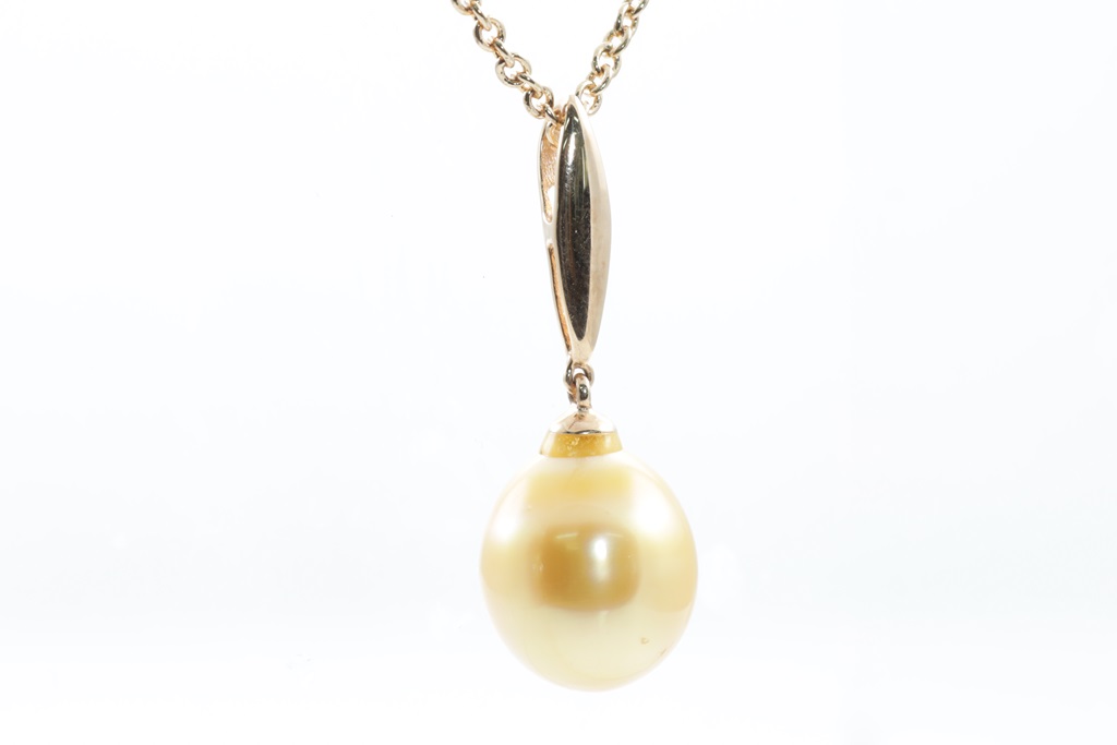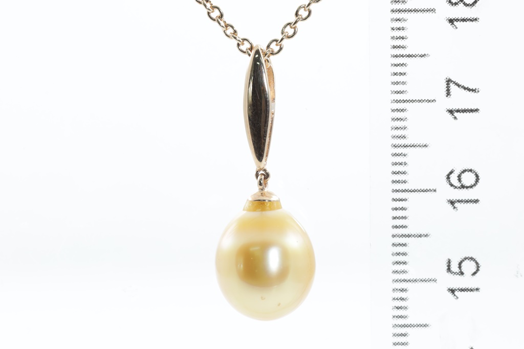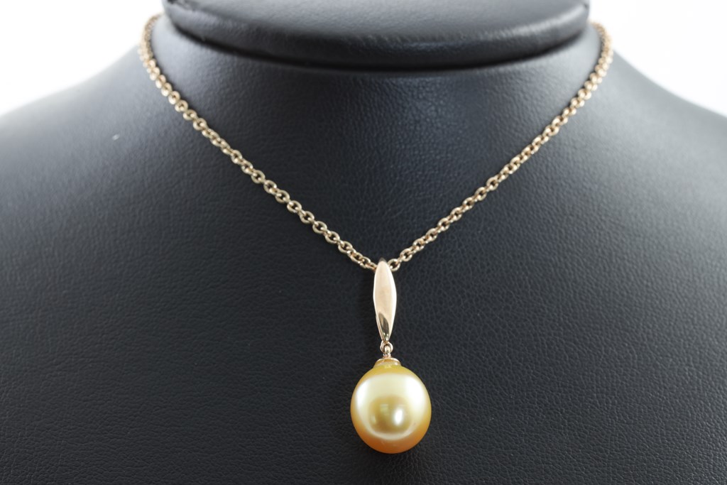 Two Pearl Pendants, with Golden South sea Pearls of 11mm - 11.2mm, 14ct white gold, 14ct rose gold. Weight 5.4g -pendants only. Both on display chain (metal base). (As New)