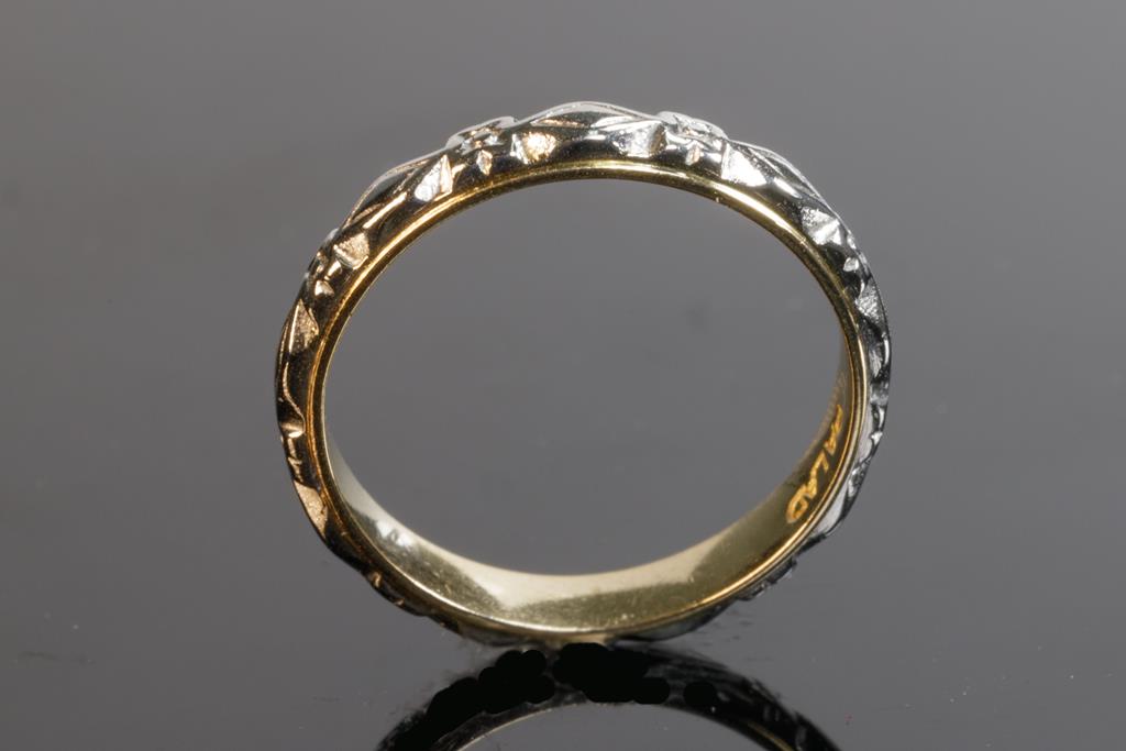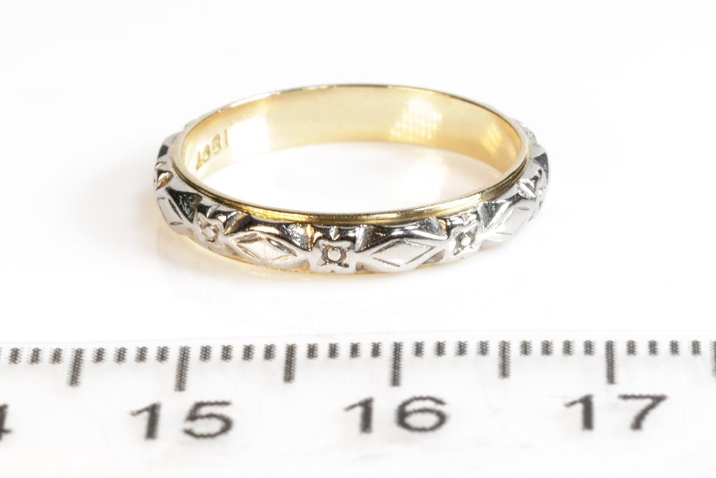 Two wedding rings. 18ct yellow gold and palladium. Ring sizes L 1/2, N. Combined weight 5.8g. (Pre-owned)